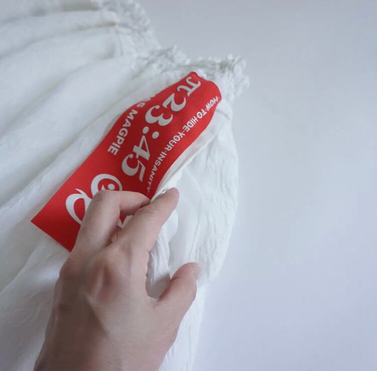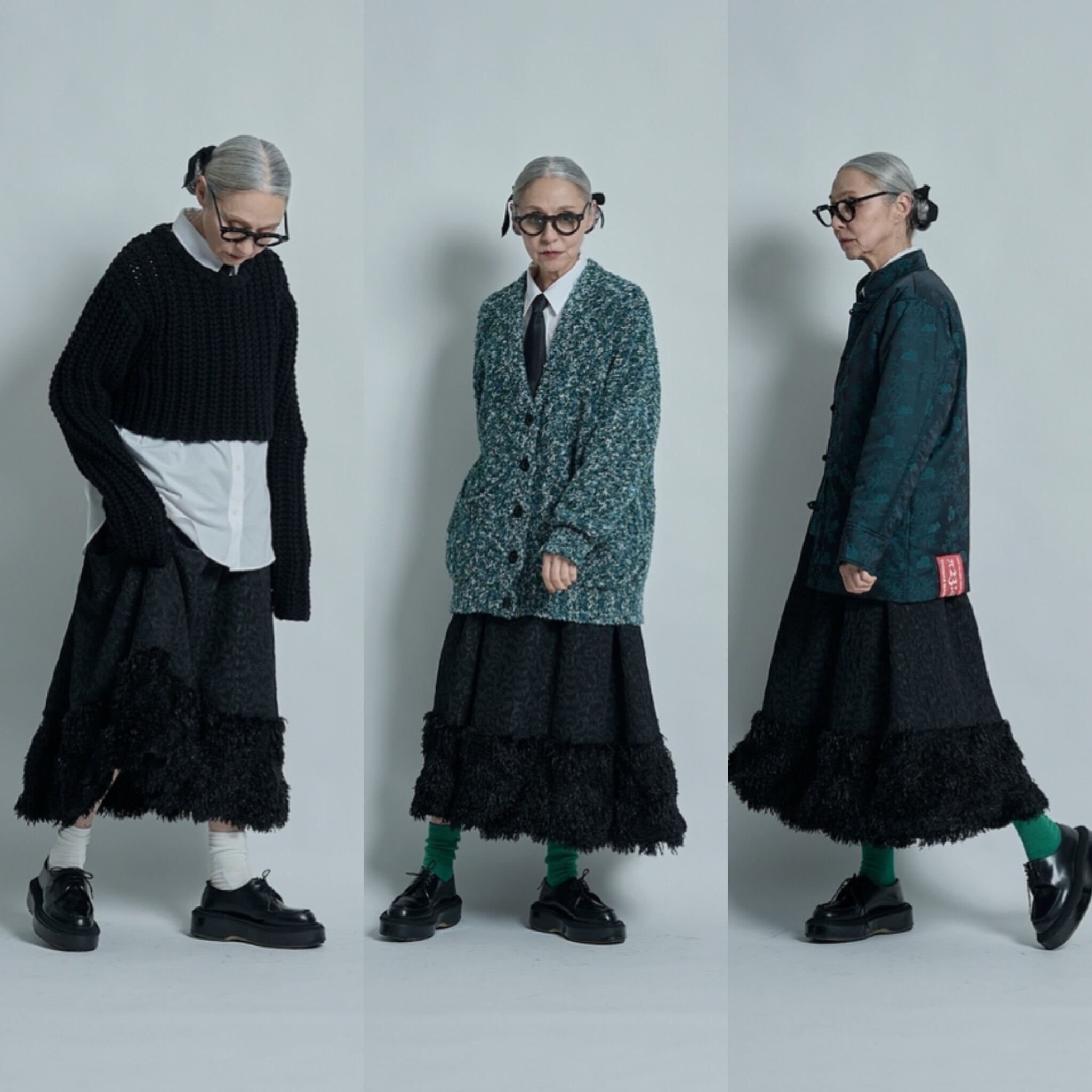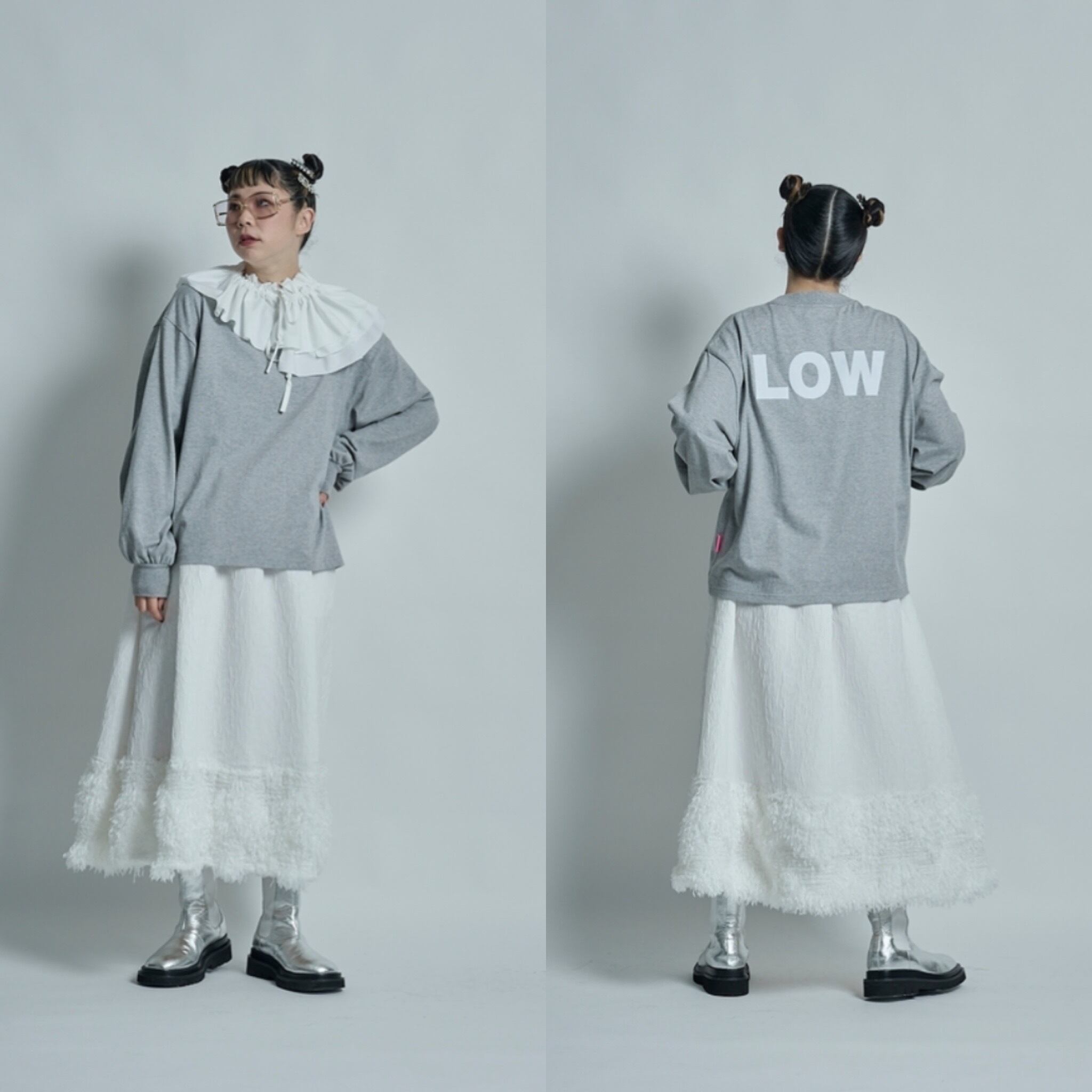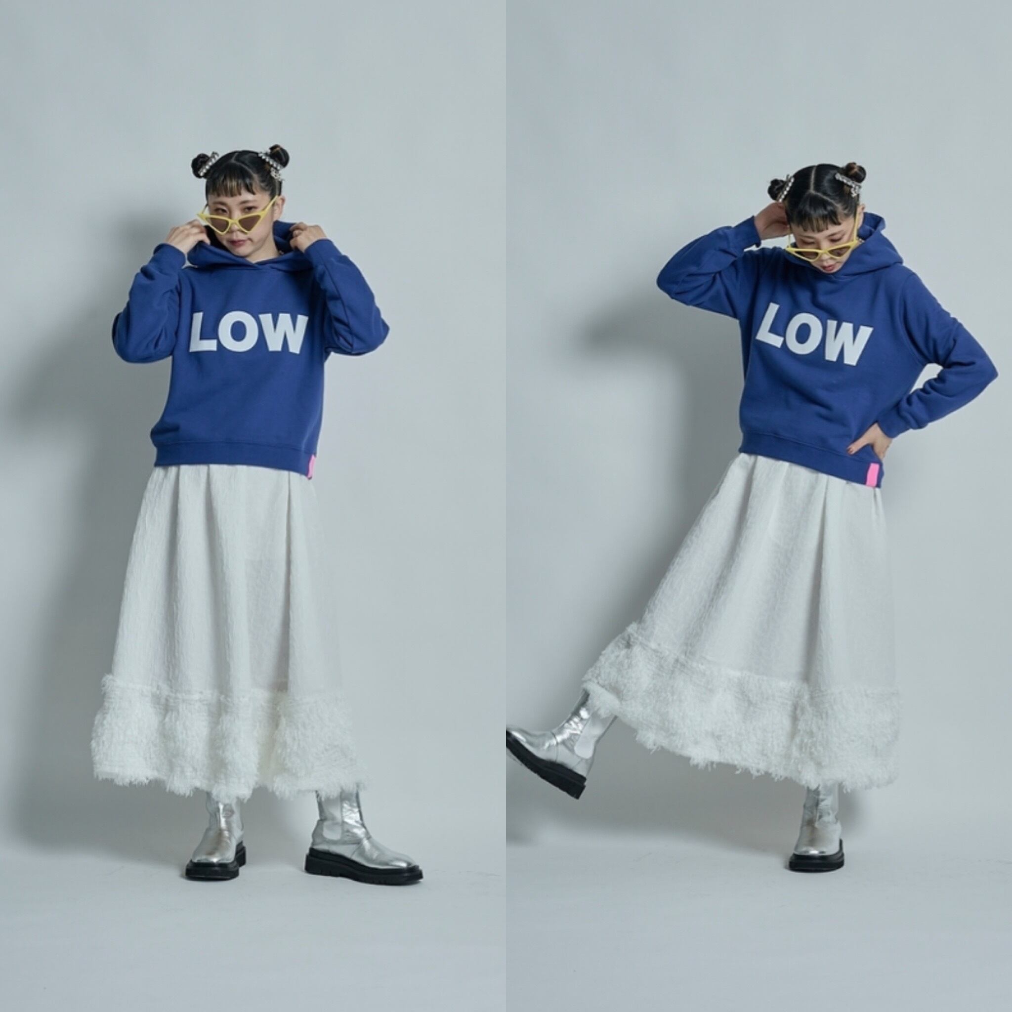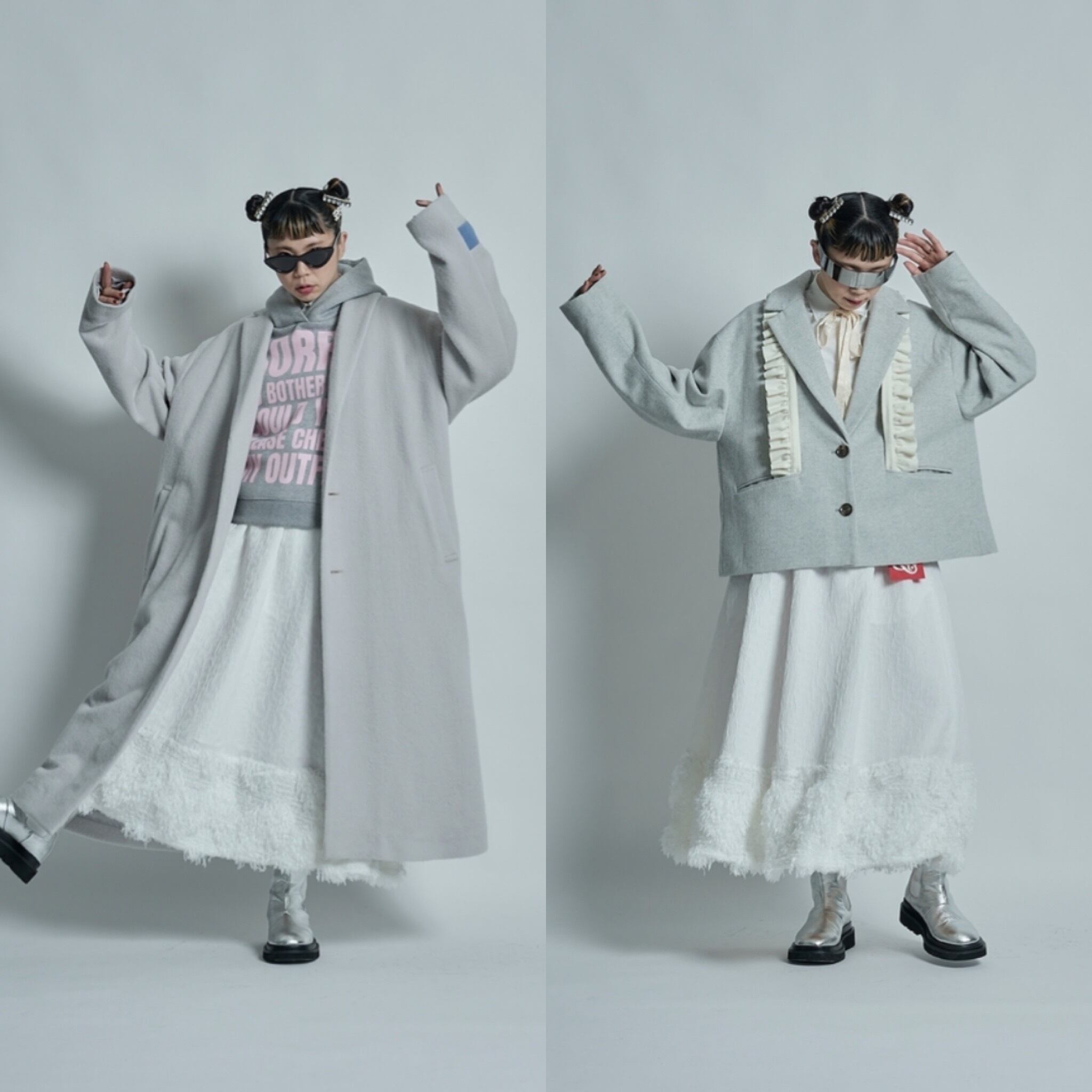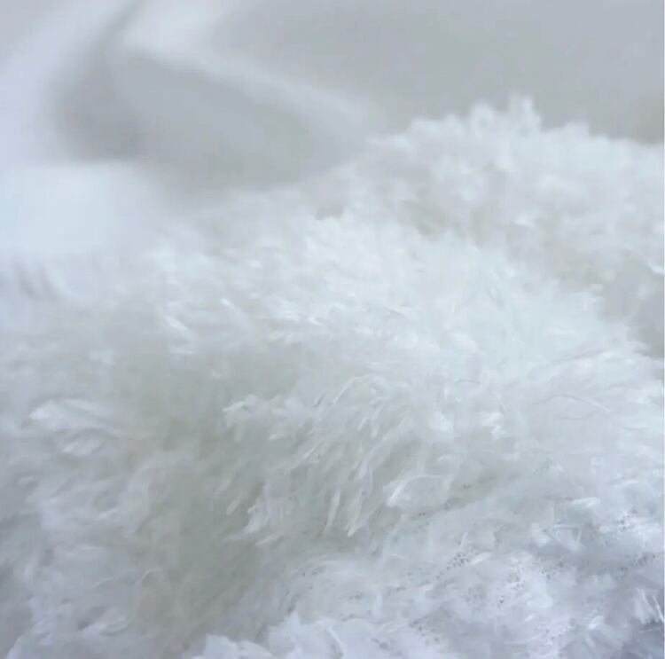コレクションのデザインを始めるときに、まず最初にテーマカラーと、どのような物を作っていきたいかを考えます。次に素材集め、ロゴのテーマ、アイテムの絞り込みを行なっていきます。今回のテーマはスポーツアイテムにチャレンジしたのでジャージー素材を探していきました。その次に、全体のテーマとして、これまであまり使って来なかった、表面変化のある素材、凹凸、フェザーなど。ニットもかなり変化のある物にしたくて、オリジナルの編み地にチャレンジしたり、全体的に表面変化にこだわるラインナップにしています。中でも、今回のこのスカートは、動きのあるフェイクフェザーを裾にたっぷりとつけ、加工されている凸凹のあるジャガード生地とドッキングさせたスカートで、全体のコレクションの中でも、表面変化のある素材同士で私の決めた最初のテーマに沿ったアイテムと言えます。今回は積極的に生地のピックアップを行い、生地からデザインを考えてきました。変化のある素材で今までに既存のブランドイメージにない、新しさを探し素材選びに注力しました。このスカートの良さは、今までにはない重みのあるフェザーをつけたシルエットです。裾にフェザーを付けたので綺麗な台形のシルエットが出ます。そのシルエットがとても綺麗で、とにかく本当に合わせやすい。カタログのルックを作る時に、色々なトップスに合わせられてとても便利でした。ウエストはゴムで、とても着やすく、サイズに幅がありどんな体型の方にも合いやすくなっています。華やかではありますが、扱いがしやすいポリエステル素材です。フェザー部分は多少抜けが見られますが、密集している為、多少抜けても全く目立ちません。このフェザーに見える部分もポリエステルの糸で毛羽立ちの表現をしており、珍しさがあるかと思います。お洗濯はドライクリーニングですが、自宅で優しくドライ用洗剤で手洗い可能です。どちらもポリエステル素材なのでとても扱いがしやすい素材です。秋冬に沢山着てもらいたい、とても楽しめるユースフルなスカートです。ブラックが使いやすくてリッチなイメージ。高級メゾンのコレクションのような雰囲気があります。ホワイトはかなり真っ白なカラーですが、冬のホワイトコーディネートに可愛さが増してスノーホワイトのイメージでとてもフレッシュさがあります。ホワイトは難易度が少し高くなるかもしれません。どちらもお勧めですが、ブラックはとにかく使いやすいと思います。私の今回の一押しアイテムです。
