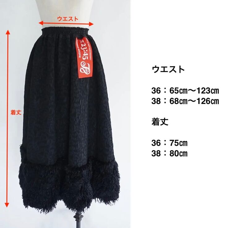 サイズは2サイズ。38の大きいサイズは5cm丈が長くなります。ウエストサイズと同時に着丈も考慮してサイズ選びをお願いします。