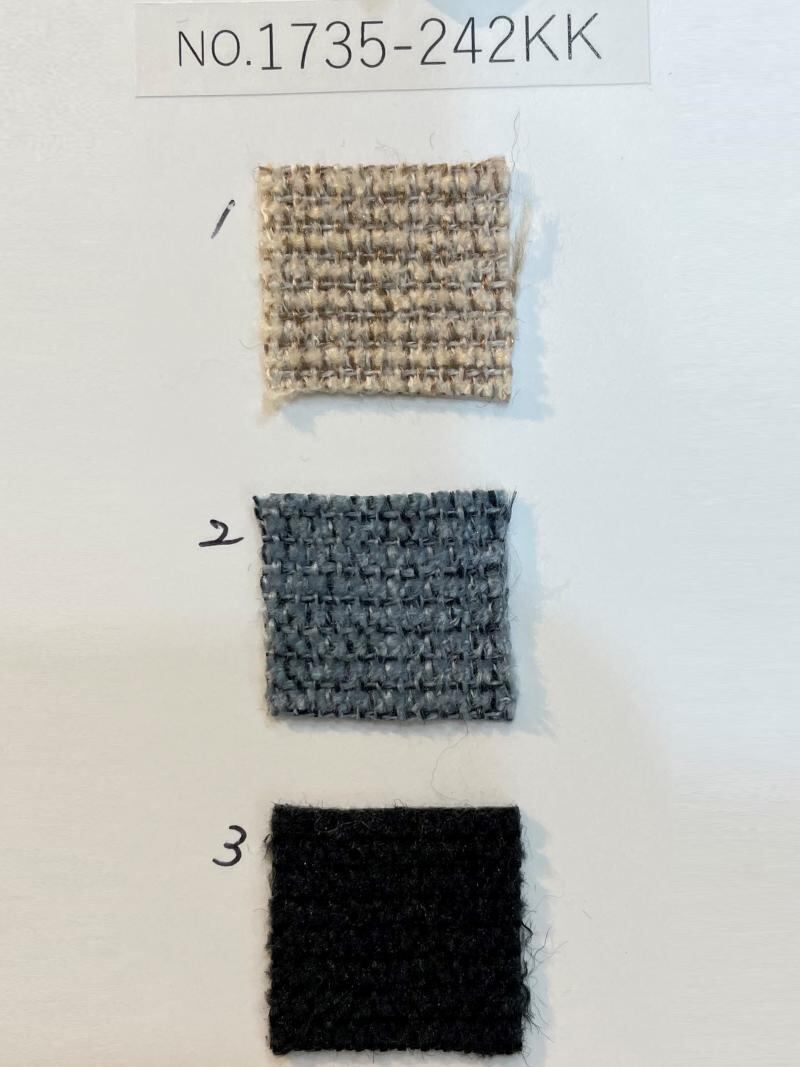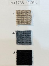 太番手のモールタッチの糸と、フラットな細番手の表情の違う糸を一緒に織り込んでいるので、ツイードの様な表面感が特徴の素材を使用しています。