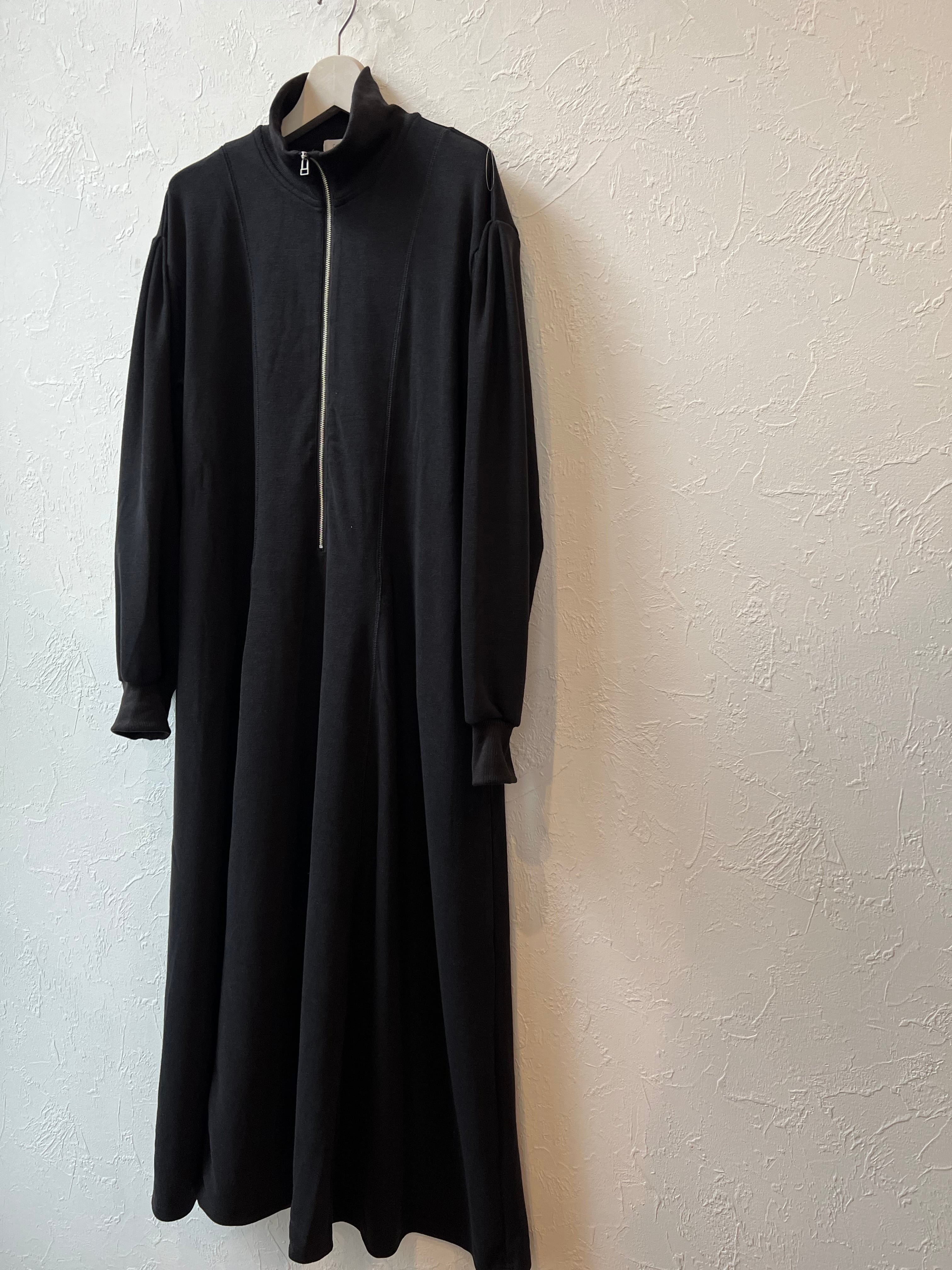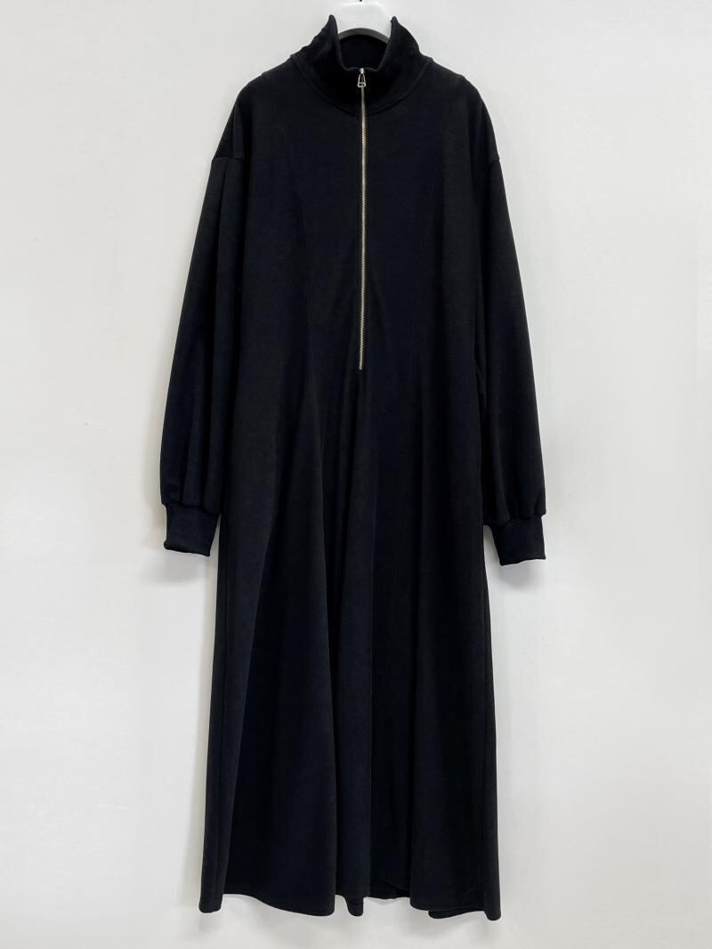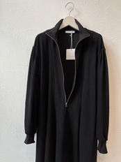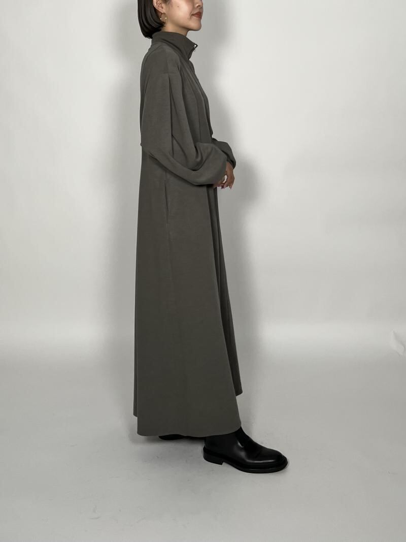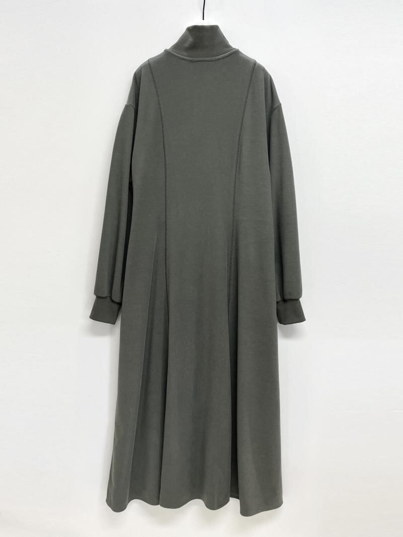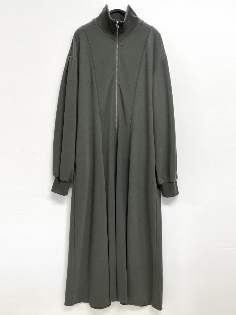 ウエスト下から裾に向かってキレイなフレアシルエットが出るようなパターンにしています。ハーフZIPでスポーティな印象ですが、素材の落ち感とパターンで、程よく大人で、女性らしいワンピースに仕上げています。