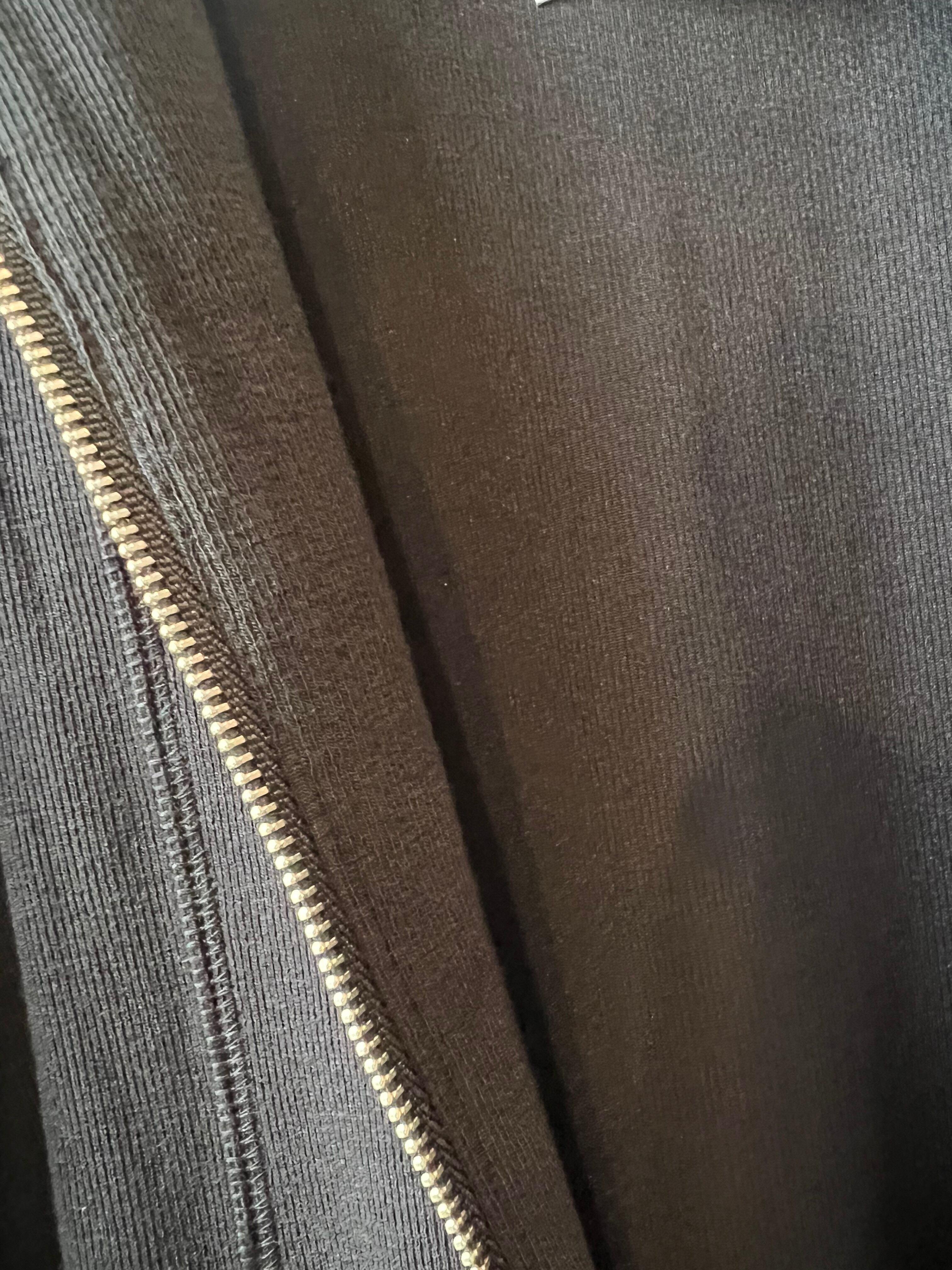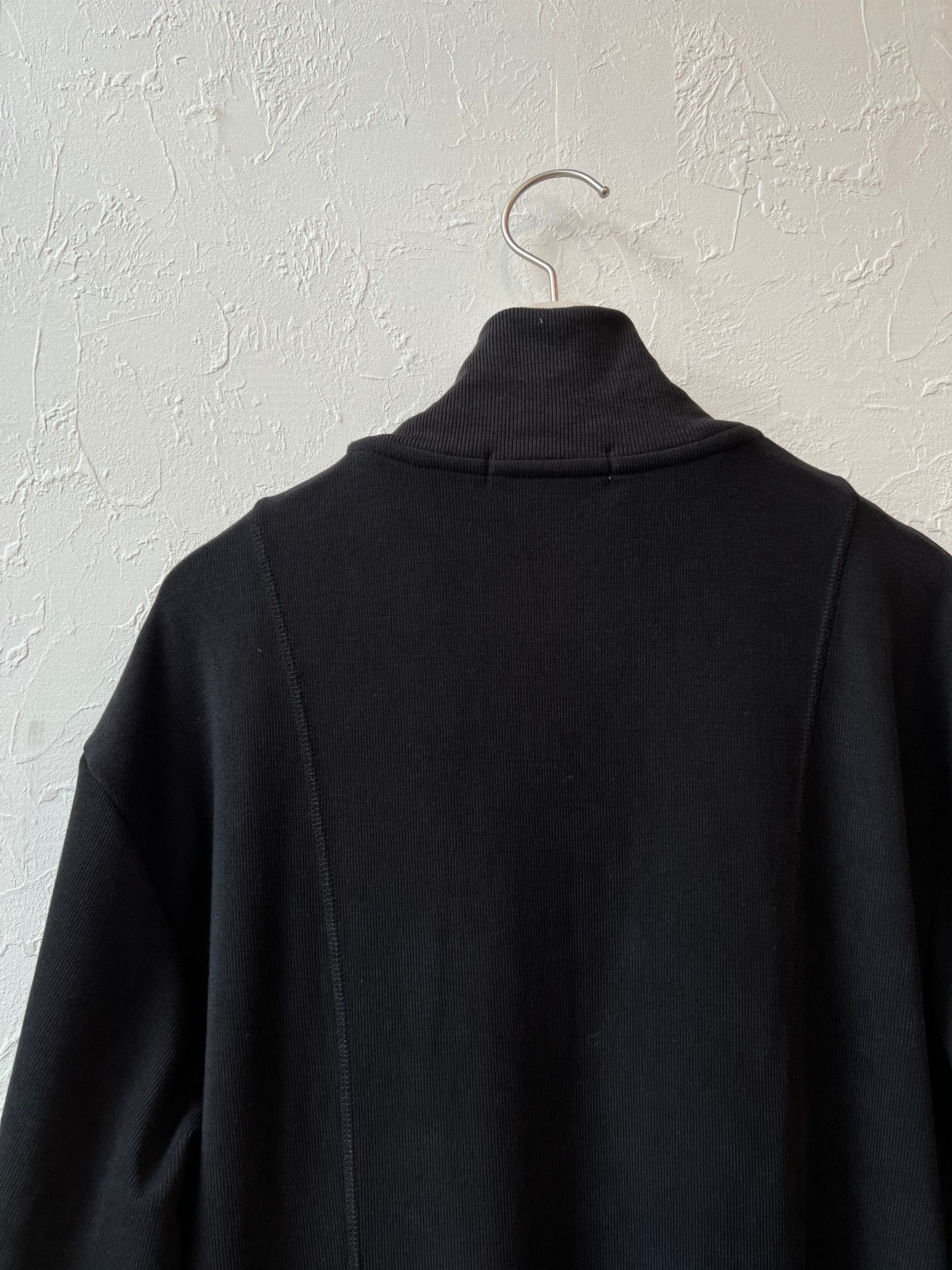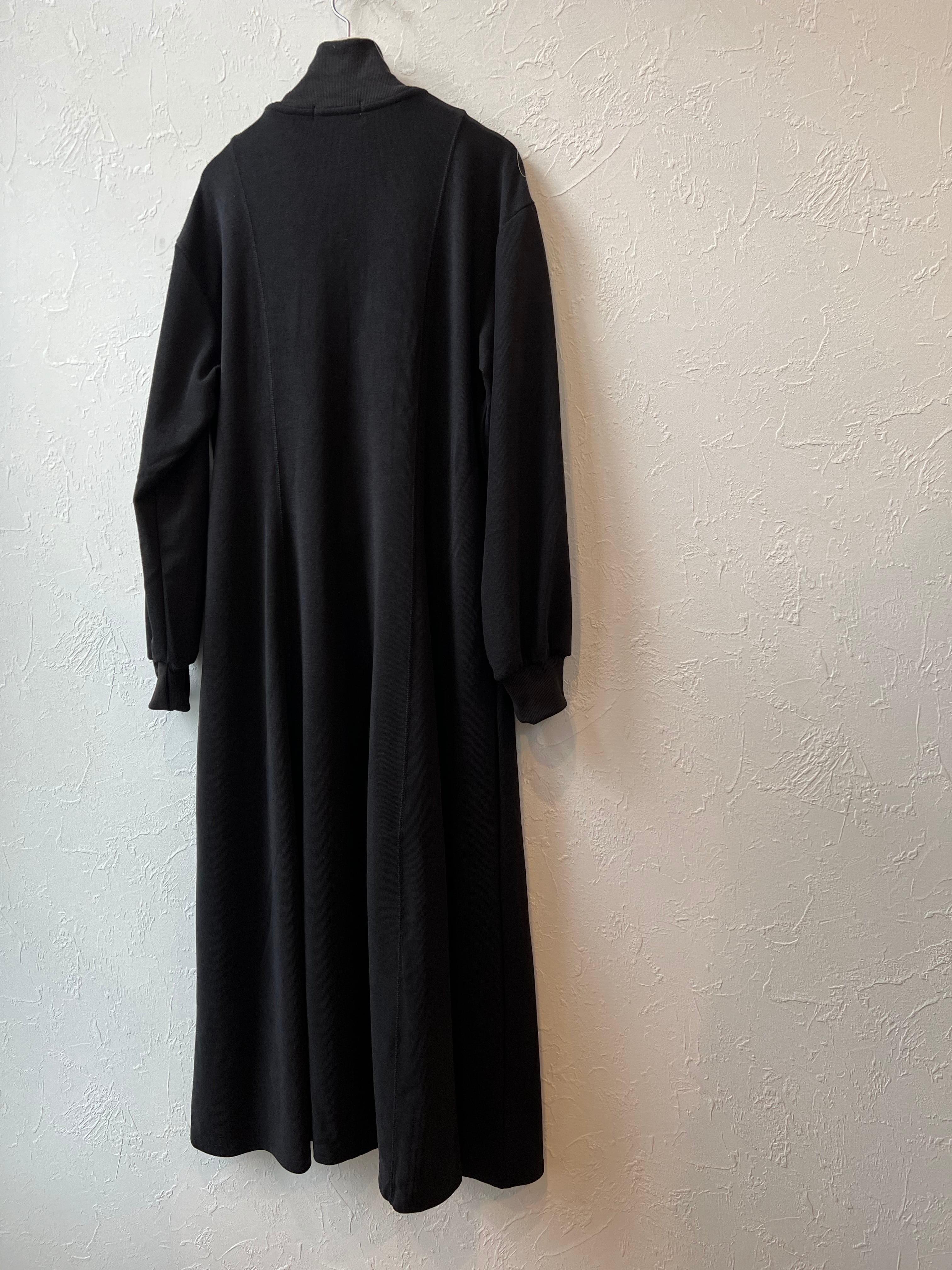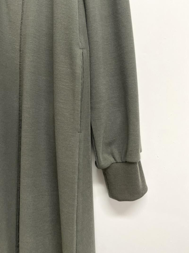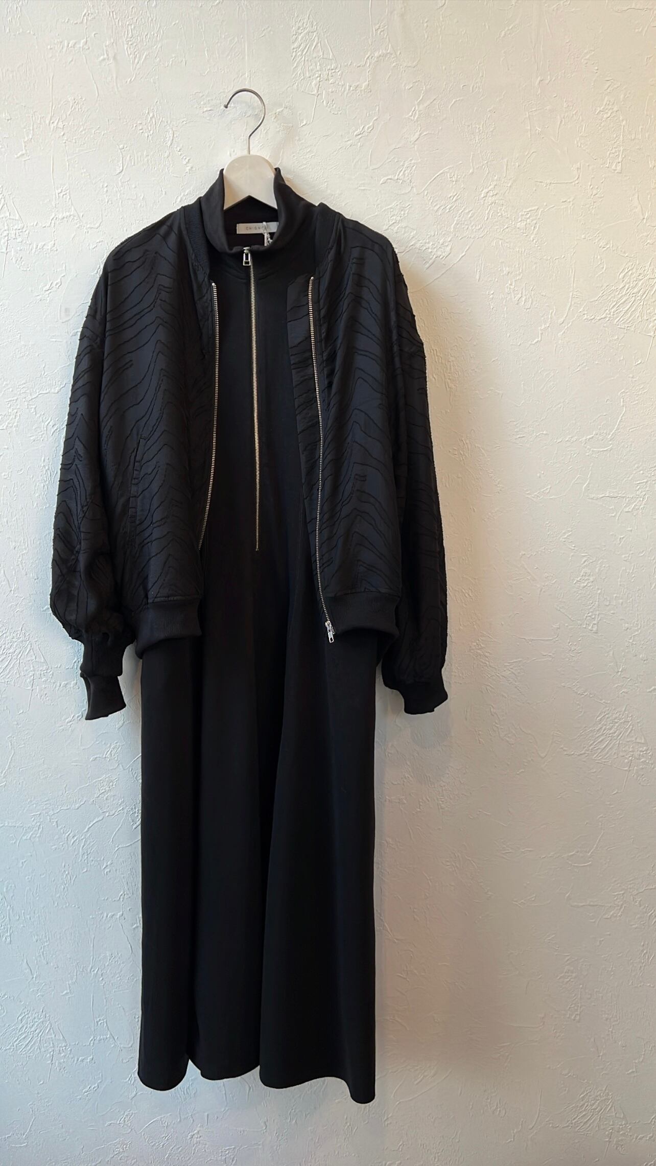 ウエスト下から裾に向かってキレイなフレアシルエットが出るようなパターンにしています。ハーフZIPでスポーティな印象ですが、素材の落ち感とパターンで、程よく大人で、女性らしいワンピースに仕上げています。