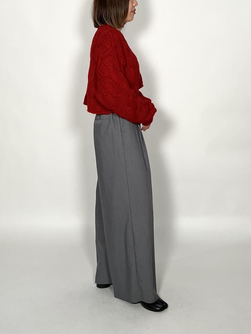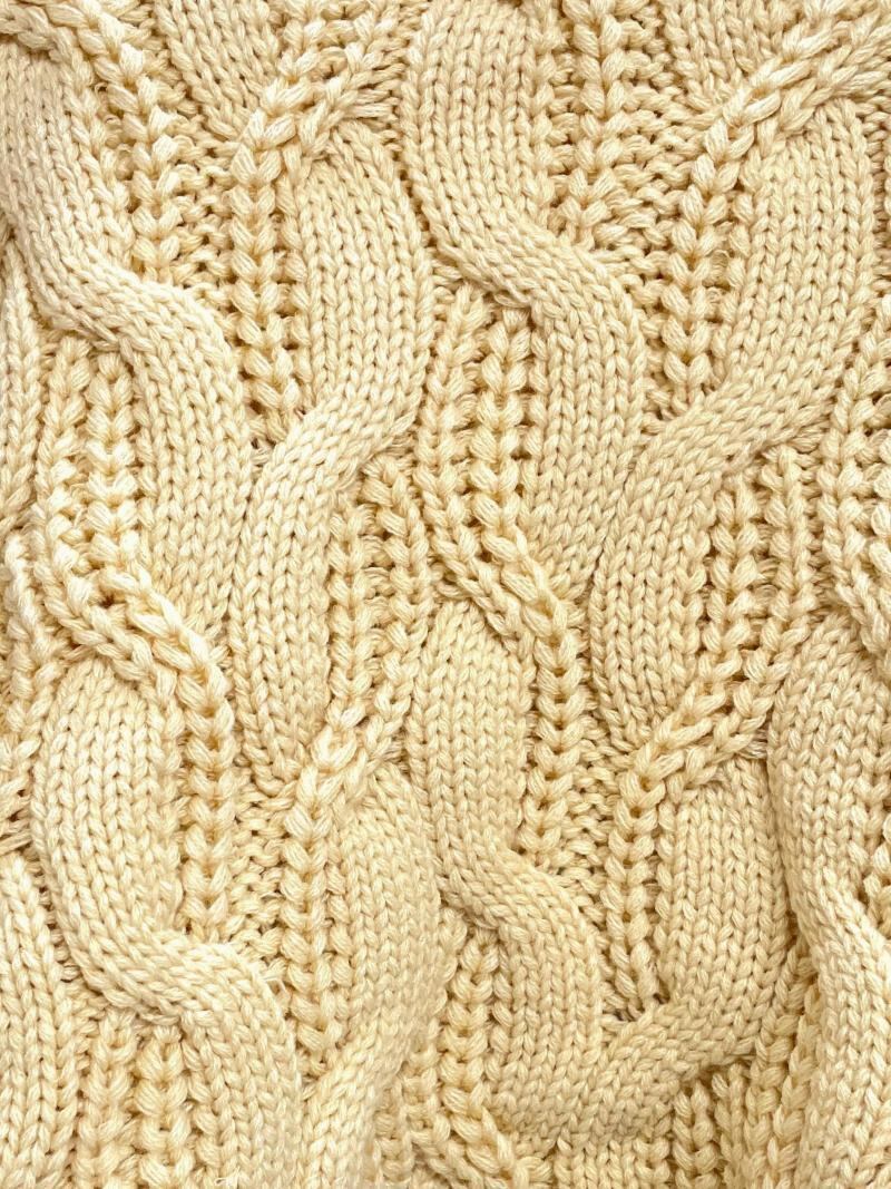 糸を多本取りし、変形ケーブル編みを施す事で、ふっくらと柔らかいタッチに仕上げています。