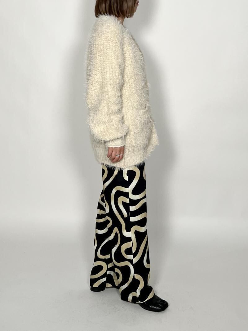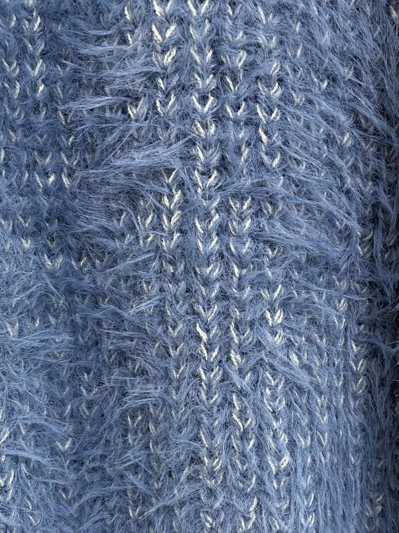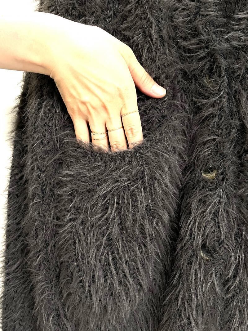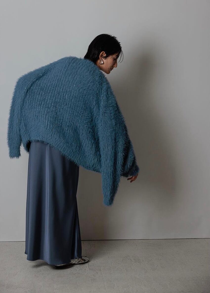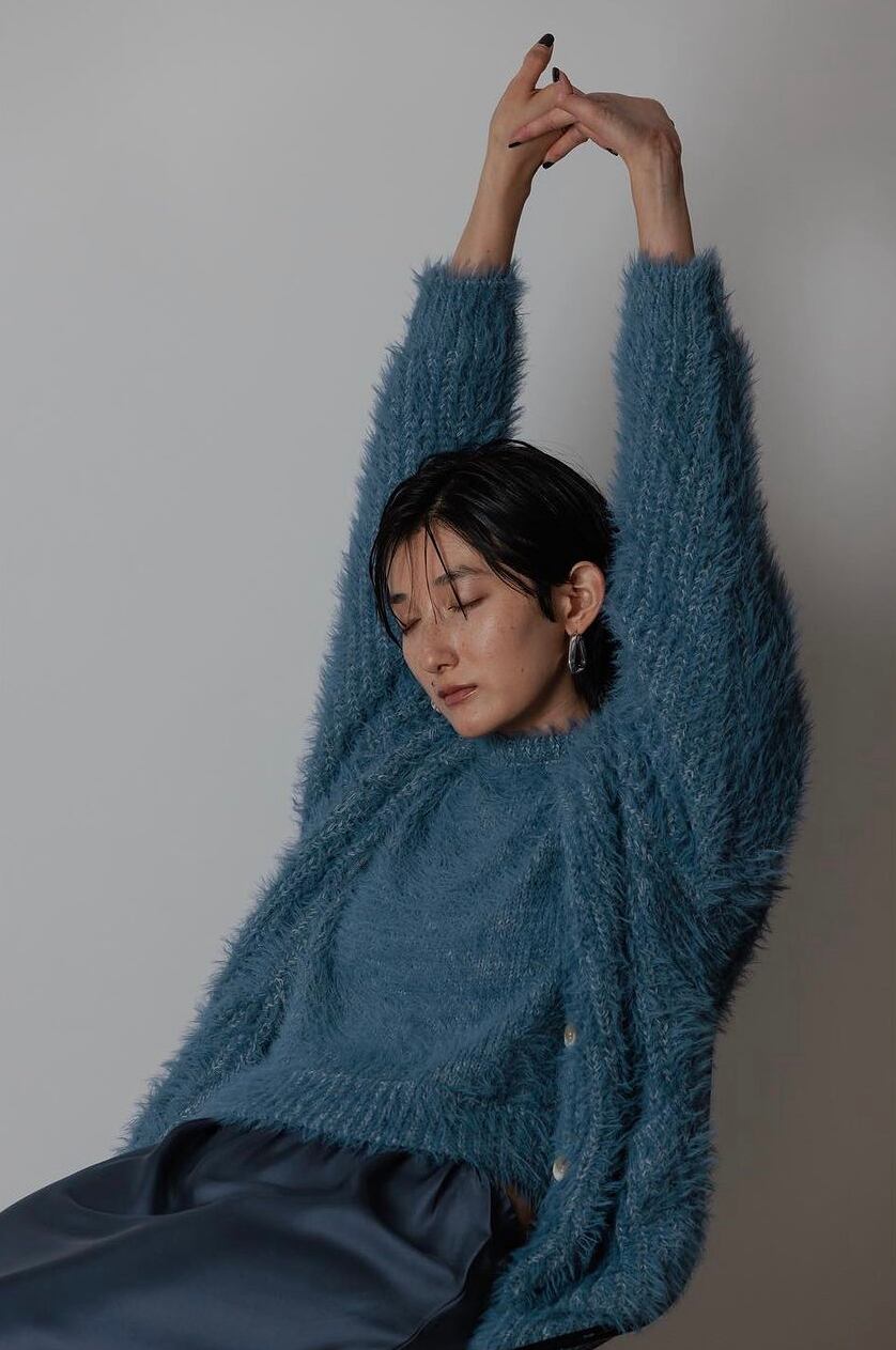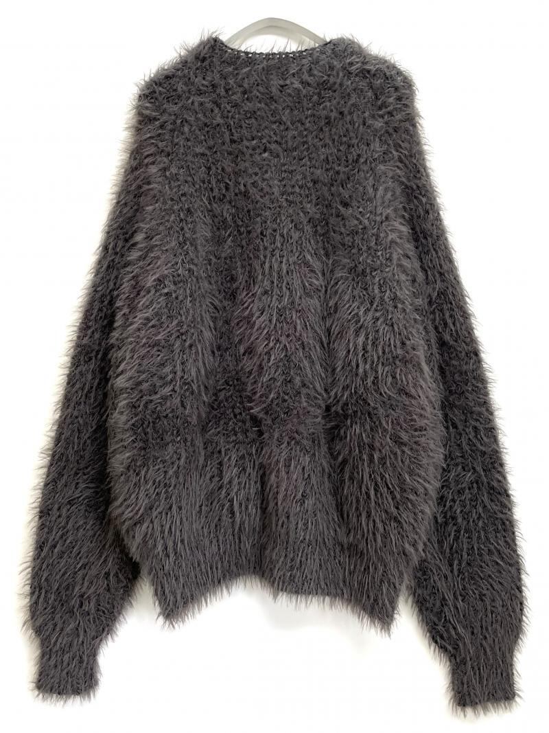 毛足の長いシャギー糸と、フラットなアクリル糸を一緒に編み込んで仕上げた、ニットカーデです。まるでファーの様な見え方がポイントです。