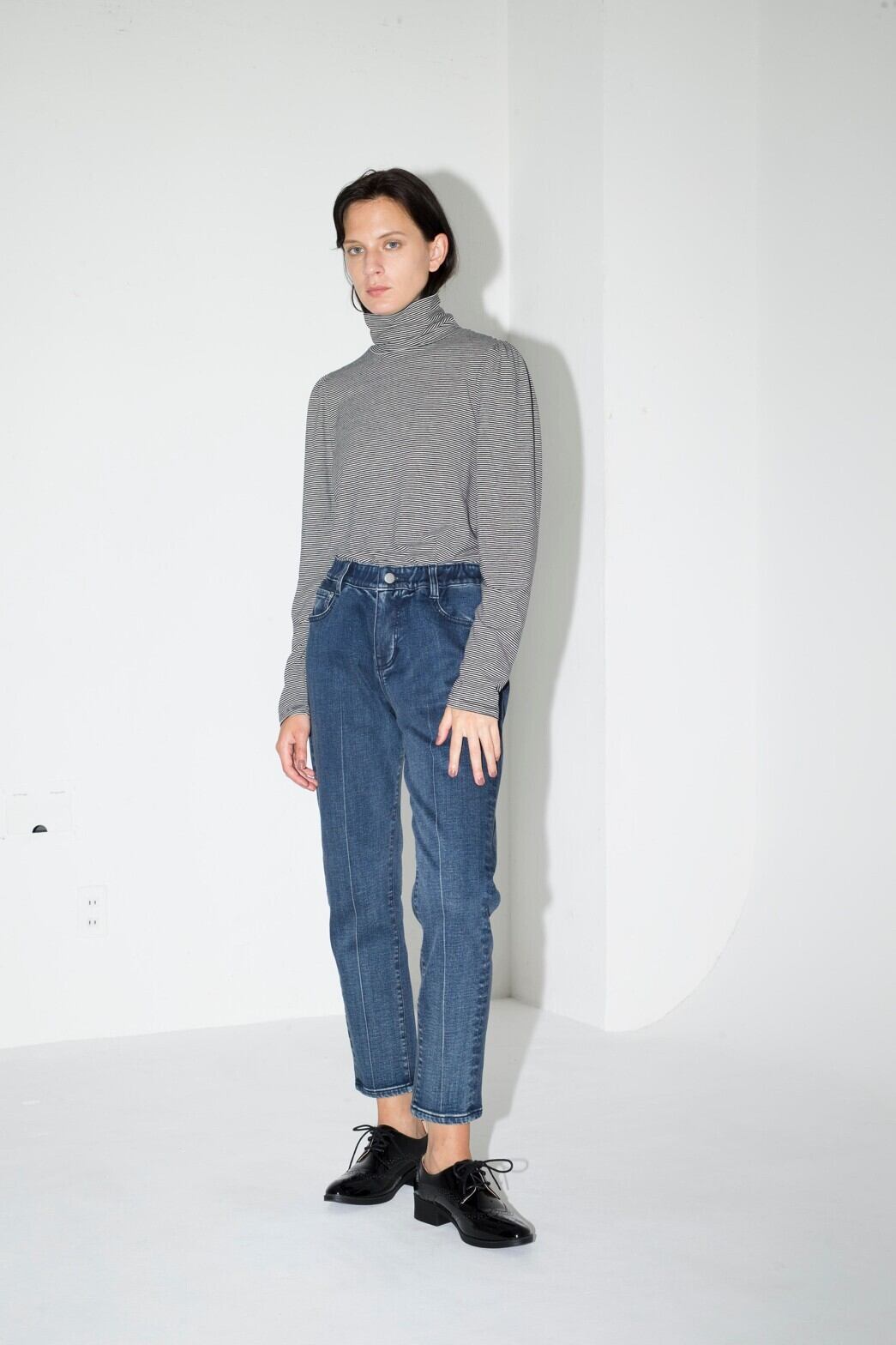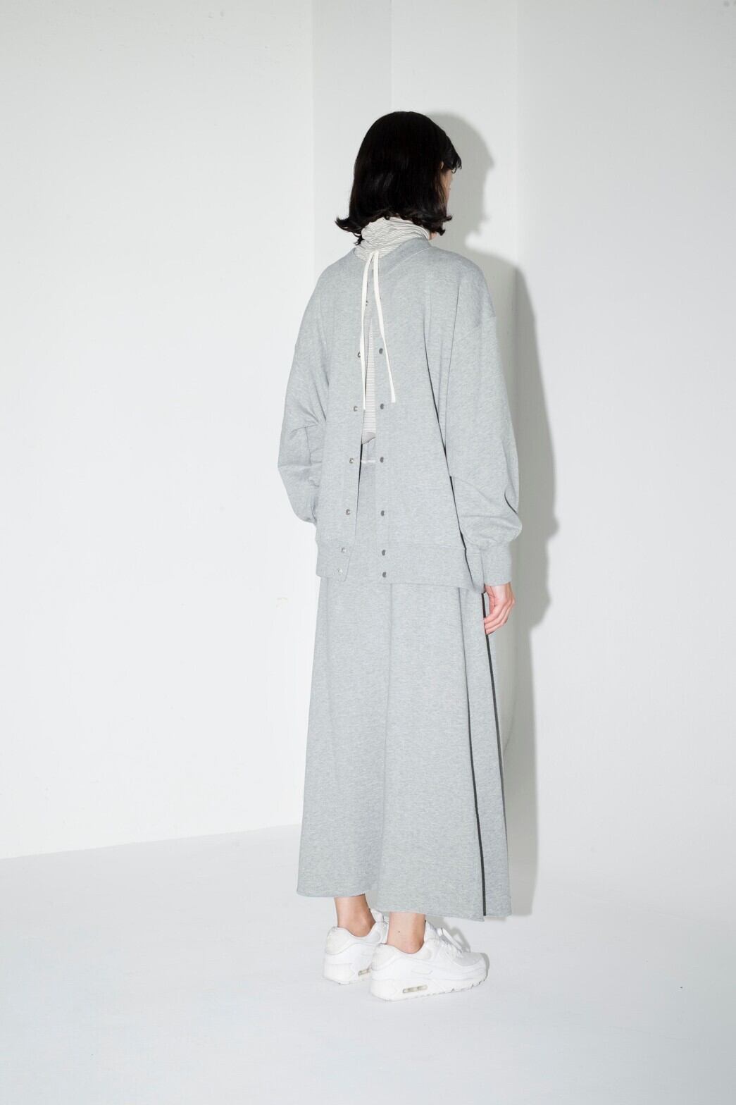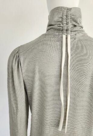 ハイネックの後ろ中心に共紐でギャザーを寄せることができるシンプルながらもディテール