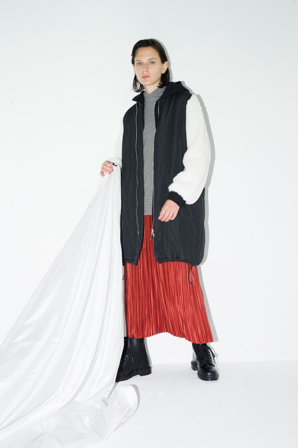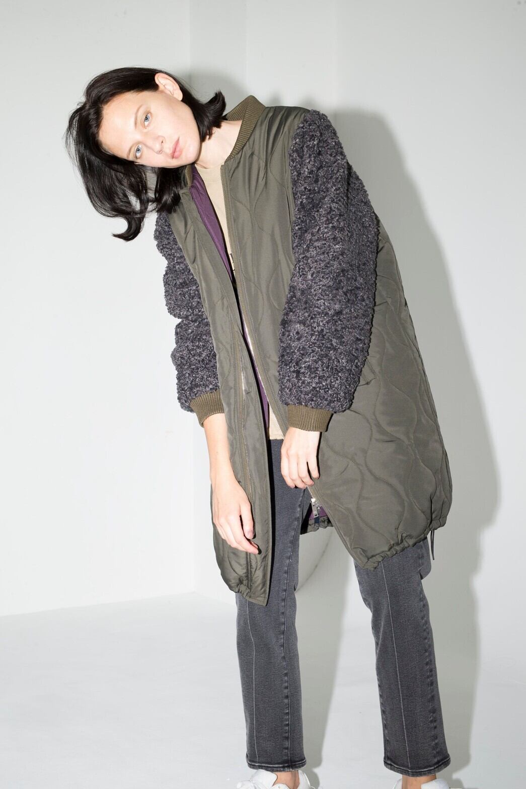 キルティング×ボアのコンビデザインが今年らしい膝丈のコート。ゆったりとしたシルエッ