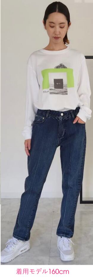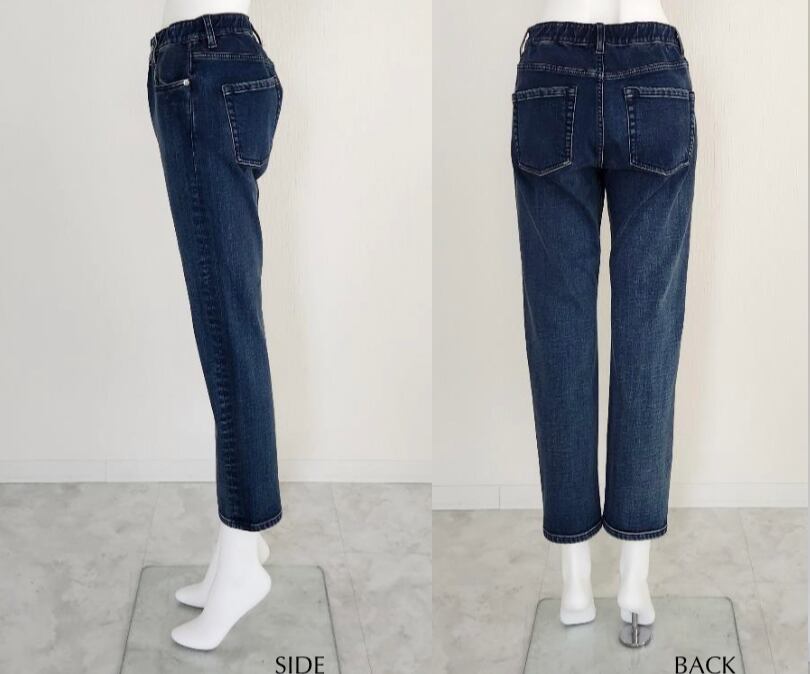 センタークリース加工を施したテーパード・デニムです。 ヒップやワタリはゆとりを持たせ、裾にかけてややテーパードをかけたシルエットに、脇、 内股のシームを極端に前に振ることで視覚的によりテーパード感を強めた為、美脚、細見え 効果があります。センタークリース加工がさり気なく縦ラインを強調し、より美脚効果を高 めます。キックバックの優れた素材故に履き心地は抜群。ウエスト内側にゴムを施し、ウエ ストフィットも心地よく、見た目は損なわずイージーな履き心地を実現させました。