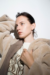 リアルなファーと見紛う程手触りが良く毛並みが美しい高級感のあるフェイクファーとス ウェードをリバーシブルに仕立てた素材です。その重厚感あるビジュアルに反して肩に重み を感じ無い軽量感が特徴。ファーとスウェード面がオリジナル配色となっています。絶妙な ニュアンスカラーで大人っぽく仕上げたブラック、やわらかなグレー、アイボリーの3色展開 です。