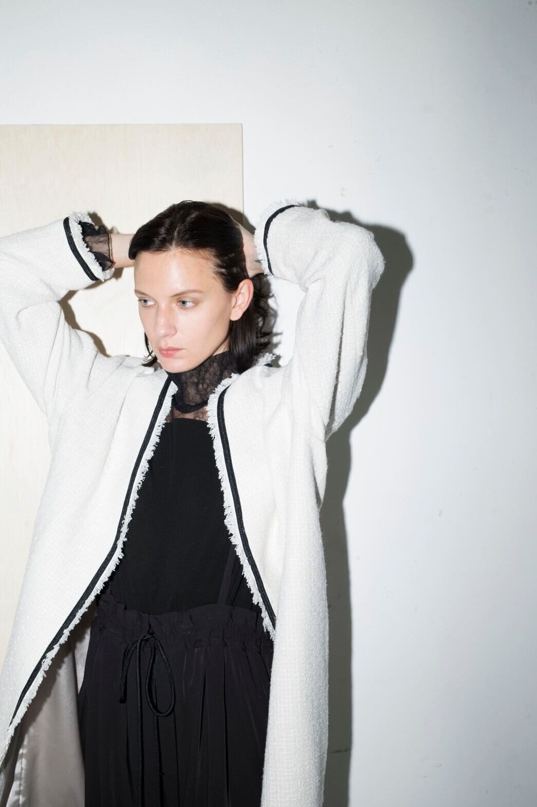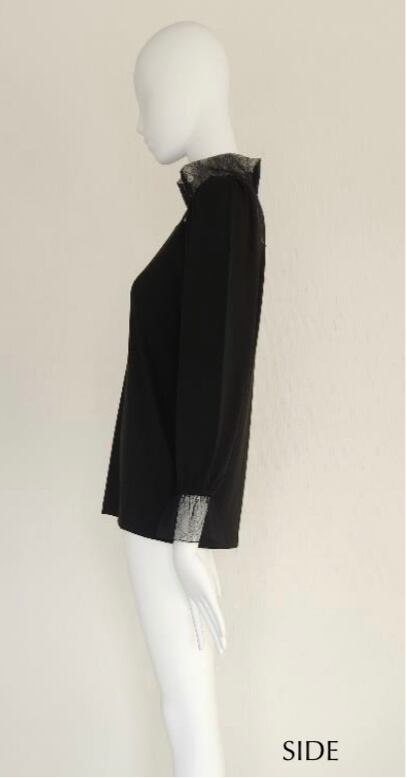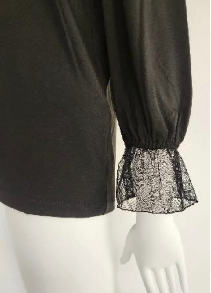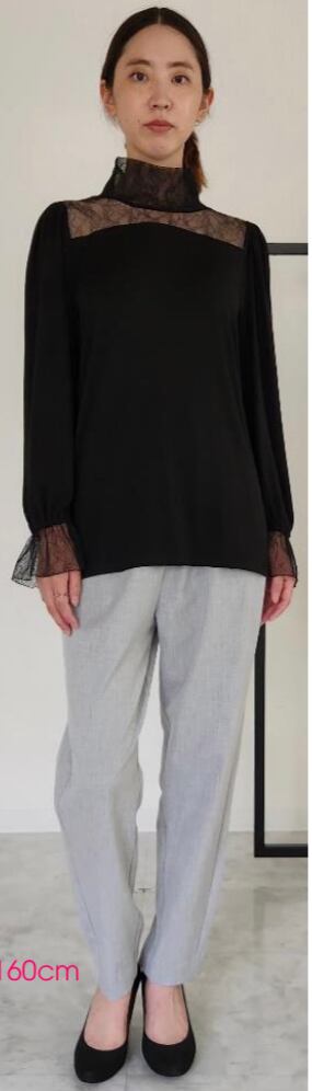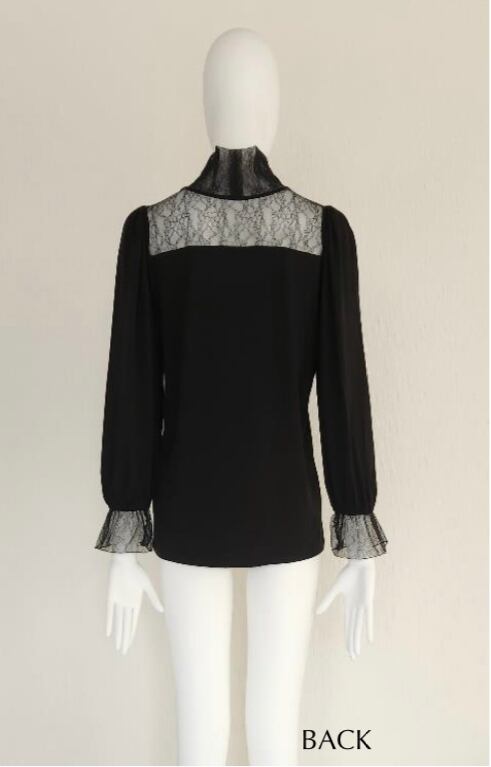 な肌見せを避けたエレガントな印象に。ネックは2重になっており、クシュっとさせてさり気 なくニュアンスをプラス。ネックレスなどとも好相性。袖口にもレースを施し、ジャケットの 袖口からチラッと見せて手首まわりも抜かりなく女性らしさを演出してくれます。