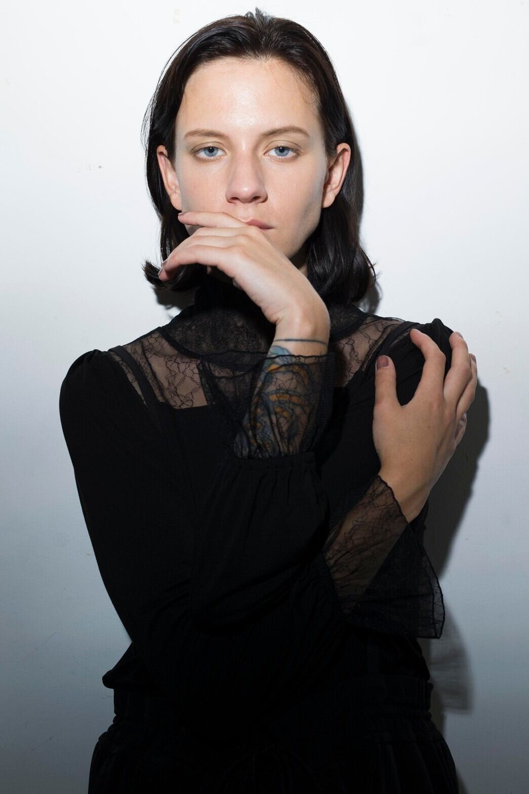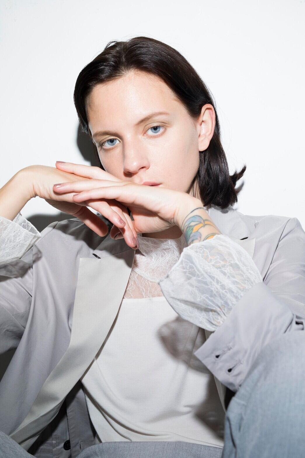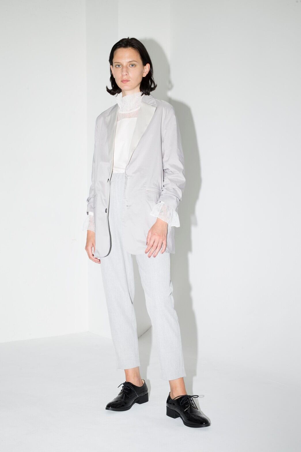 な肌見せを避けたエレガントな印象に。ネックは2重になっており、クシュっとさせてさり気 なくニュアンスをプラス。ネックレスなどとも好相性。袖口にもレースを施し、ジャケットの 袖口からチラッと見せて手首まわりも抜かりなく女性らしさを演出してくれます。