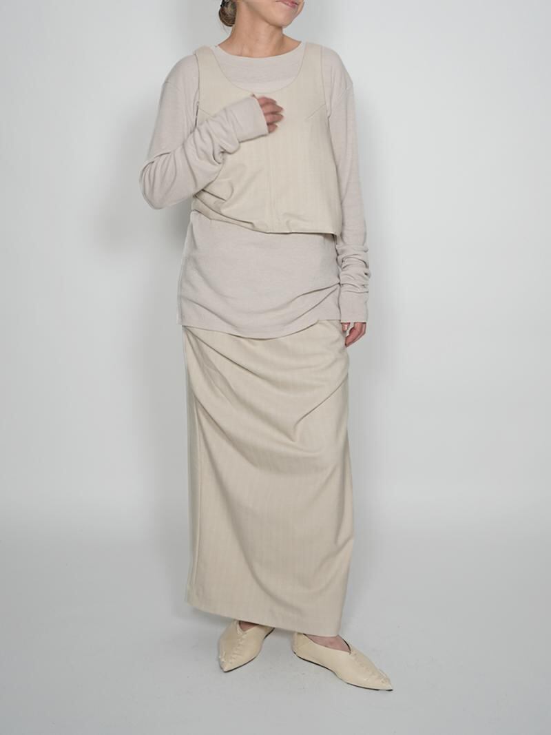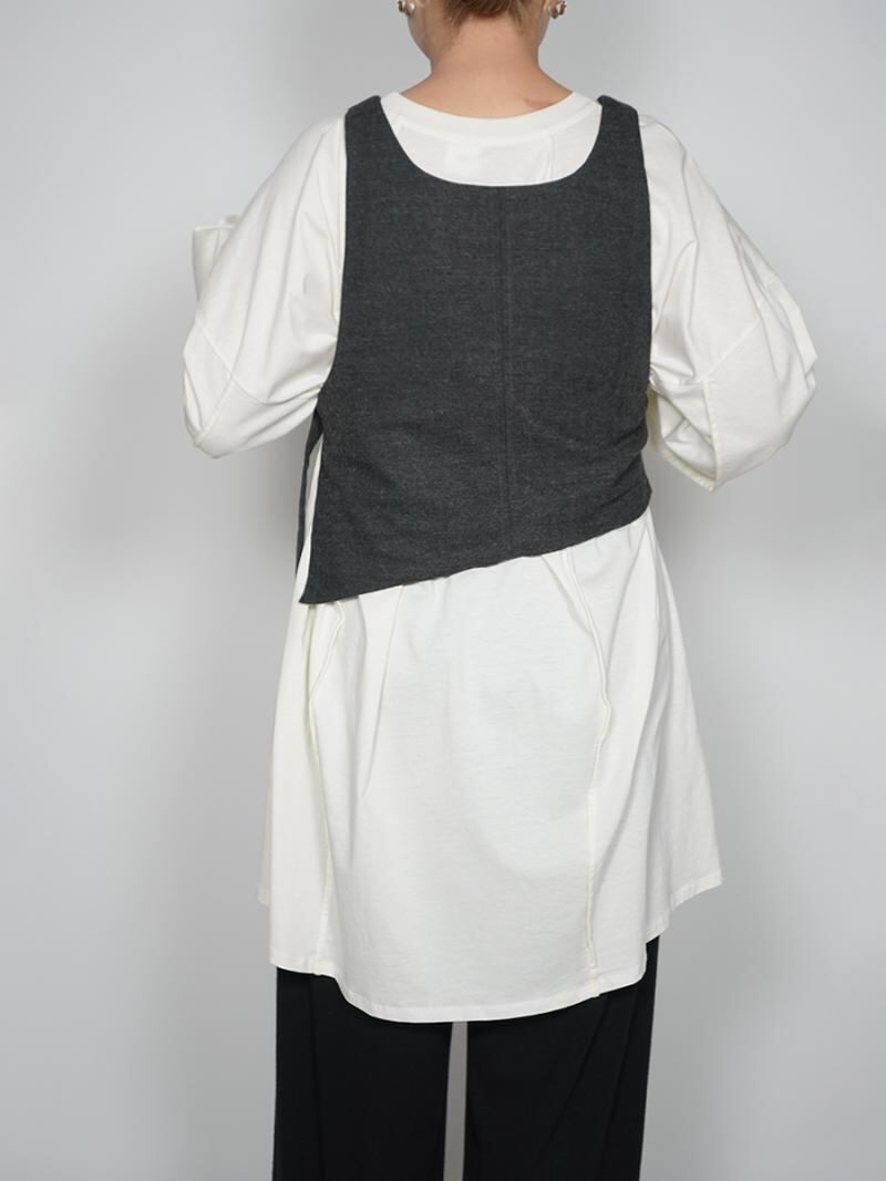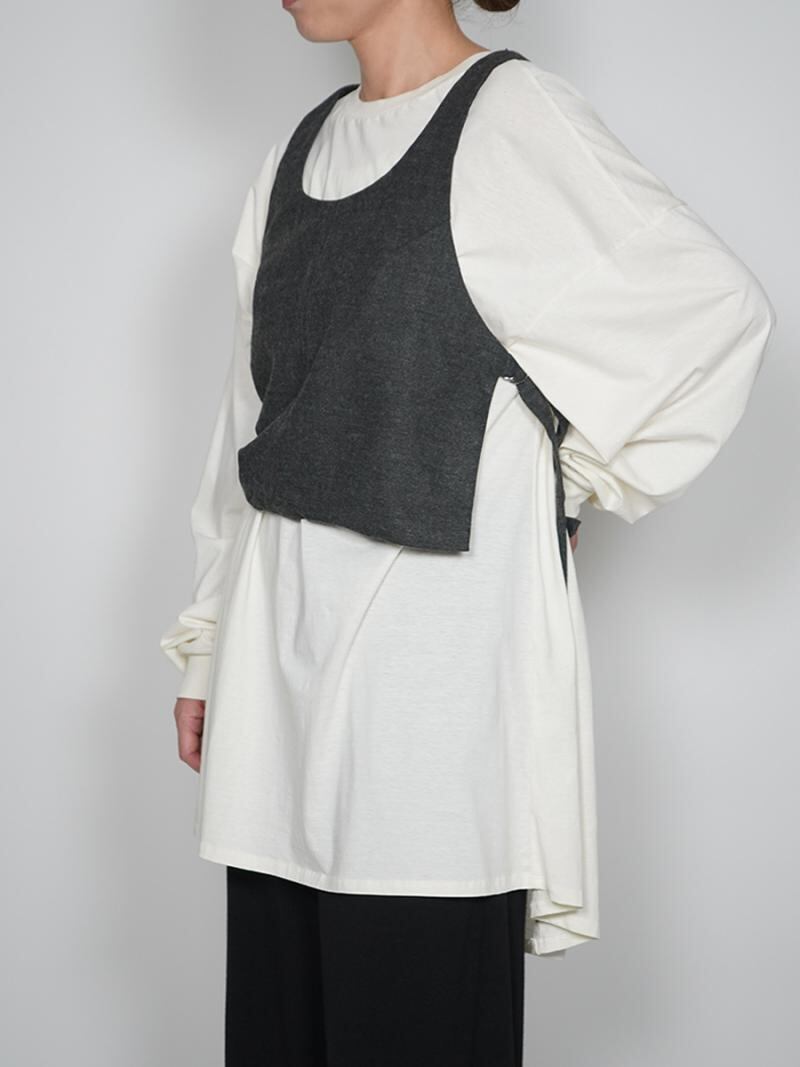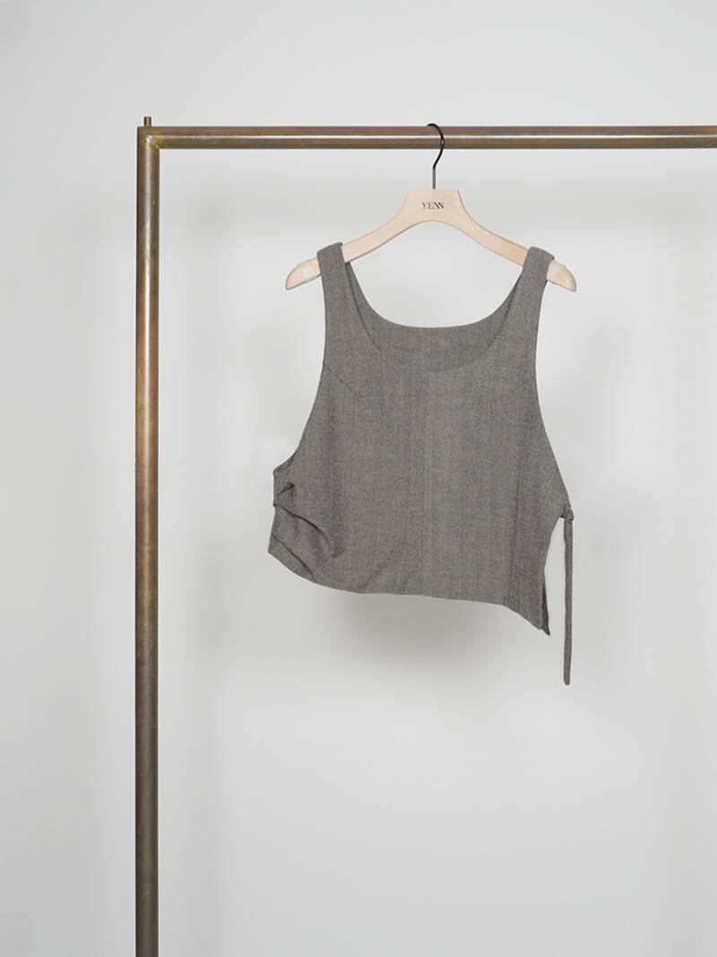 短丈のタンクトップのような形を採用したビスチェで、コンパクトなサイズながら左脇を完全にフラシで開けることで締め付けが無くサイズ調整もきくデザインです。 右脇にはタックを施して右上がりになるアシンメトリーなシルエットでタックで作る立体感もポイントです。 カットソーからシャツ、ニットまで幅広くレイヤードを楽しめるスタイリングのしやすさも重視しました。