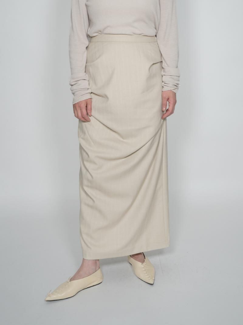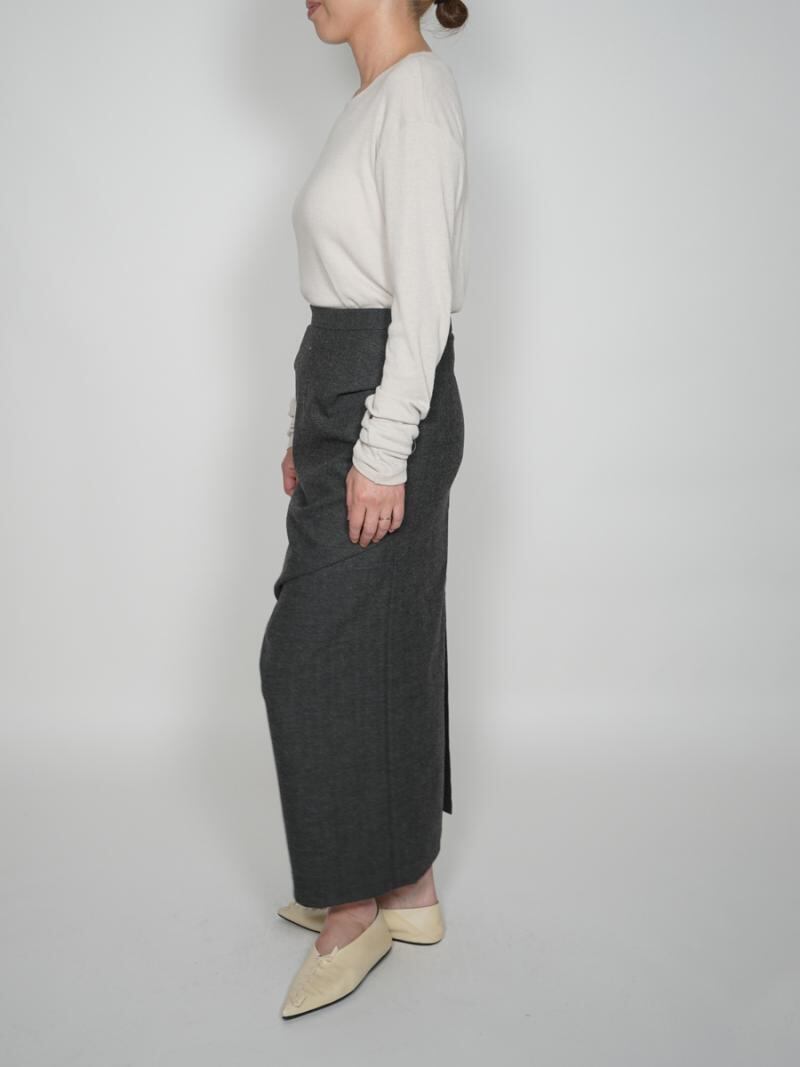 前身頃に不均等なタックを全体的に施して作るドレープが特徴のIラインのスカートで、ドレープのデザイン以外は潔くシンプルに仕上げました。 後には足さばきの良いように深めのベンツあきをいれました。ベンツあきは深めにとりつつもベンツ幅を太くとることで、足が見えにくいようになっています。 すっきりとタイトなシルエットながら全体的に入ったドレープで分量がたっぷりあるため締め付けが無くお腹のラインを拾わないのもポイントです。 ドラマティックな雰囲気のドレープスカートは女性らしいアイテムの需要が高まる今シーズンにおすすめです。