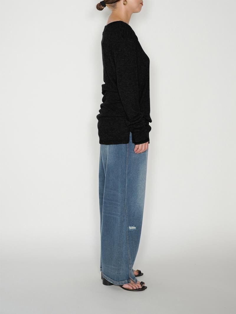 少し透け感のある薄手の生地ですが暖かみを感じる素材感で、秋口には1枚で寒くなってきたらレイヤード用のインナーとして着用いただけます。 衿ぐりは程よくあいたボートネックで太めのリブ衿がデザインポイントです。Tシャツというよりニットトップスのほうな雰囲気があります。袖はかなり長めにとっていて、袖口でくしゅくしゅとさせて着用いただきます。裾に向かって細くなるナローシルエットですが、ゆるっとした雰囲気で体のラインもそこまで気にならないので、ボリュームあるボトムとの相性がよく、色違いで揃えたくなるようなロンTです。
