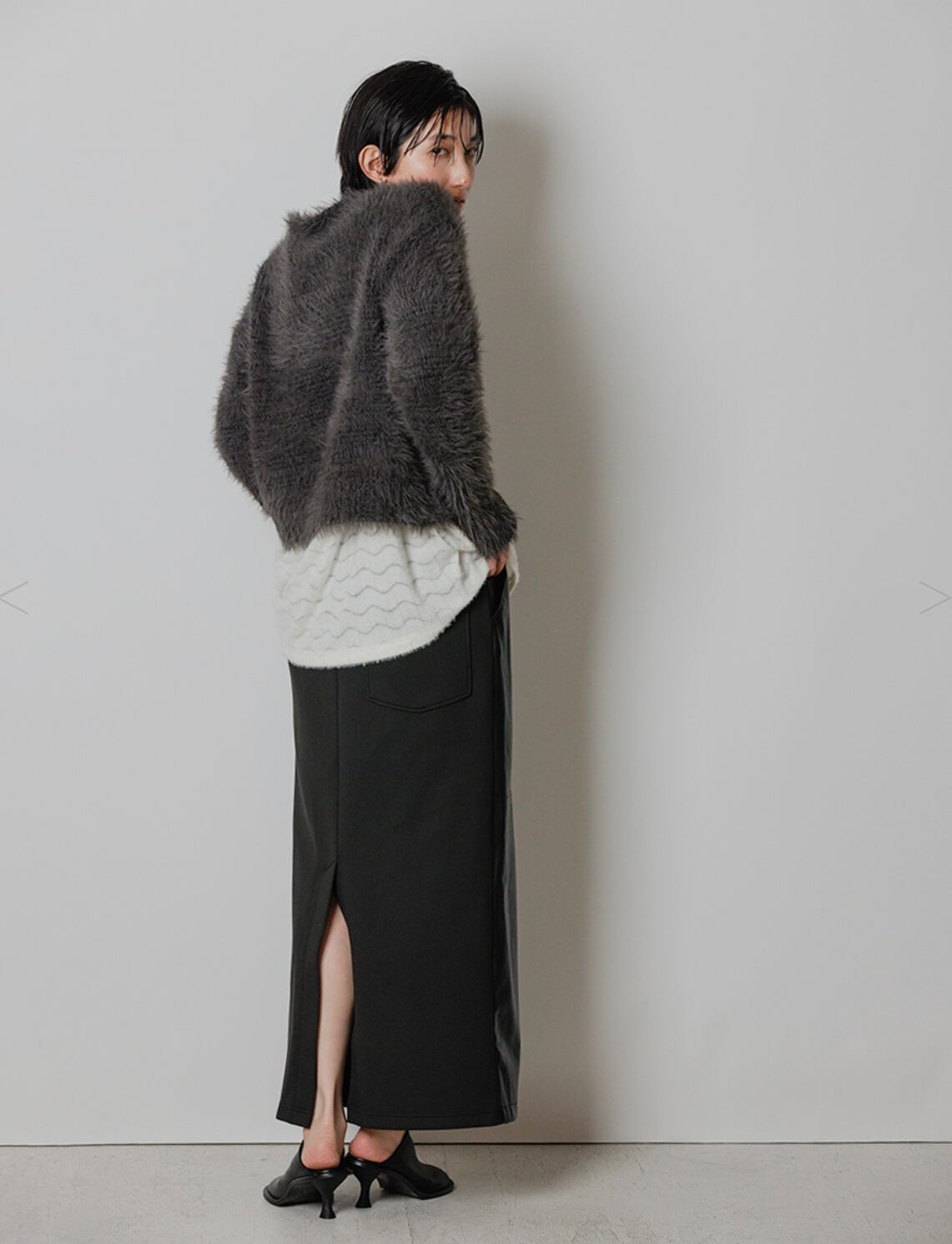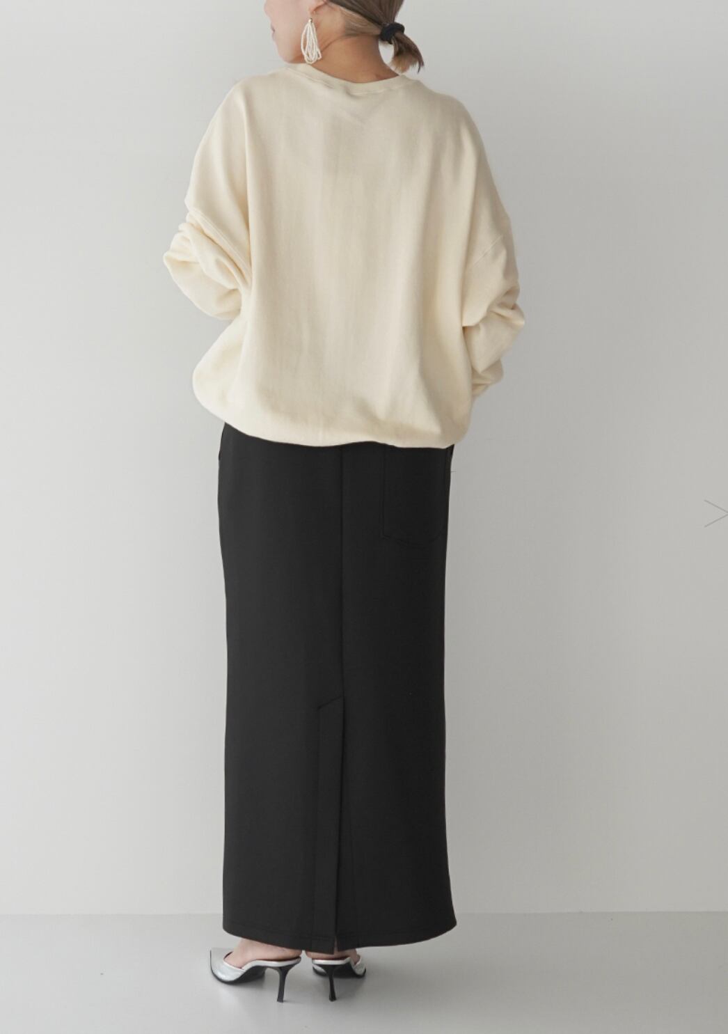 Iラインシルエットでミニマルな印象に仕上げ、後ろのロングベンツで女性らしくまとめました。