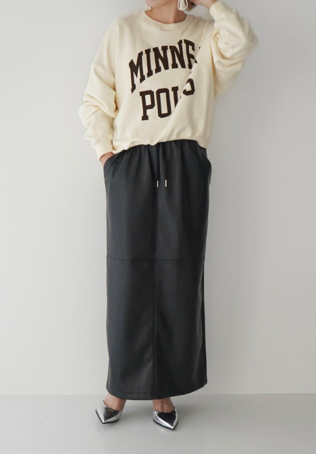 フェイクレザーとポンチを前後で切り替えたイージースカートです。