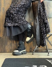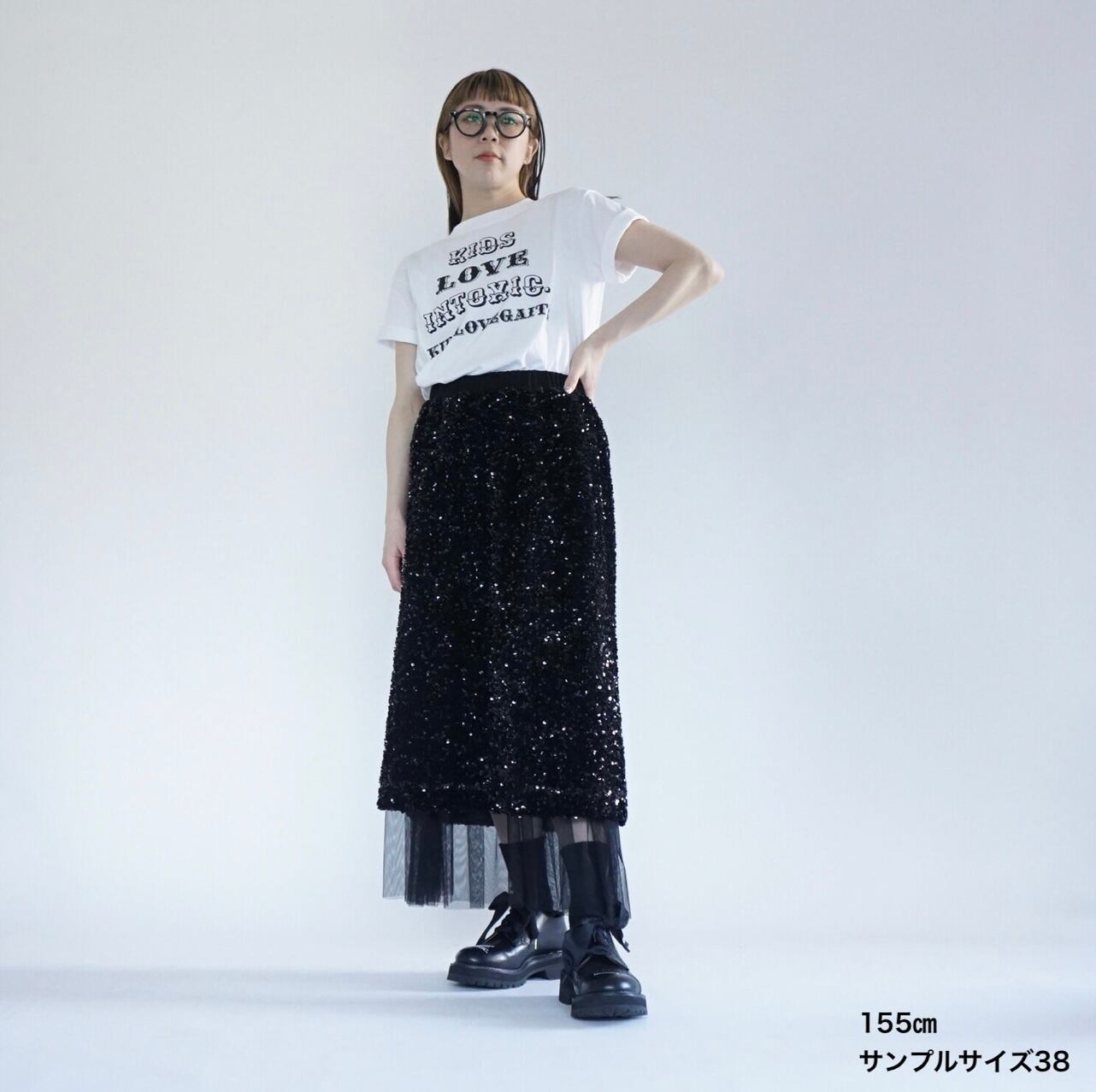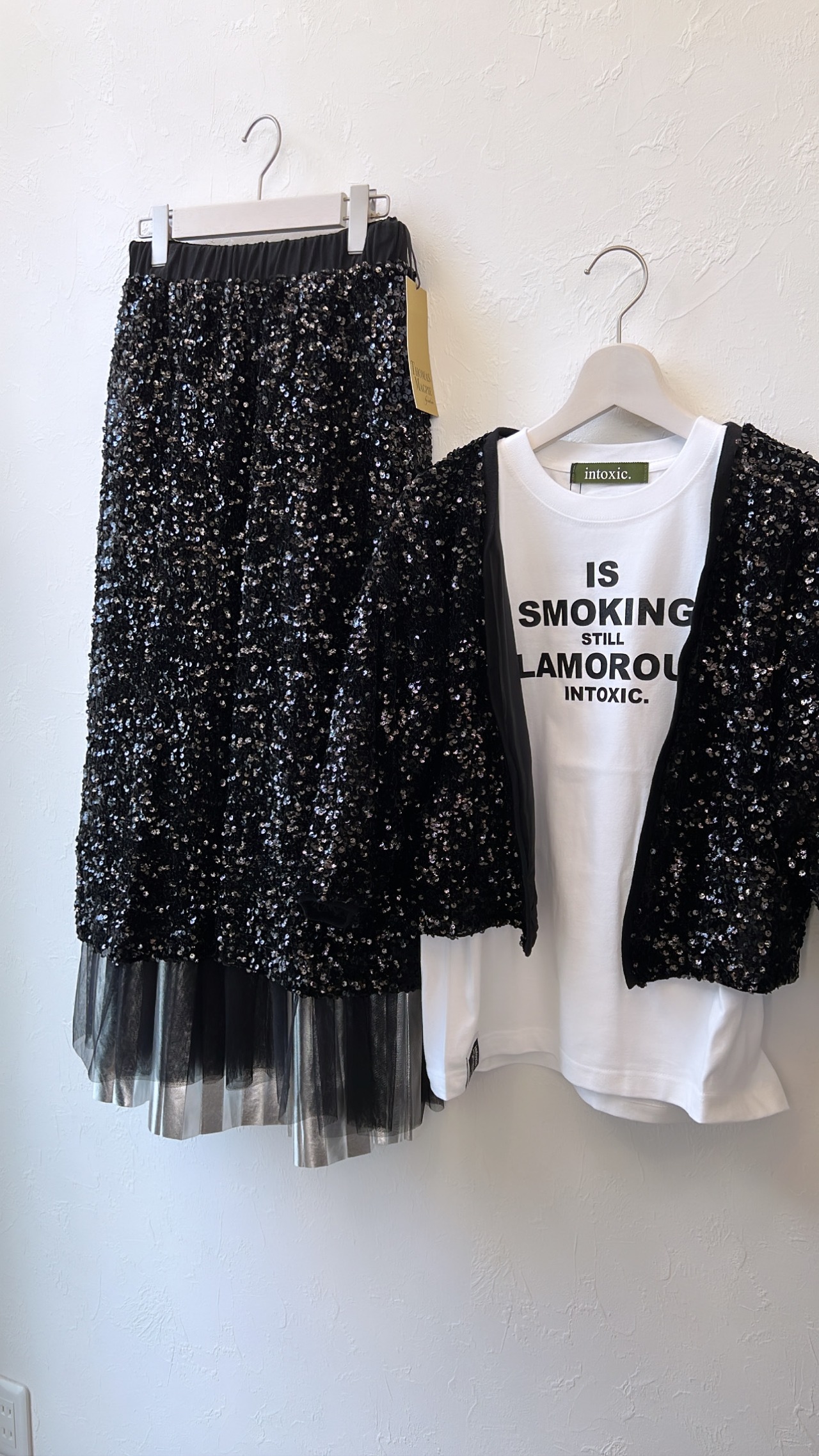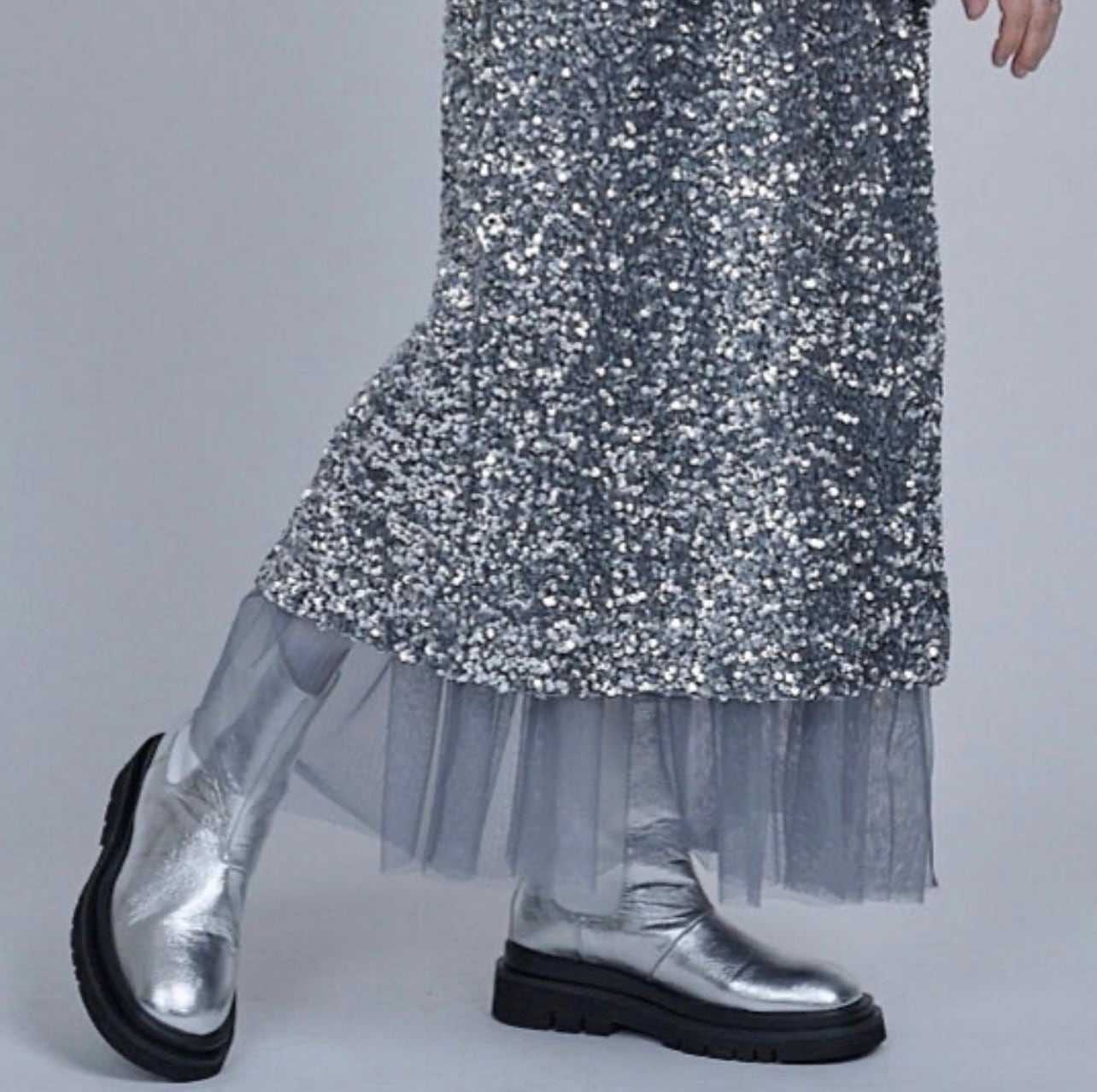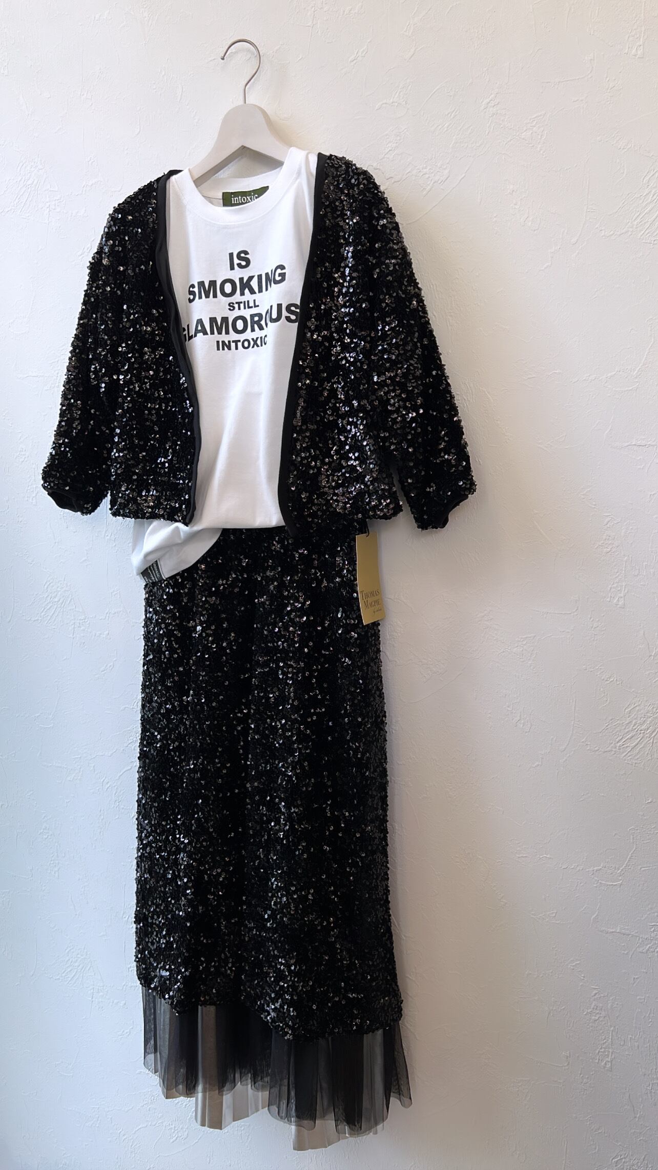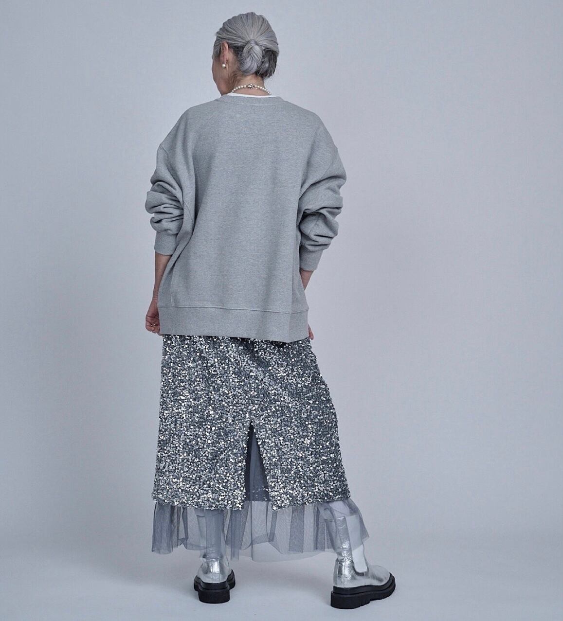ストレッチニットのような素材にたくさんのスパンコールがついた初めて使う素材です。ブリブリにたくさんついたスパンコール、キラキラ感が魅力です。裾からは裏地につけたチュールが見えます。ややタイトですが、動きやすくスリットが入っています。2万円代ですが、もっと高級感があります。お勧めはシルバーですが、ブラックが合わせやすく重宝しました。毎日お洋服のことを考えています。トラッドに傾倒することもしばしばありますが、今年は少しサイバーチックなエッセンスを入れたいと素材を探しました。気になって仕方なかったビッシリと詰まったスパンコールのストレッチ素材。使ってみて良かったなと思います。これまでのデザインするお洋服には変化を生むのに苦労していました。形を変え、ロゴを載せて、他とは少し違う世界観にしてみたいと、パターンにラインを加えたり、縫い代を見せたり、色々なバリエーションで試行錯誤しましたが、今回はこの素材のパワフルさであまり手を加えずにデザインをしています。ですが裾からのチュールはとても可愛かったので、こちらのデザインがとても気に入っています。チュールは浮いて見えるように、スパンコールの表地に直接つけていません。裏地につけることでインナーチュールが動き、浮いて見えるようにしました。少しハードルが高いアイテムに思えますが、チャレンジしてみて欲しいです。