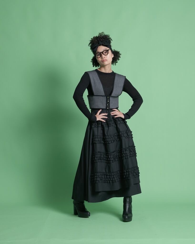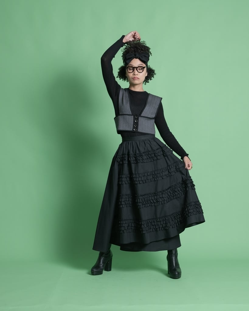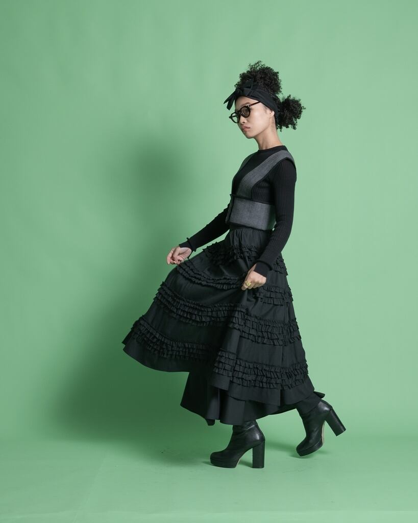 沢山のフリルをつけるのには苦労しました。何度か調整を加え最もベストなシルエットとボリュームになるようにデザインしています。フリルの量があまりに多いため、日本製では工賃が高いため、何度も工場と工夫し交渉をしてこのプライスになりました。フリルをつける大変さがある為なかなかプライスが下げられなかったのが悩みでした。