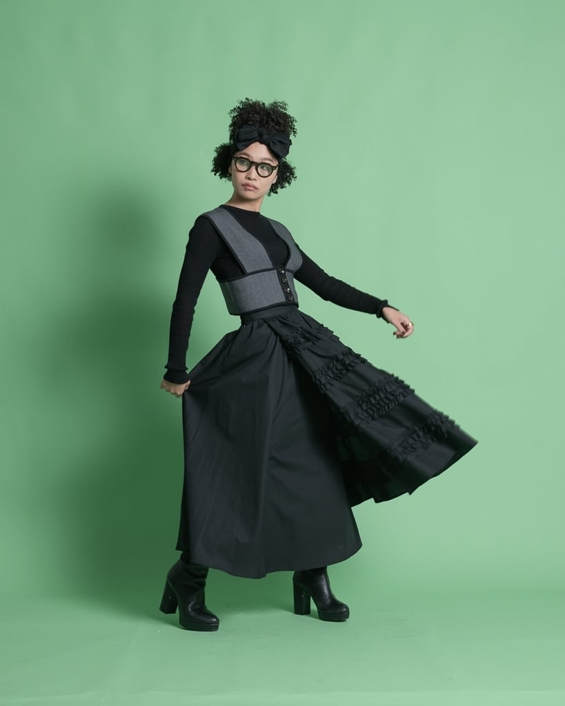 フレアスカートの上にフリルがたくさんついたオーバースカートをつけて個性的なスカートを作りました。このスカートはラップ風に生地が重ねてありますが、ウエストがゴムになっていて開閉ファスナーで簡単に着用が可能。今回の自信作です。軽いコットンで少しハリがあるので上質な雰囲気が伝わります。重みはありませんが、フリルの重みでほっそりとした体型に見えるようになっており、ボリュームがあっても着用すると美しいAラインになります。