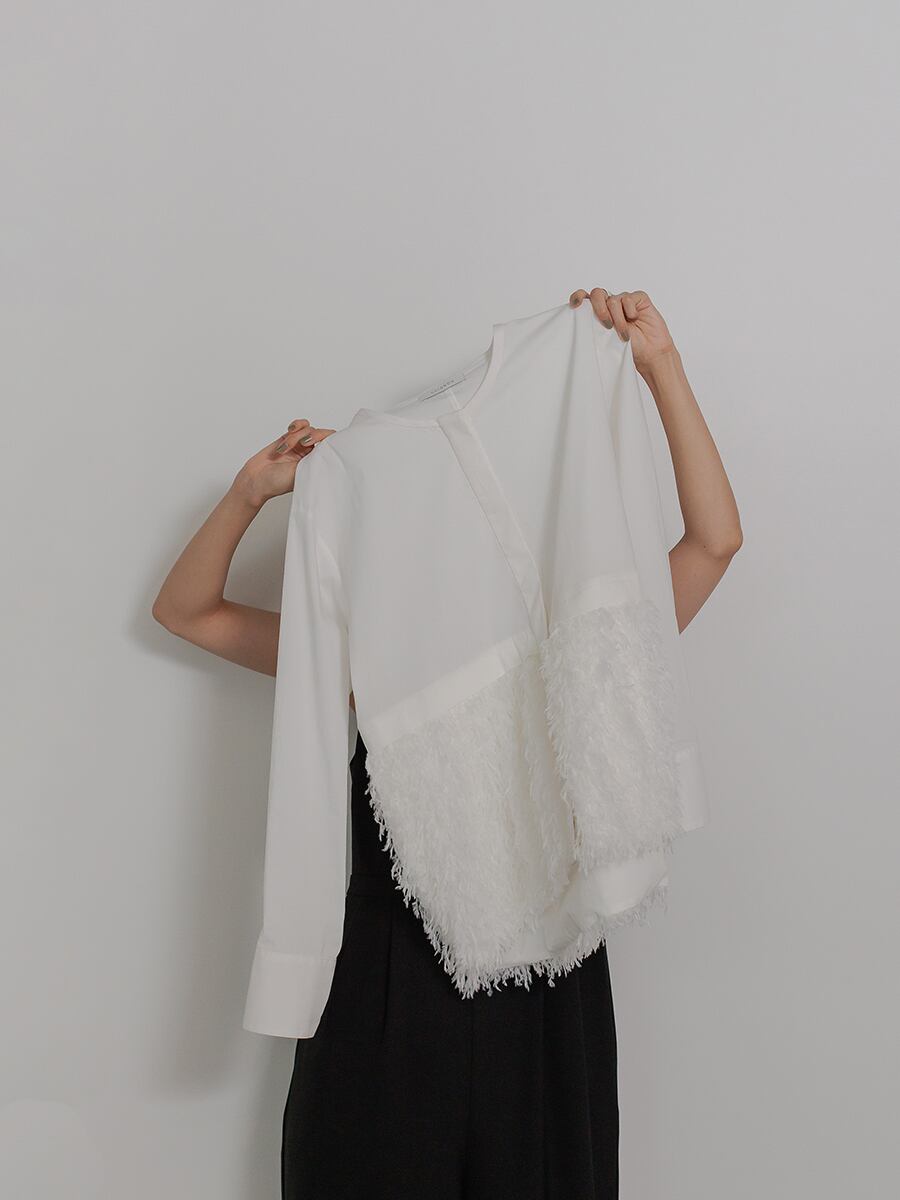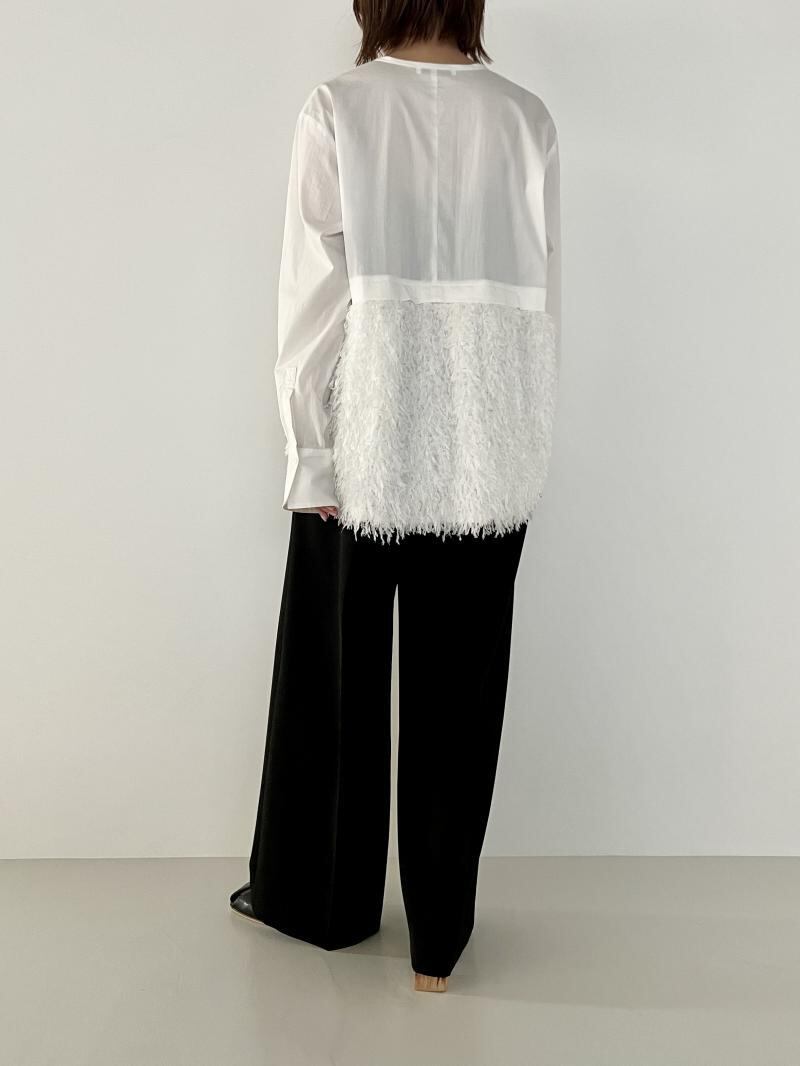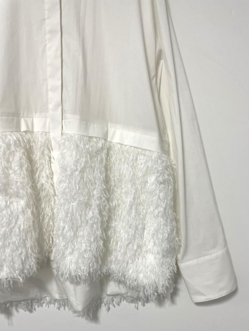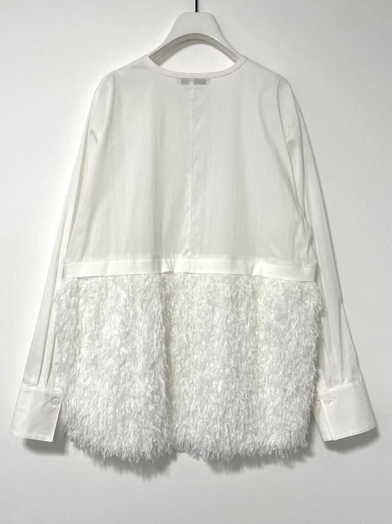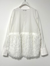 毛足のあるフェザーのような異素材をブロッキンッグしたデザインシャツになります。