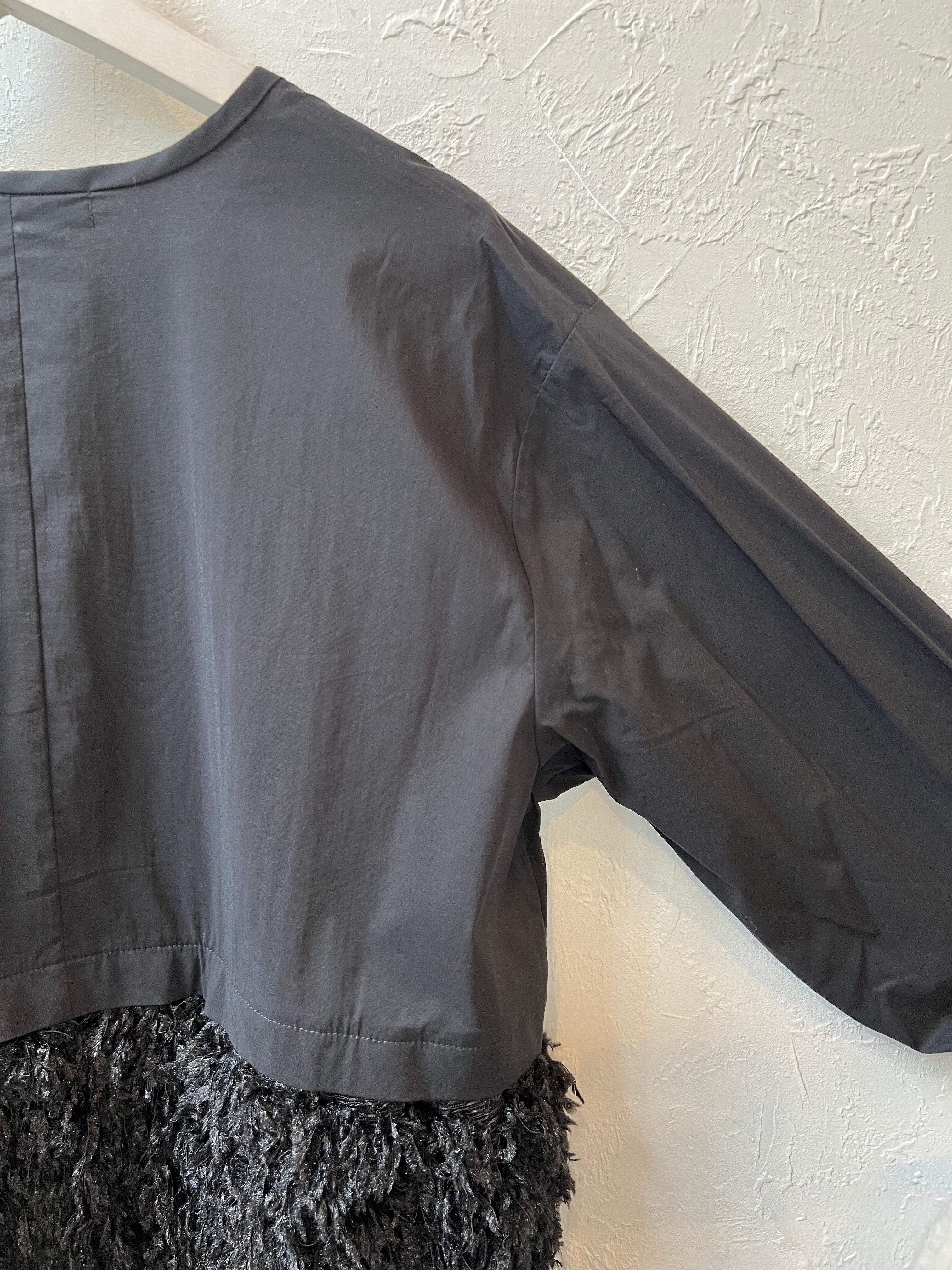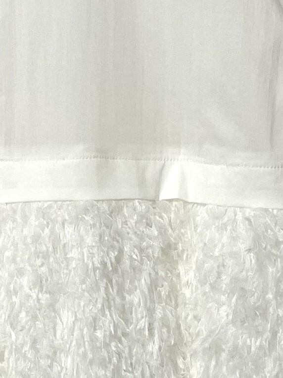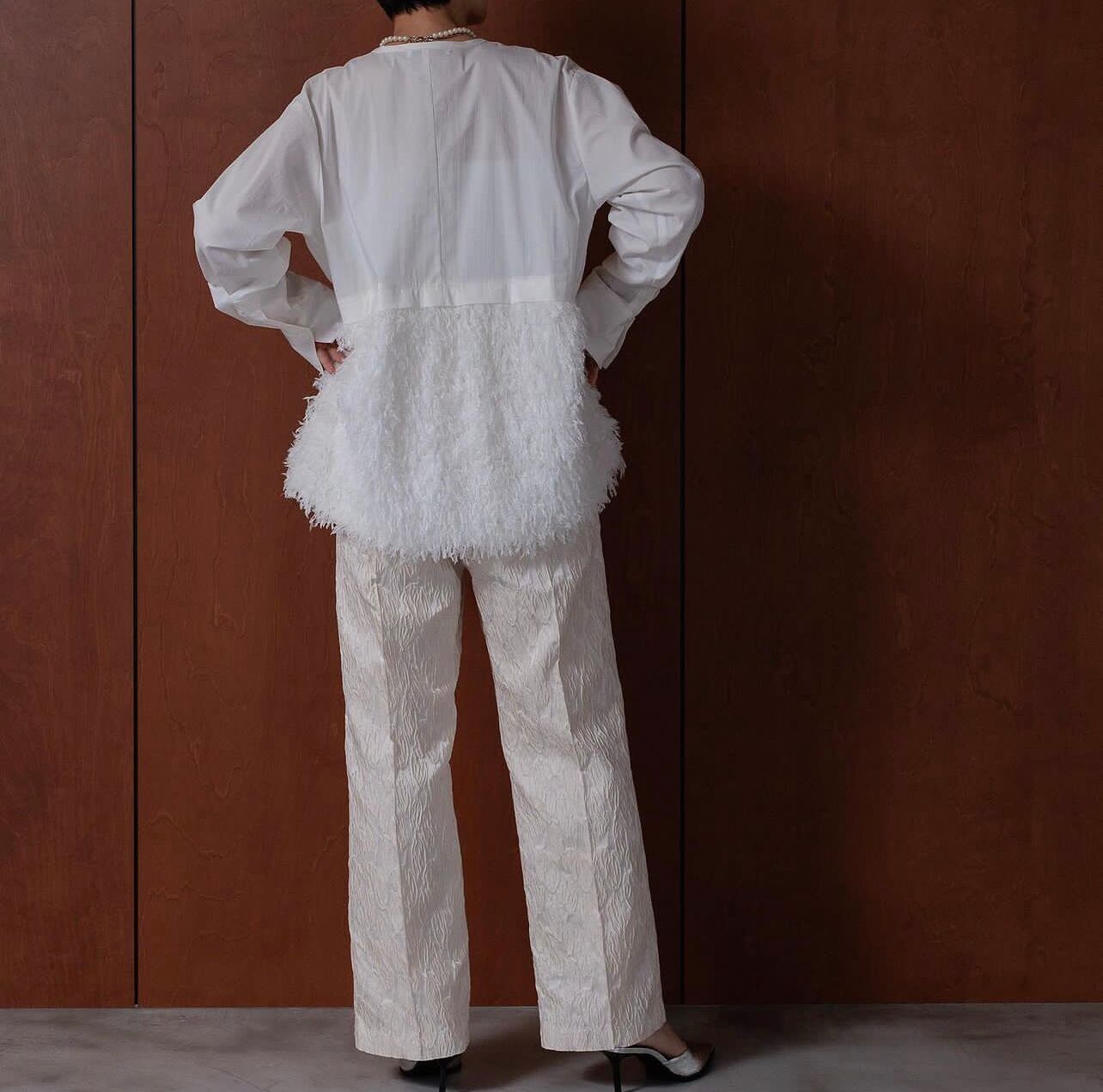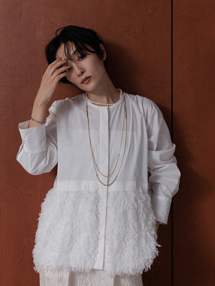 毛足のあるフェザーのような異素材をブロッキンッグしたデザインシャツになります。