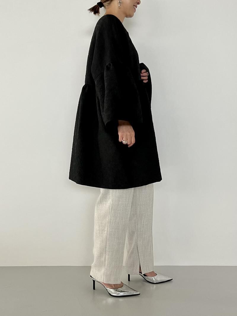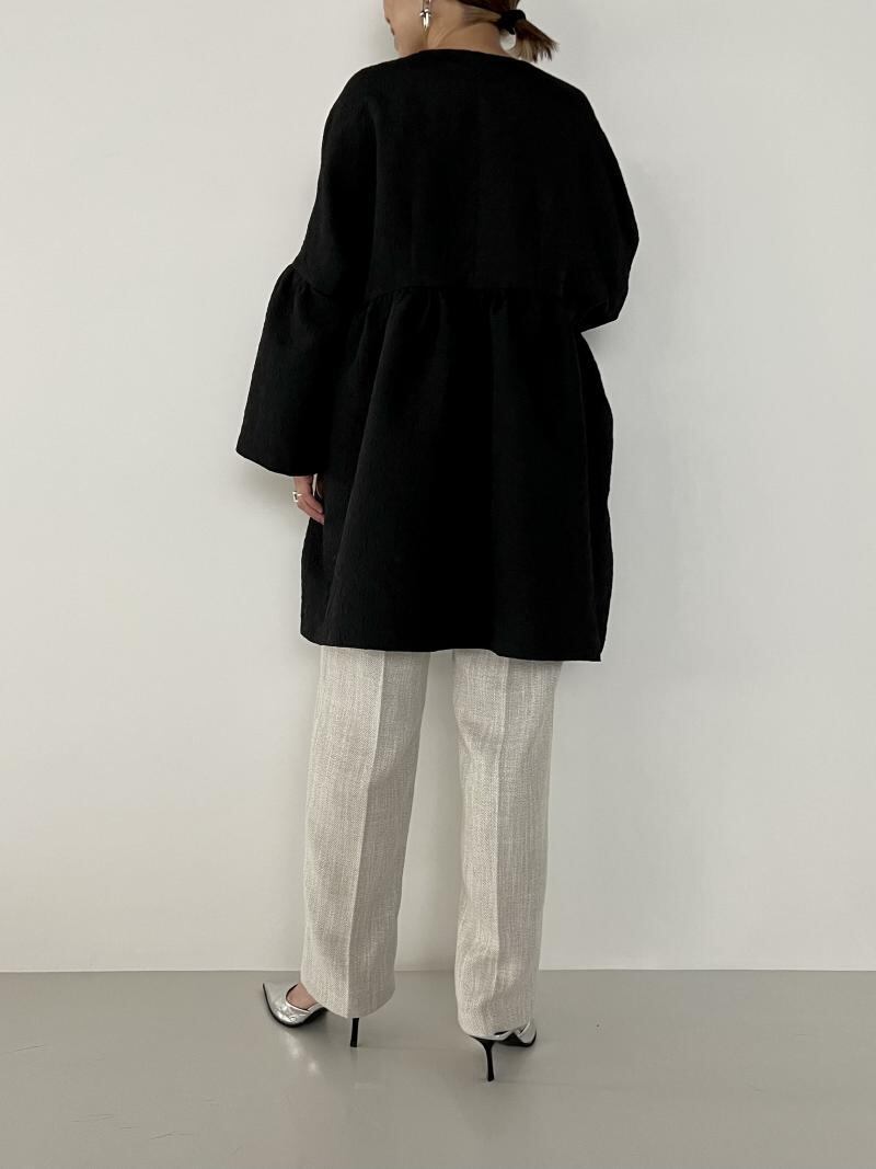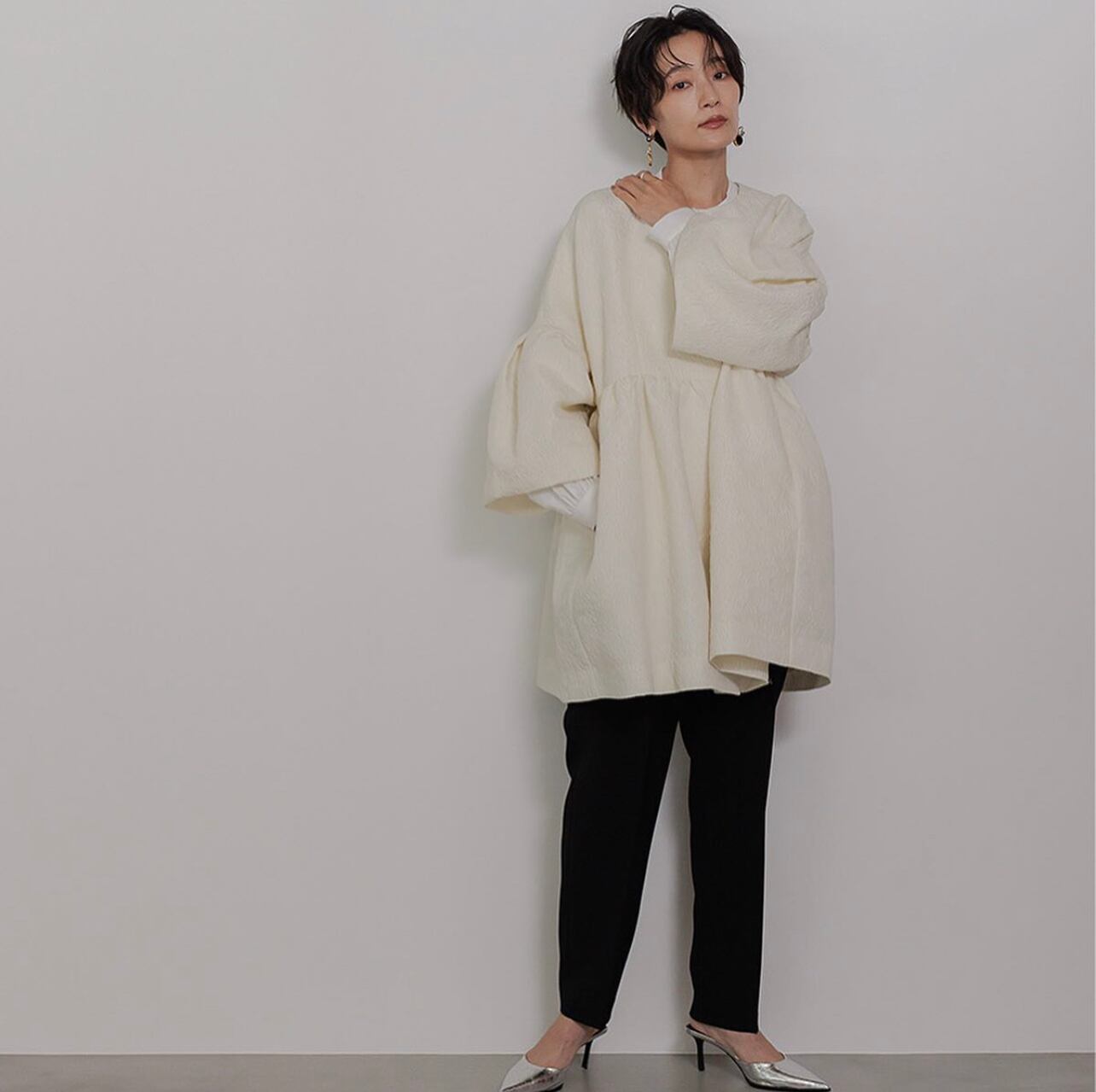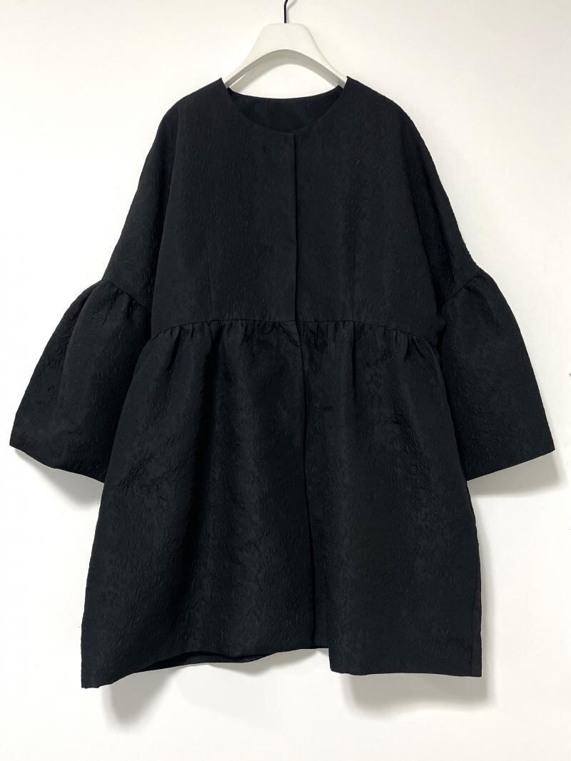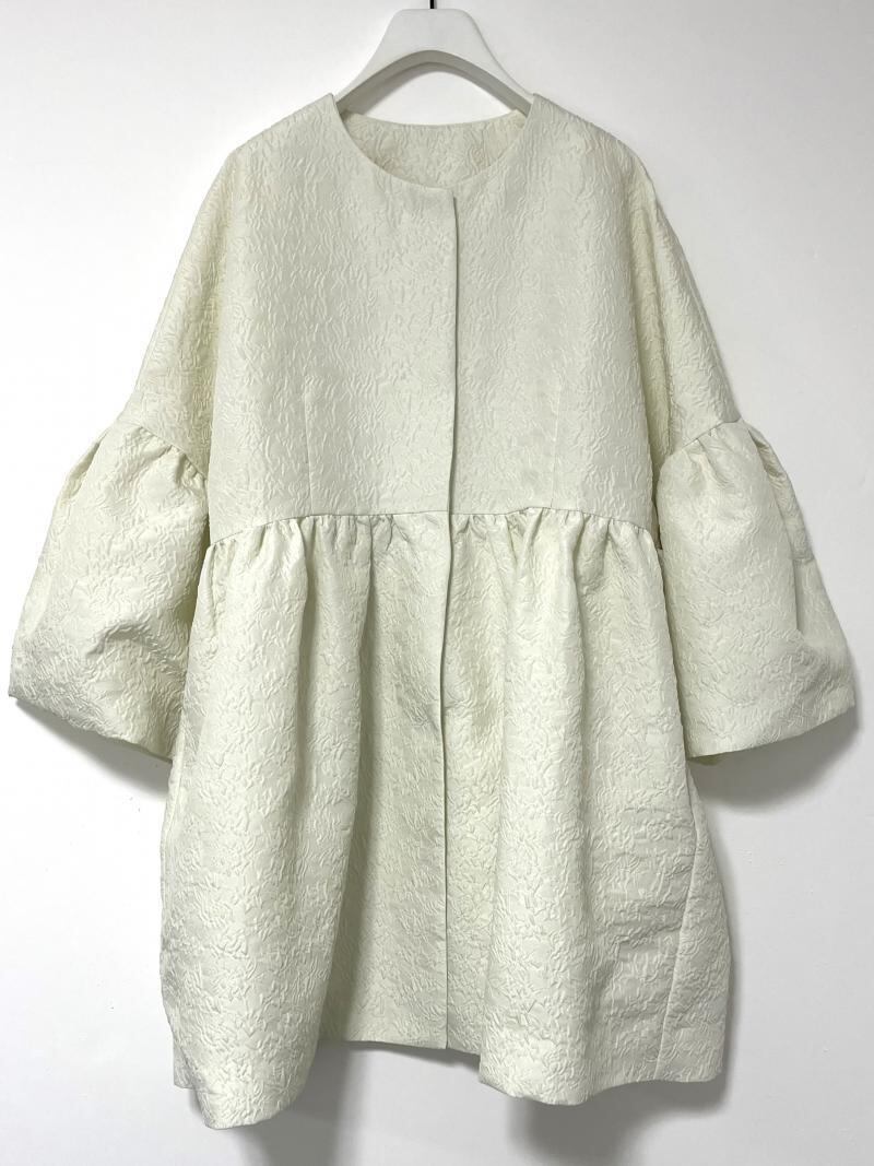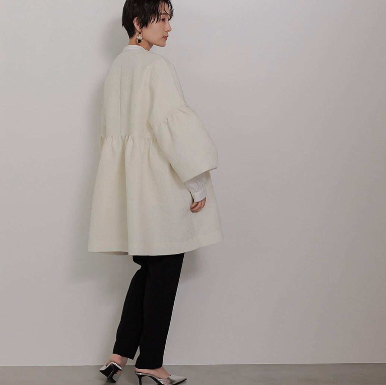 凹凸のあるハリ素材で、ボリューム感がかわいい膨れジャガードのコートになります。