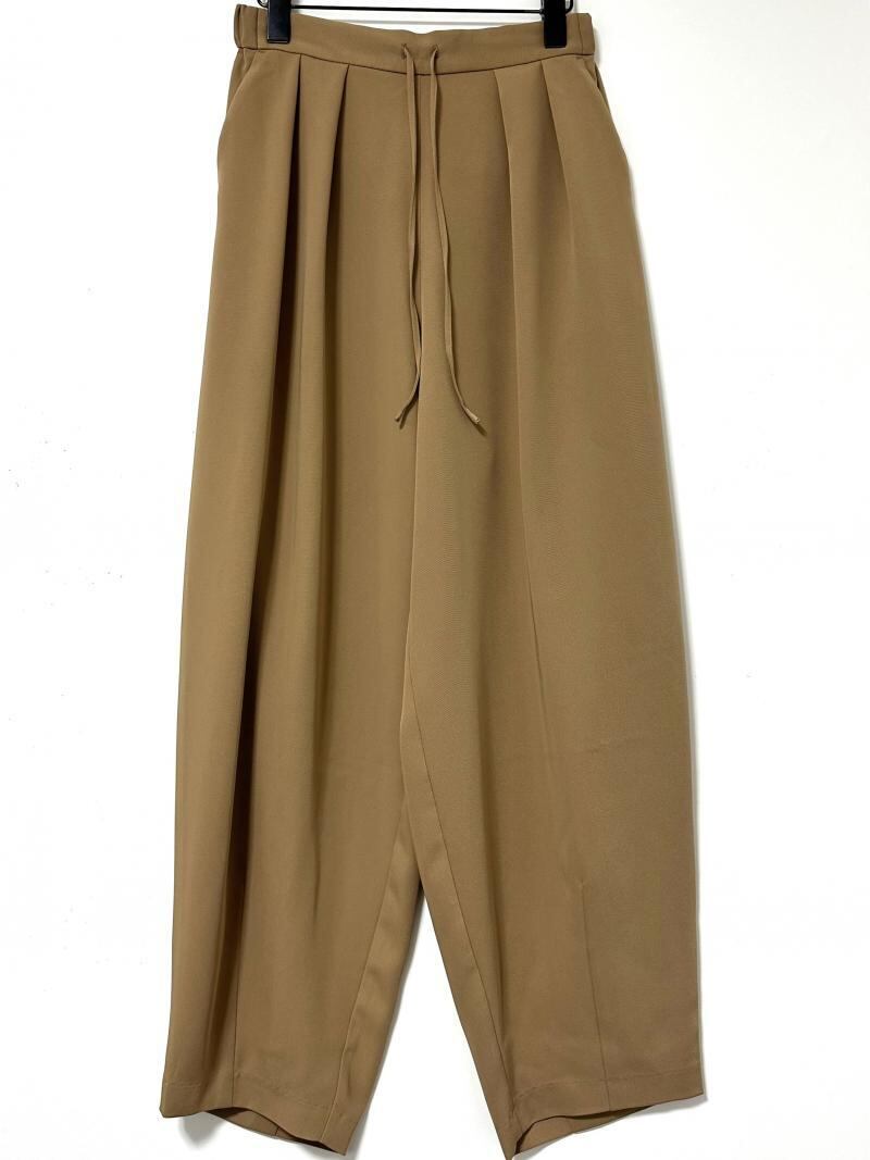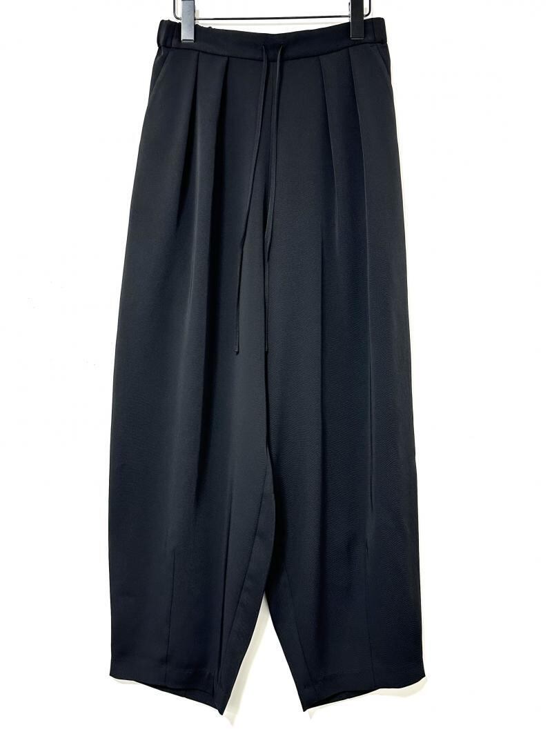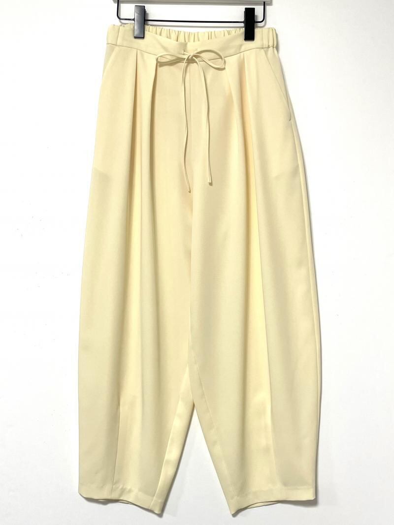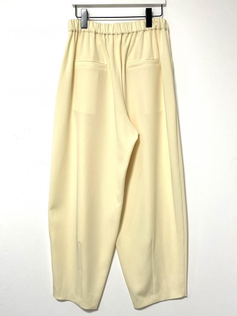 丸いシルエットが鮮烈な印象のワイドパンツ。フロントに施したタックや脇線でボリュームを出しながら、裾周りはダーツをとることですっきりとさせました。メリハリの利いた女性らしいシルエットを設計しています。ウエスト部分はゴム仕様にすることでリラックスな着心地に。フロントの共布テープでサイズの調節も可能なところもポイントです。