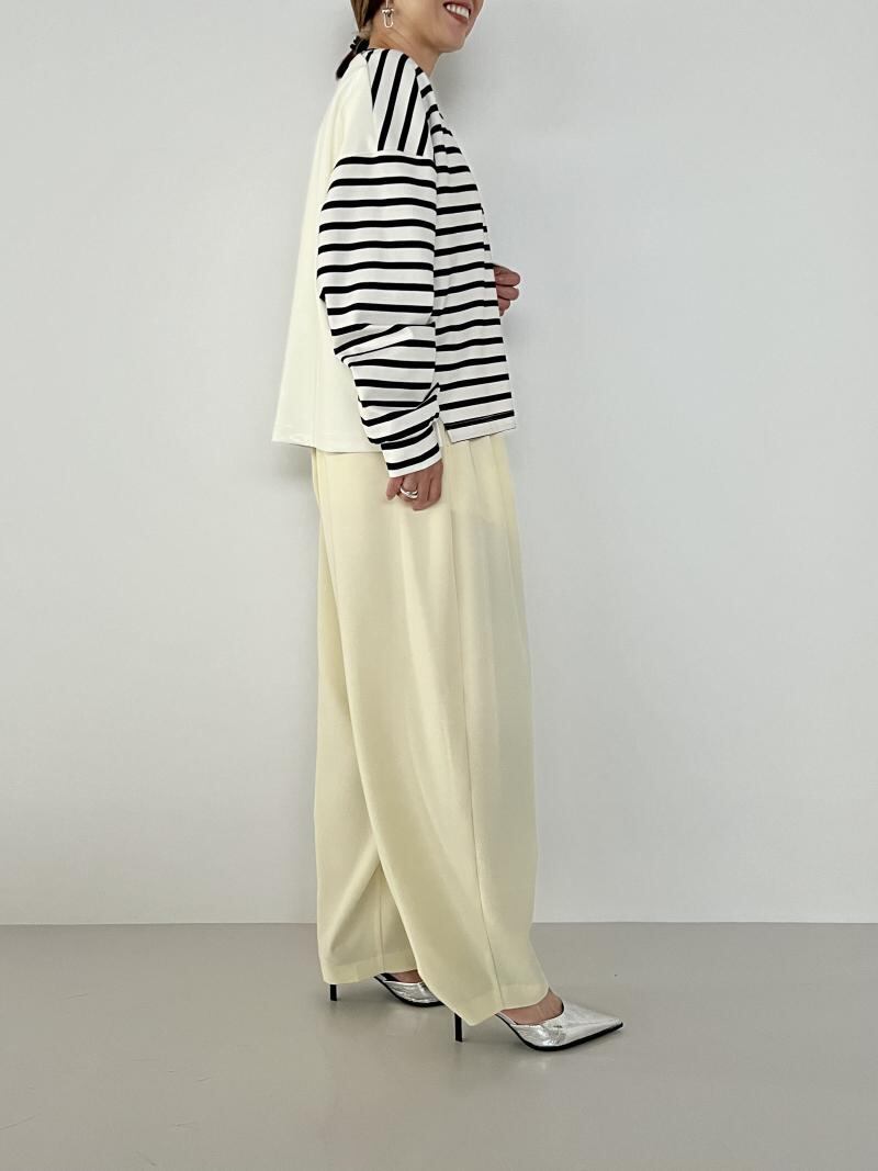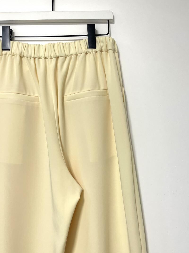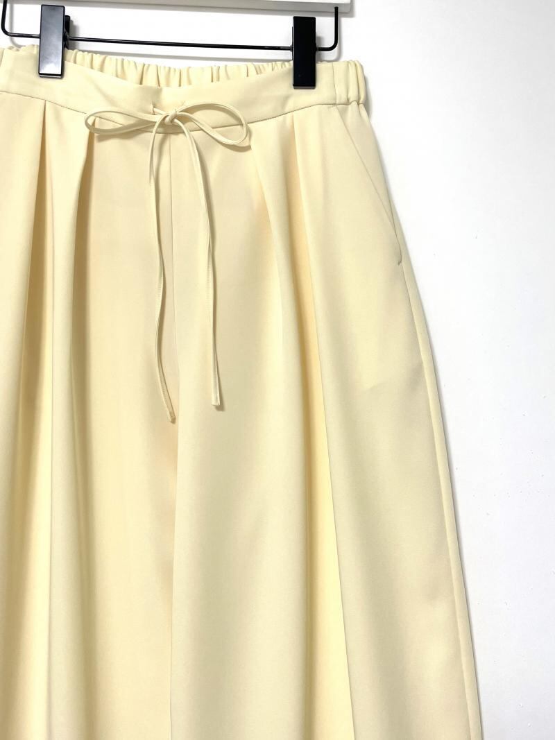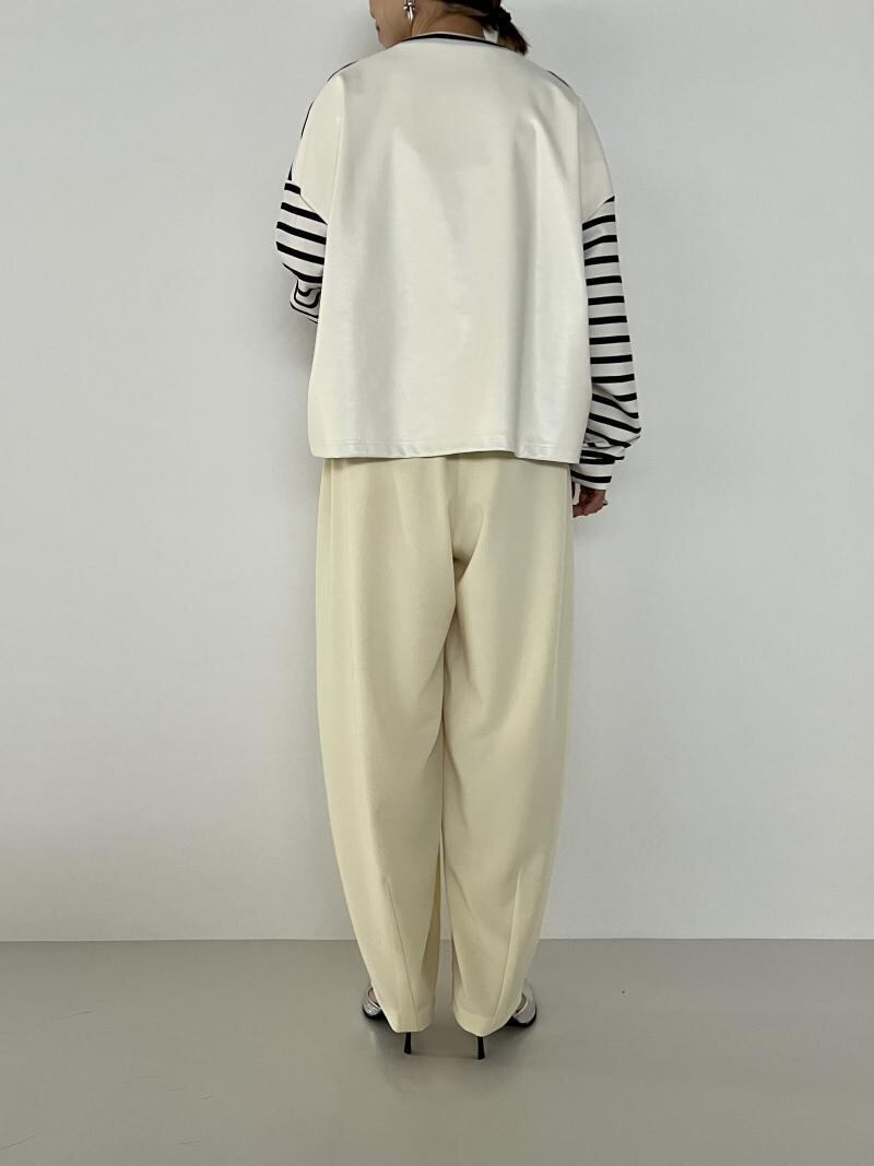 丸いシルエットが鮮烈な印象のワイドパンツ。フロントに施したタックや脇線でボリュームを出しながら、裾周りはダーツをとることですっきりとさせました。メリハリの利いた女性らしいシルエットを設計しています。ウエスト部分はゴム仕様にすることでリラックスな着心地に。フロントの共布テープでサイズの調節も可能なところもポイントです。