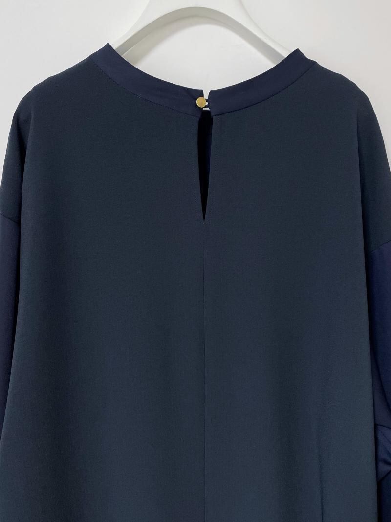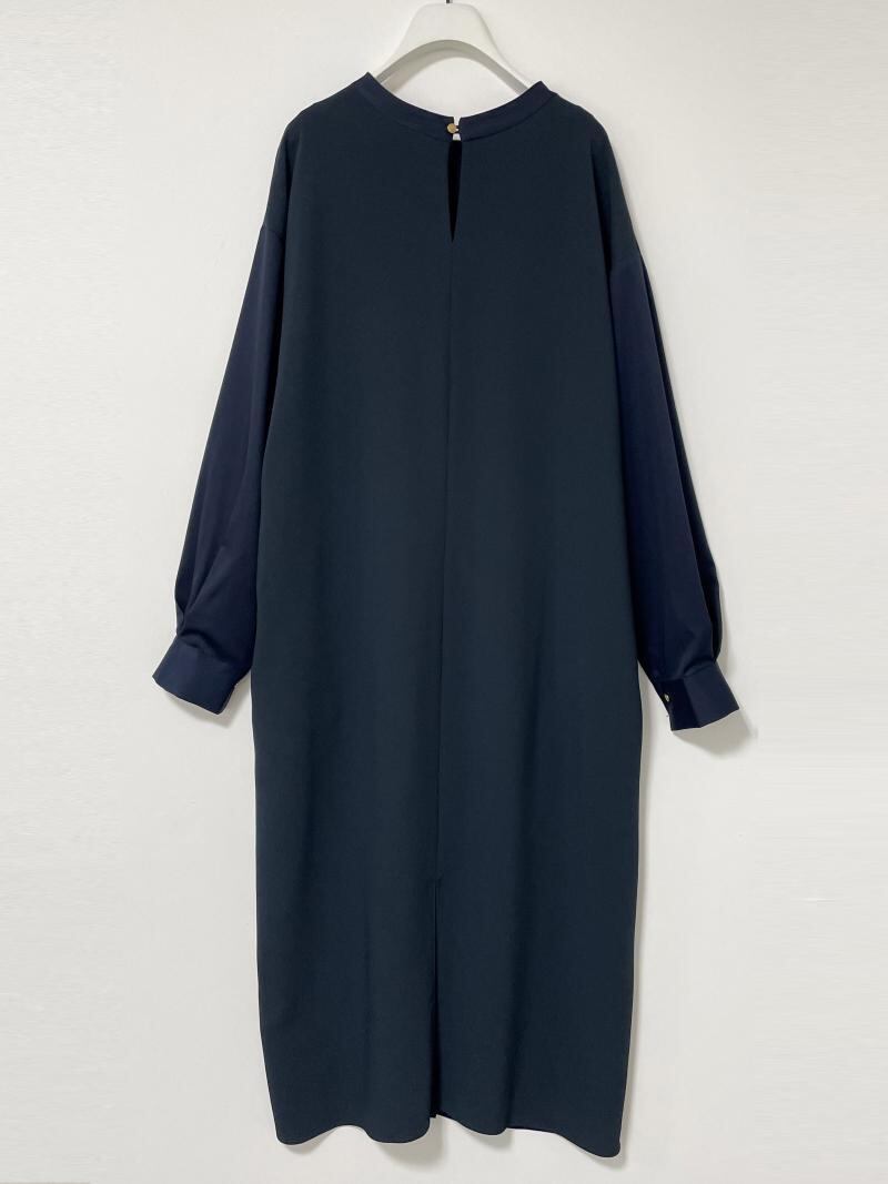 程よく光沢のある柔らかいツイル素材と、ジョーセットの様な膨らみのある素材のドッキングワンピースです。