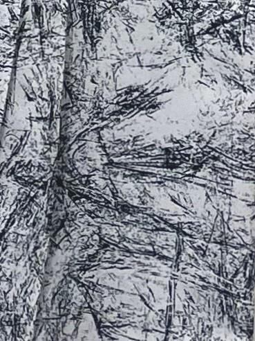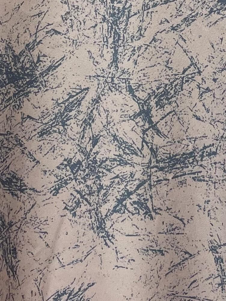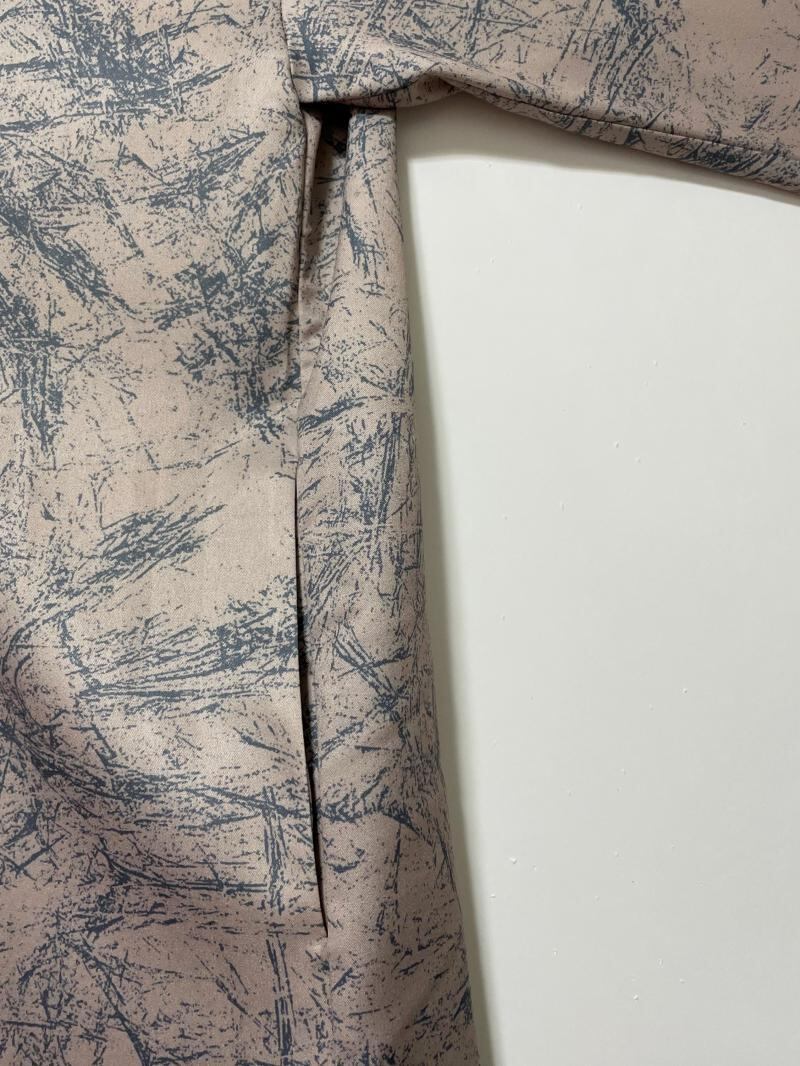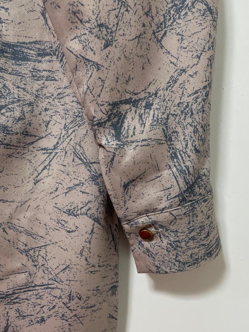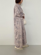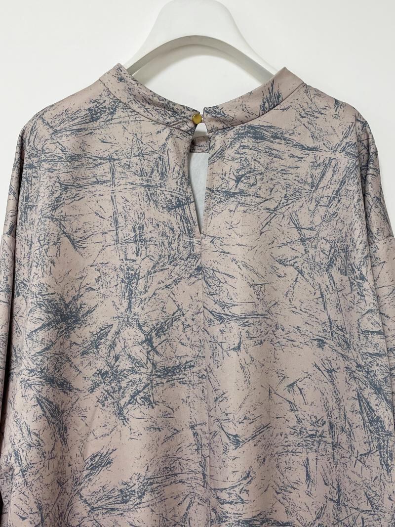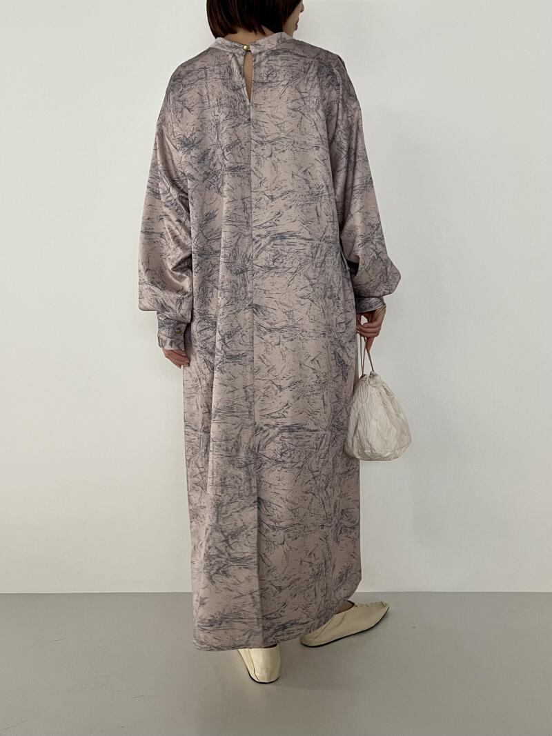 ブラシの様な抽象柄プリントと光沢感の有るサテン地が上品なワンピースです。
