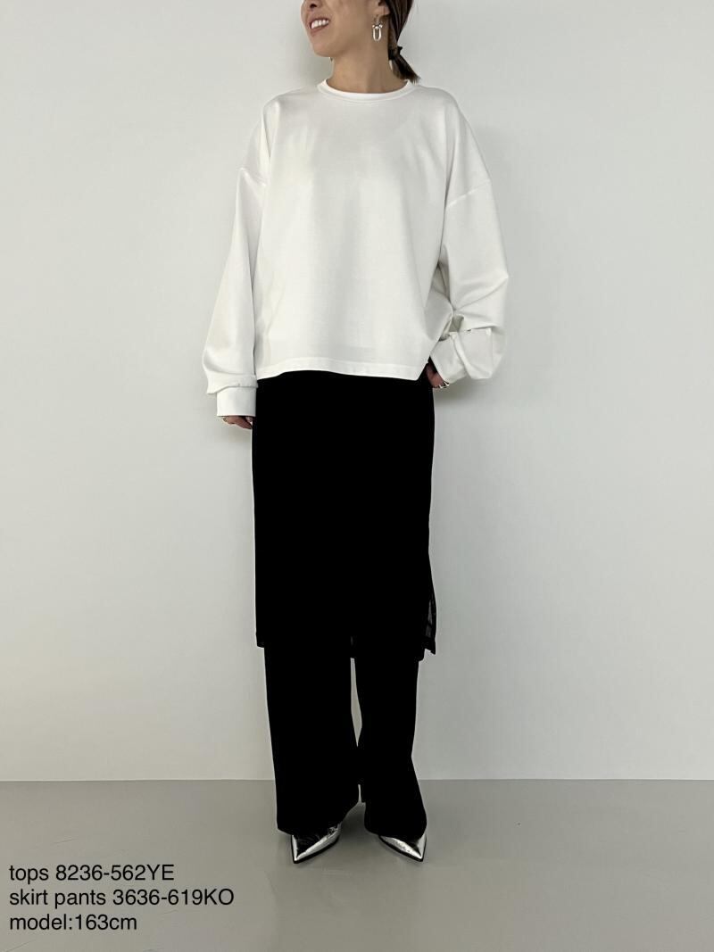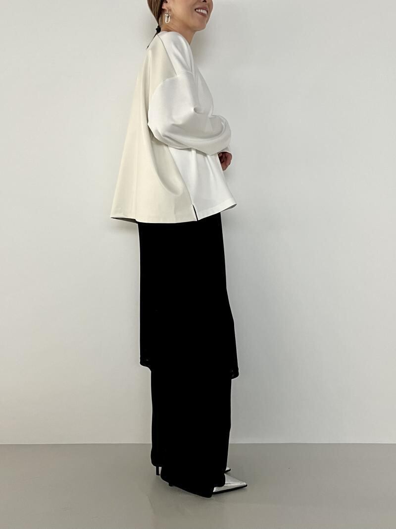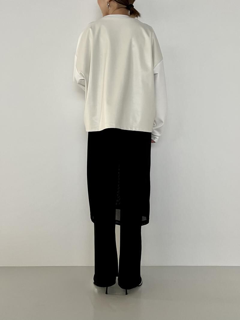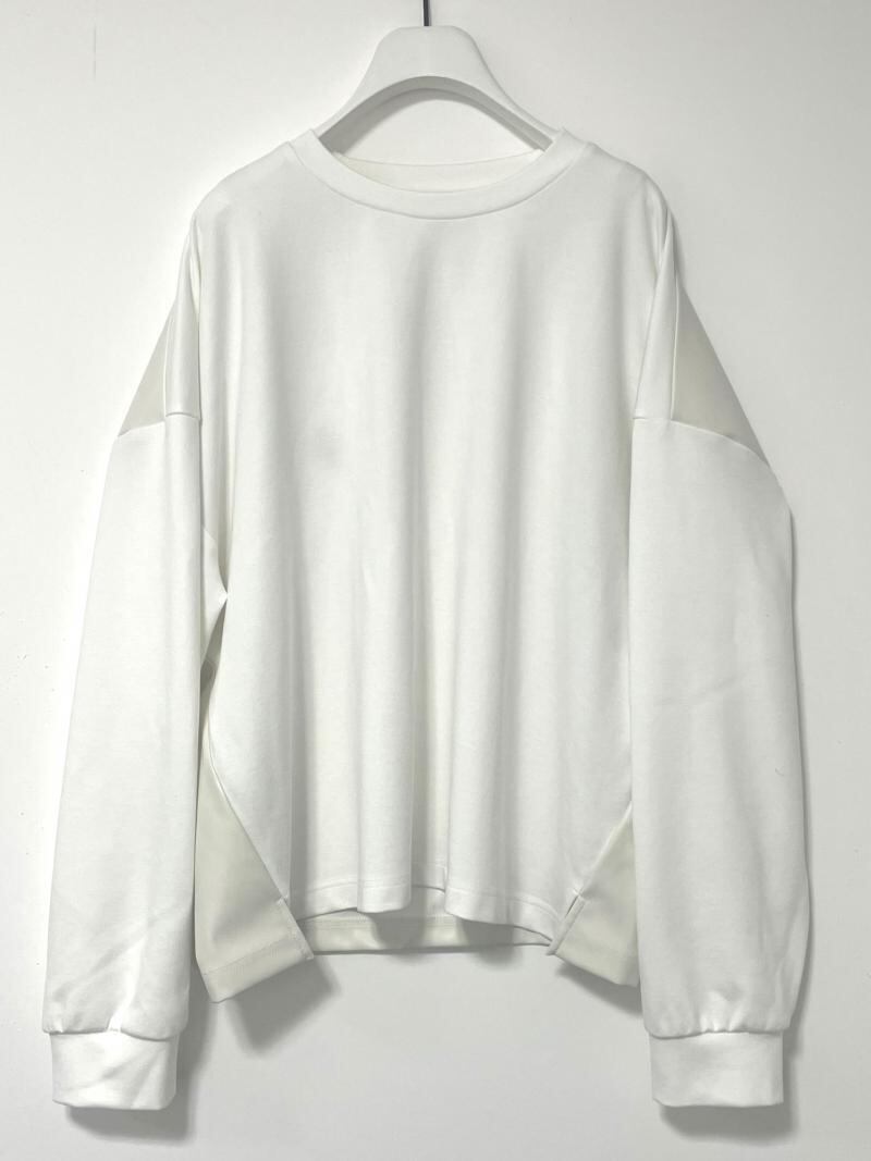 後ろ身頃にフェイクレザーを採用することでカットソーでもシャープな印象に仕上げました。