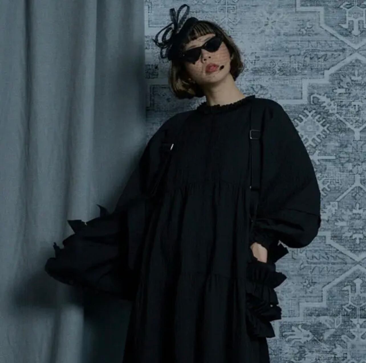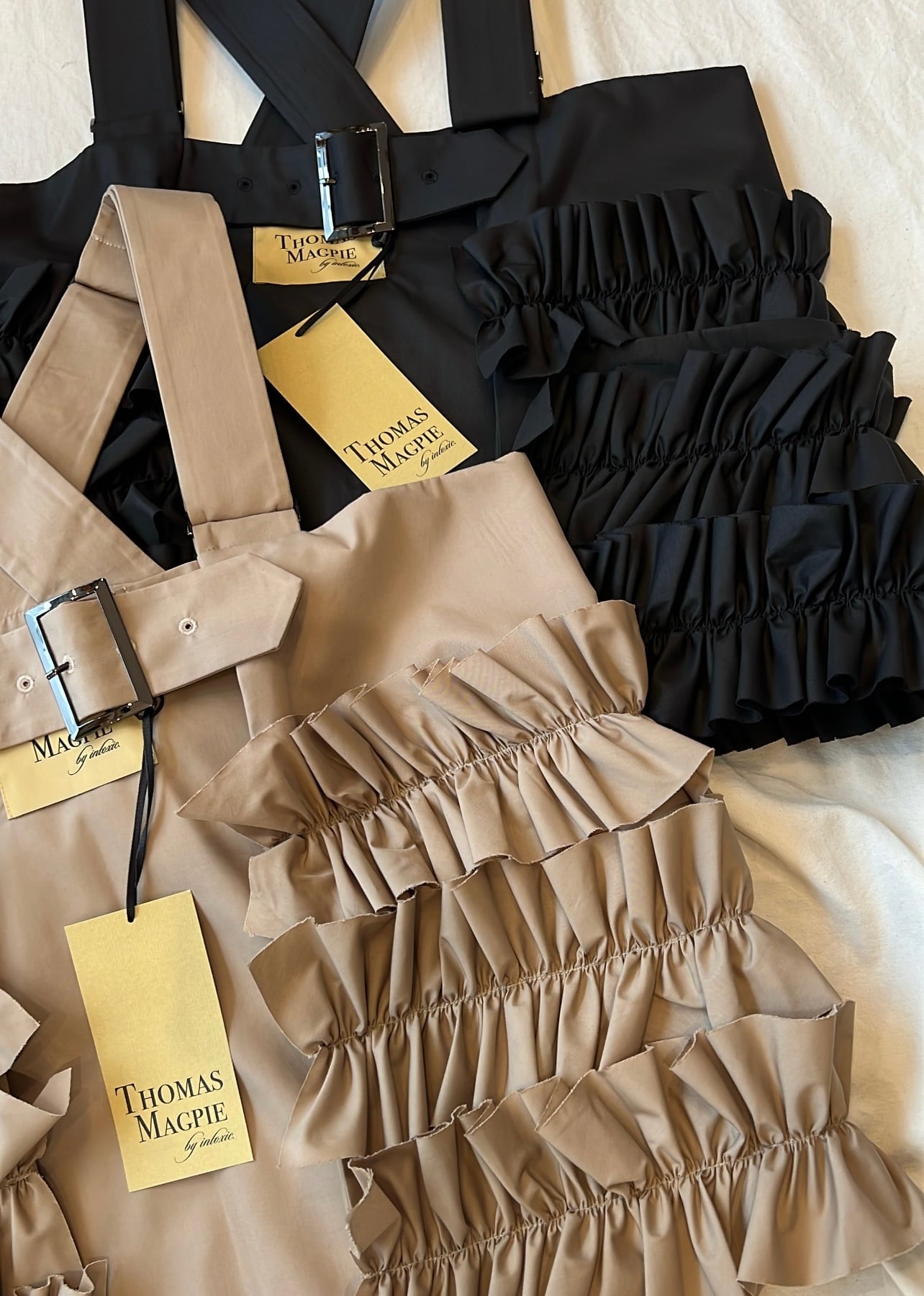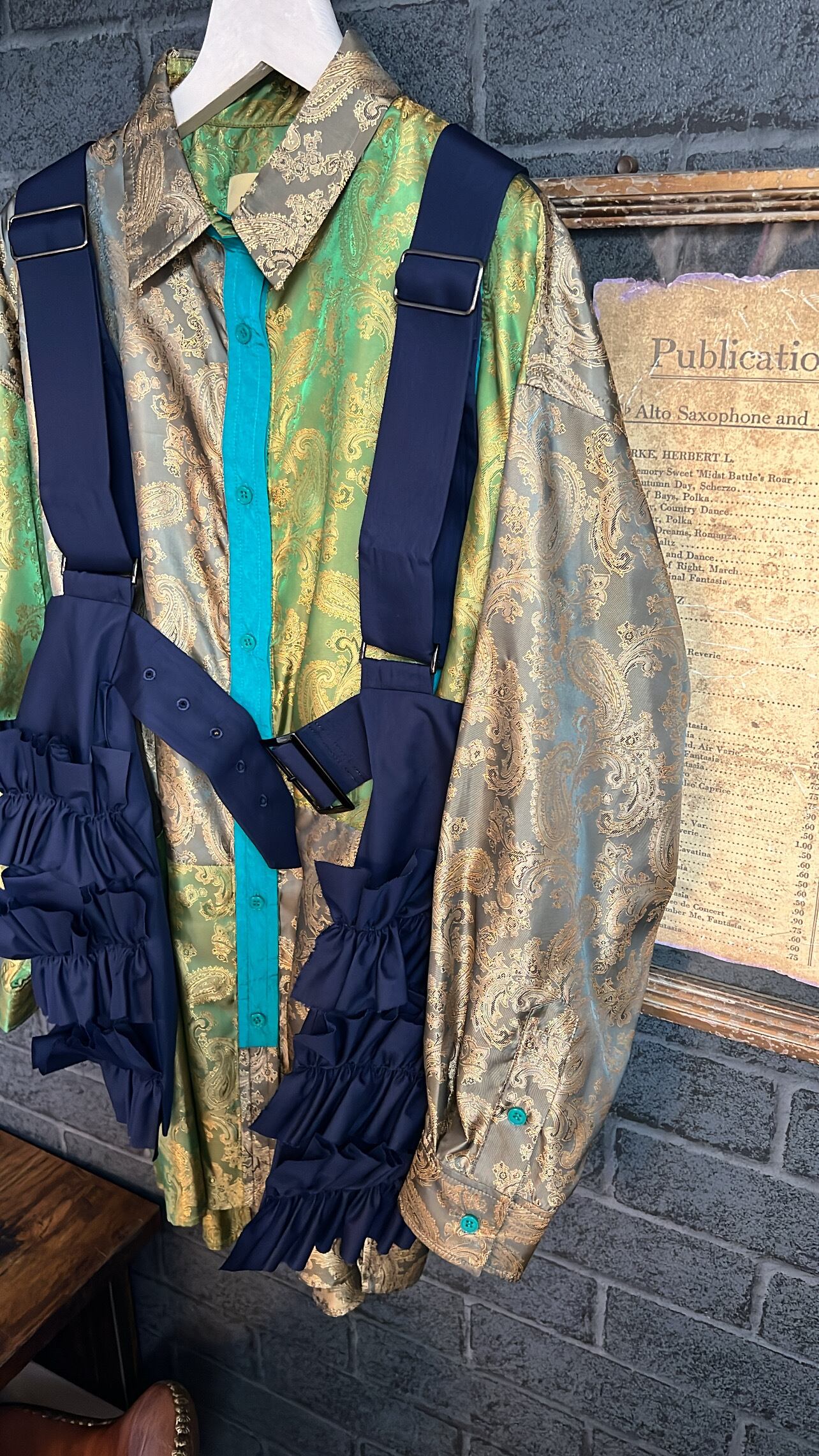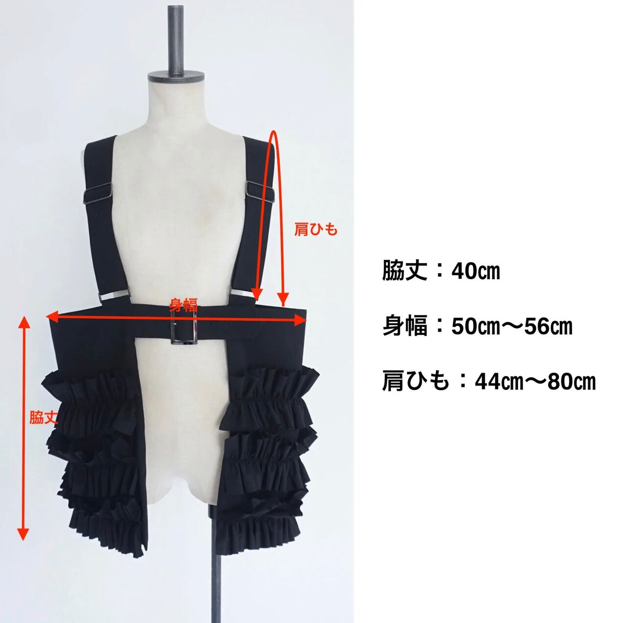 生地は芯をしっかりと貼って仕上げています。胸のベルトでサイズも調節ができます。シンプルなシャツやTシャツなどあらゆるお洋服に加えると変化ができ、楽しめる1枚になると思います。フリル部分に隠しポケットが付いています。なのでポケットのないワンピースやスカートに合わせて着ると、ポケットとしても便利に使うことが出来るようにしました。白いTシャツとロングスカートなどに合わせてみてください。コーディネートに華やぎが出ると思います。普通のお洋服の着方に飽きてきたという方にぜひ。オーバーサイズでTシャツの上に着たり、コートの上からでも羽織る事が出来て味付けするのに本当に楽しめる1枚です。