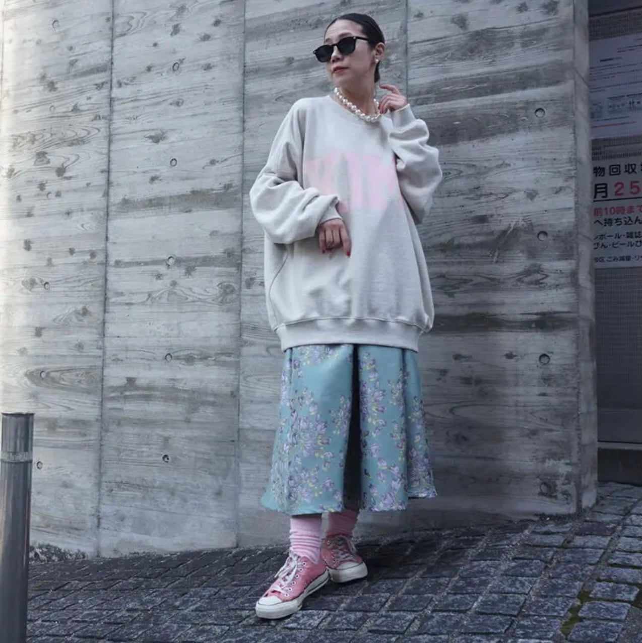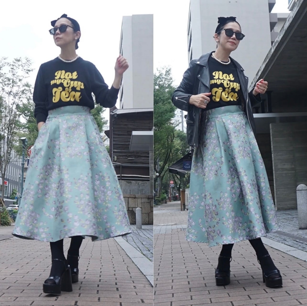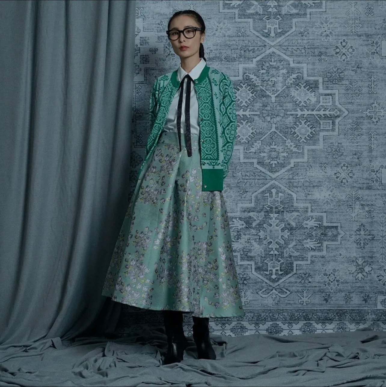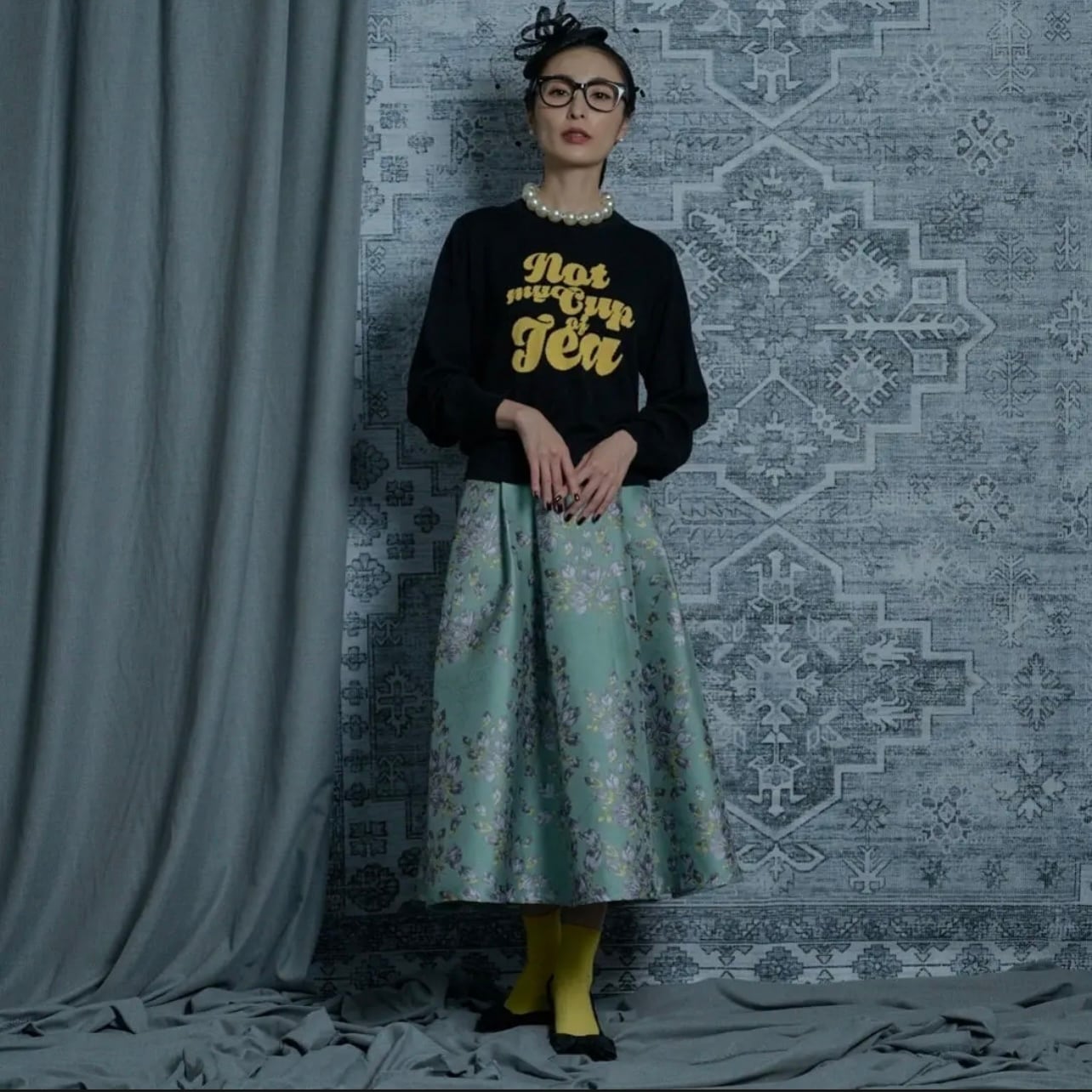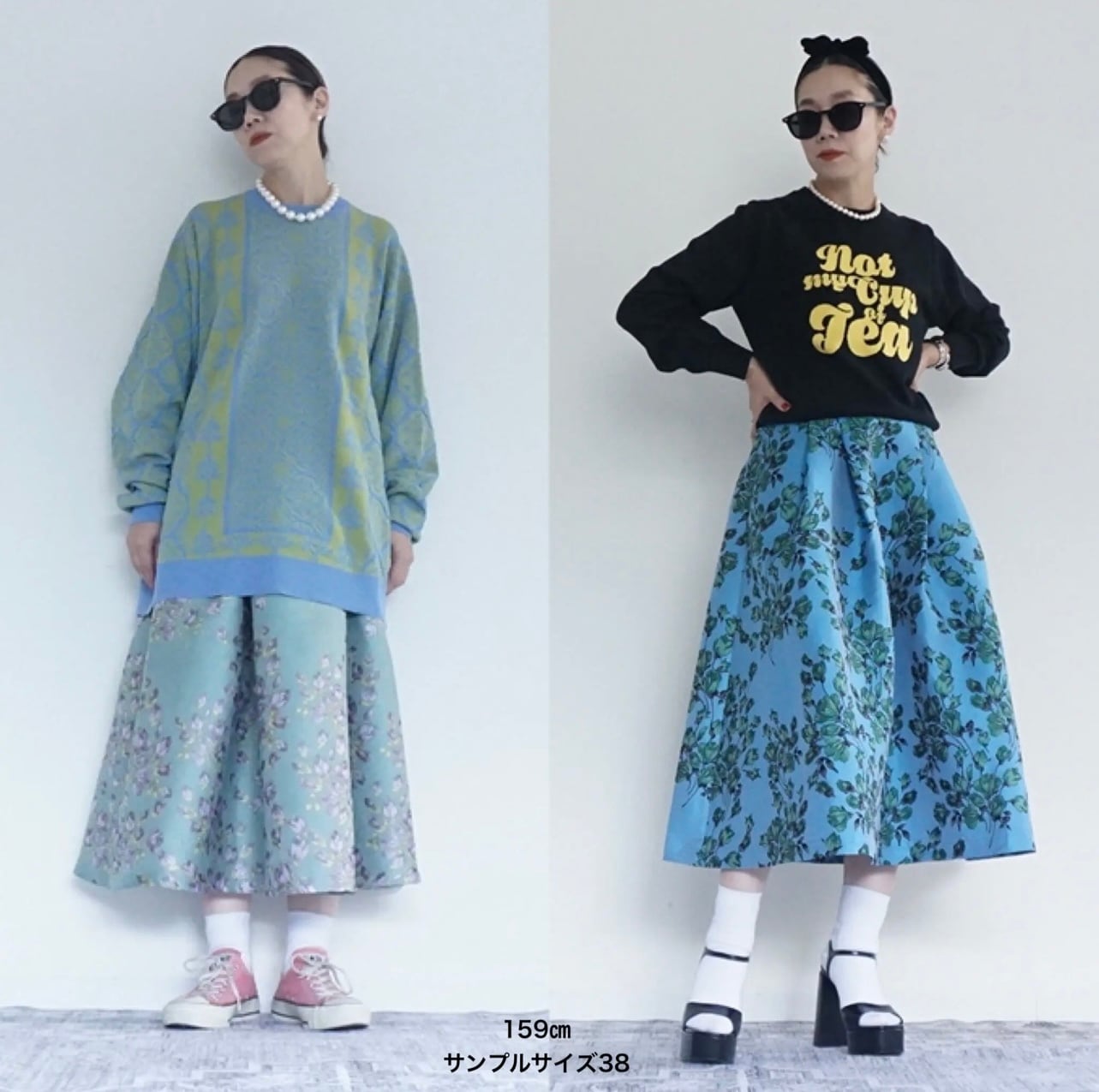 織が美しい、花柄のジャガード生地を使い、タックスカートを作りました。厚みのあるベルトでジャストウエストにしました。腰の位置が高くみえ、スタイルアップして見えます。またジャガードの厚み、光沢感と柔らかな花柄の色味が魅力的です。タックの広がりがとてもクラシックな印象で、とても気に入っています。以前も出しているタックスカートをアレンジしています。今回は生地が厚いので広がりがあり、とても高級感がありました。クラシックに着るのも素敵ですが、もし今着るなら、ちょっとカジュアルなニットやスウェットなどで着てもかわいいかなと思い、モデルのルックはちょっとカジュアルなコーディネートで提案しています。きちんと着用するならば、トップスにシンプルでコンパクトなニットにパールのネックレスなどを合わせてみたいと思いました。ジャストウエストですが、オーバーサイズのニットなどを合わせるスタイルも良いと思います。広がりがあり、下半身の体型を拾わないので、ヒップや太ももが気になる方にも向いています。