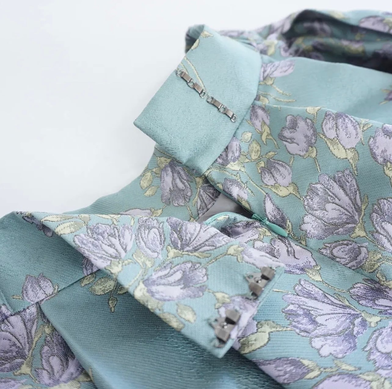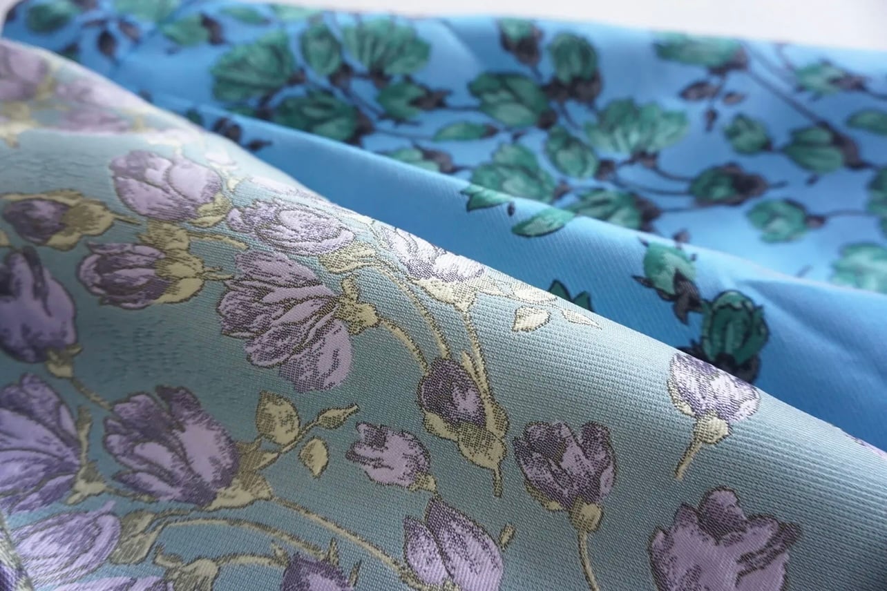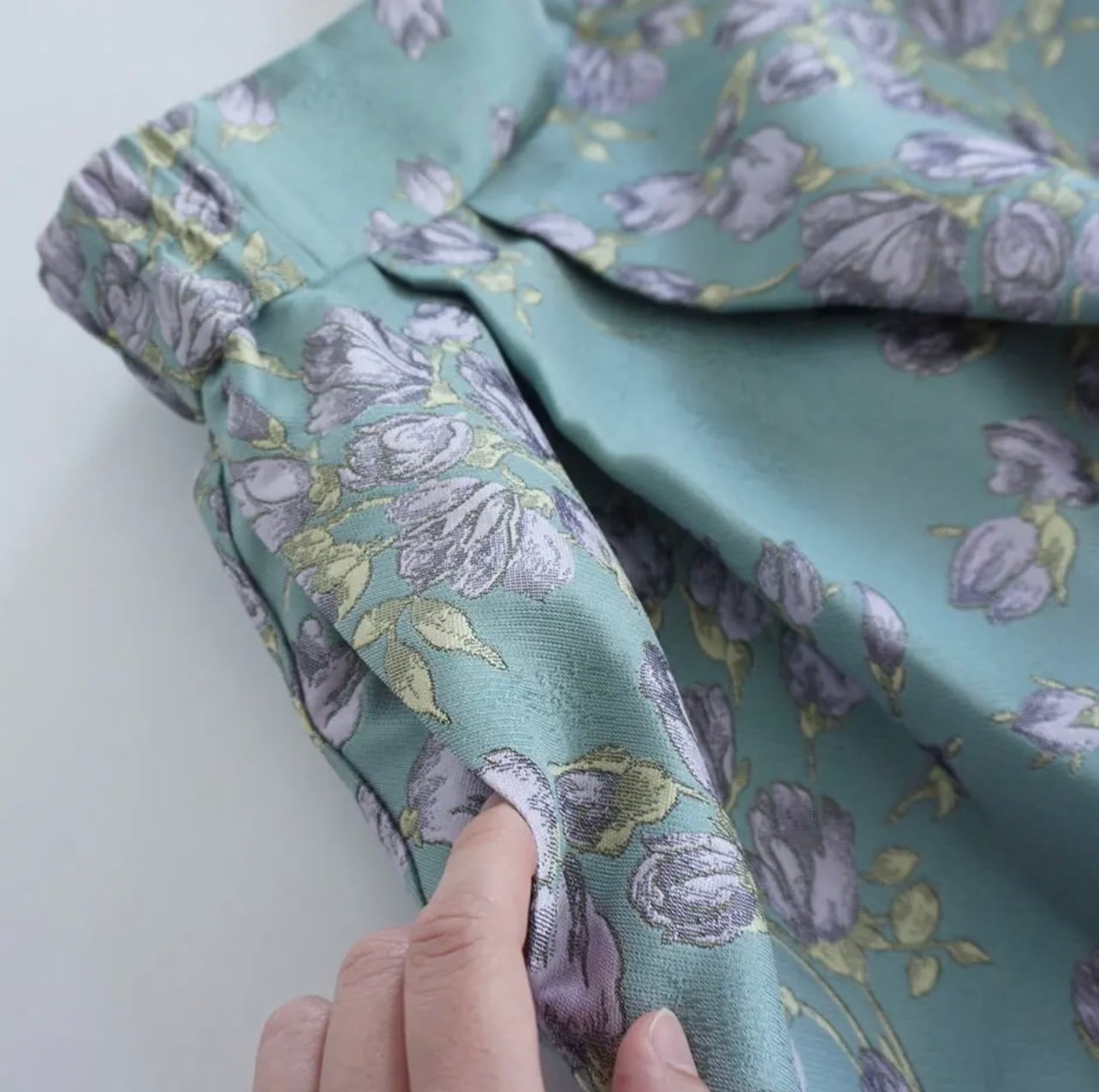 今回今まではあまり使わなかった花柄をピックアップしました。今回のテーマの”花”のキーワードからピックアップしています。可愛らしく上品な雰囲気のある花柄のジャガードは生地から選んでデザインをスタートしたもの。このしっかりと厚みのある素材と、タックスカートのデザインがキレイにハマり、良い仕上がりになったのではないかなと、サンプルが出来上がった瞬間に思いました。これまであまりスカートを履かなかった方にもチャレンジしてもらいたい。気分の変わるリッチな雰囲気のスカートです。私はミントをオーダー予定です。