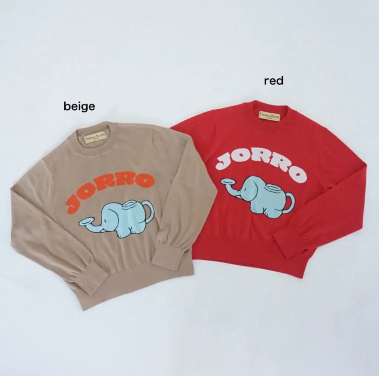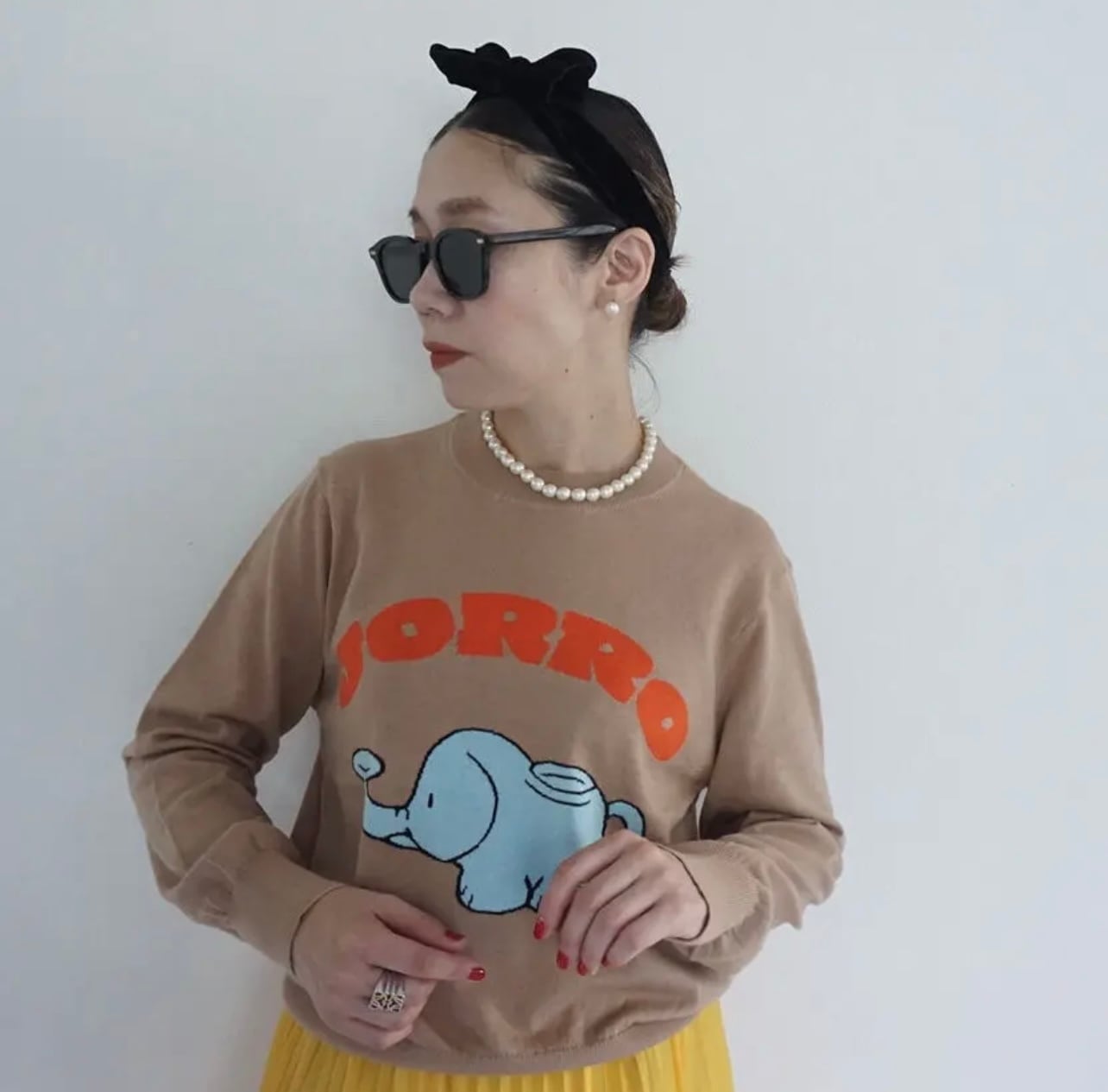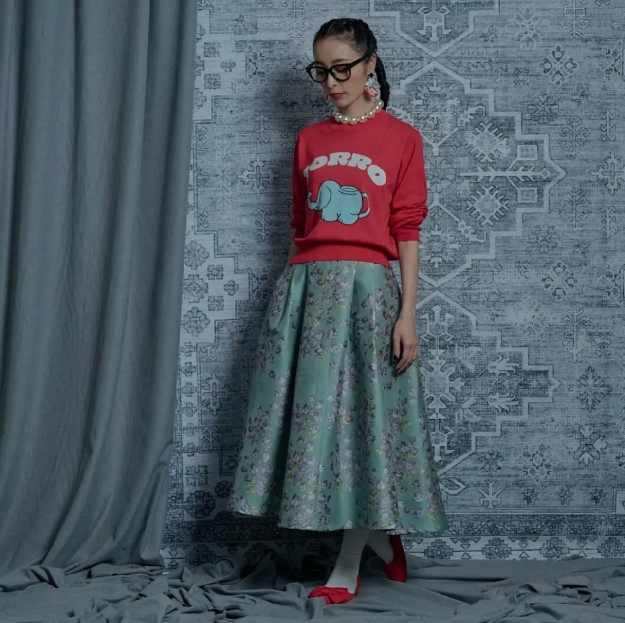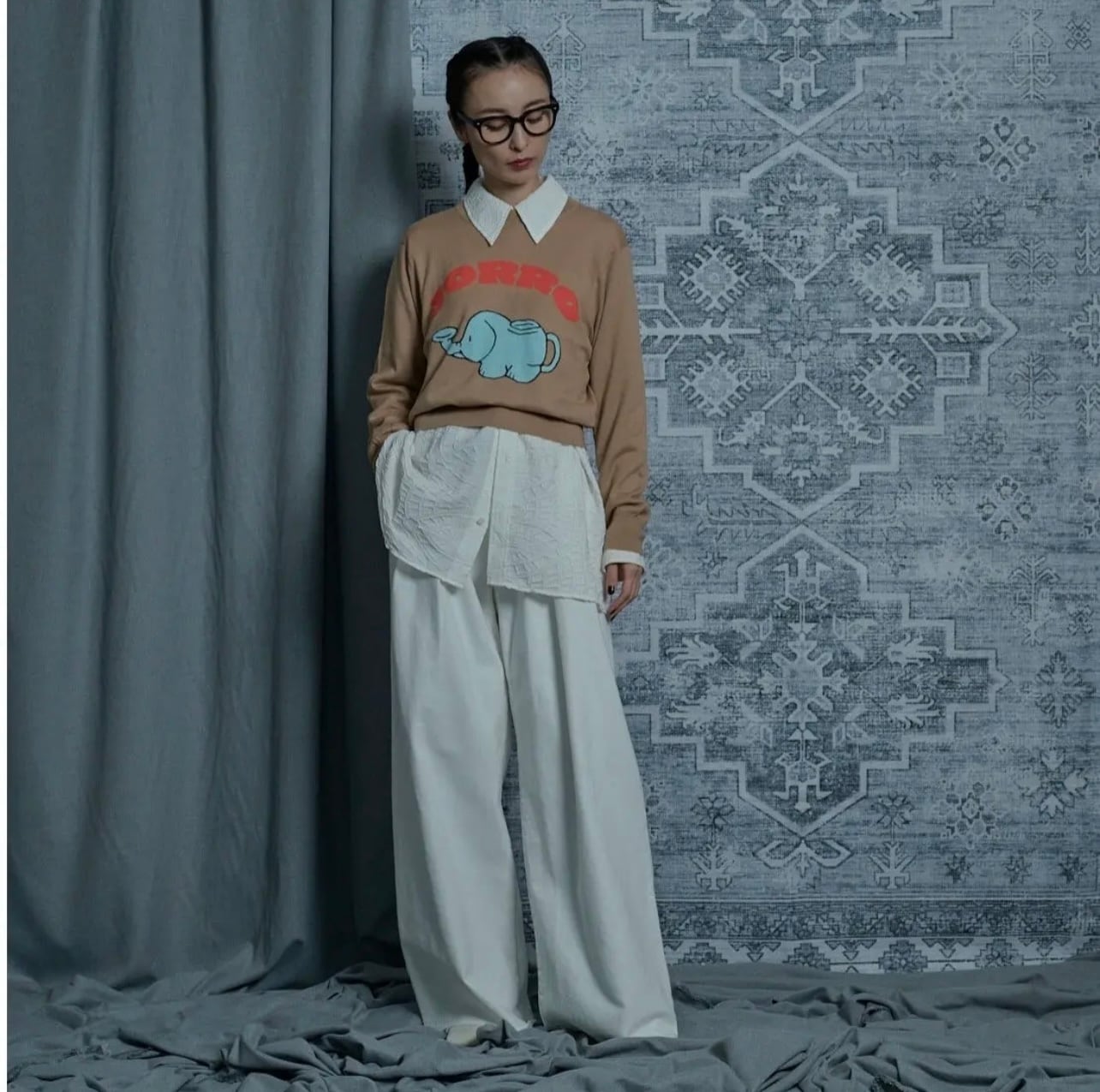 象ってかわいいよね、という話から、象が好きなファンシークリエーター の末永氏が絵を描いてくれました。末永氏は今回のコレクションテーマに大きく影響を与えていて、”君の好きな花”というコンセプトストアを運営している人物です。ゾウのジョウロは馴染みがあって懐かしい。末永氏からもらった絵に私が塗り絵のごとく、カラーを付けてニットの絵を仕上げました。コラボレーションのニットです。これまで手描きのウサギなどを描いたりしましたが、以前からそのポップな絵の雰囲気に傾倒していて、魅かれるものがあります。今回も動物でいきたいというお話をして、末永氏の好きなゾウのジョウロの絵をニットにしました。ポップなカラーがとても気に入っていて、ベージュとレッドを展開します。特にベージュのオレンジのロゴはいい配色にできたような気がします。カジュアルなコーディネートだとちょっと子供っぽさが出てしますので、こちらもスカートにヒールなどの大人の遊び心の感覚で着ていただけたらファッション性があって素敵ではないかな?と思いました。