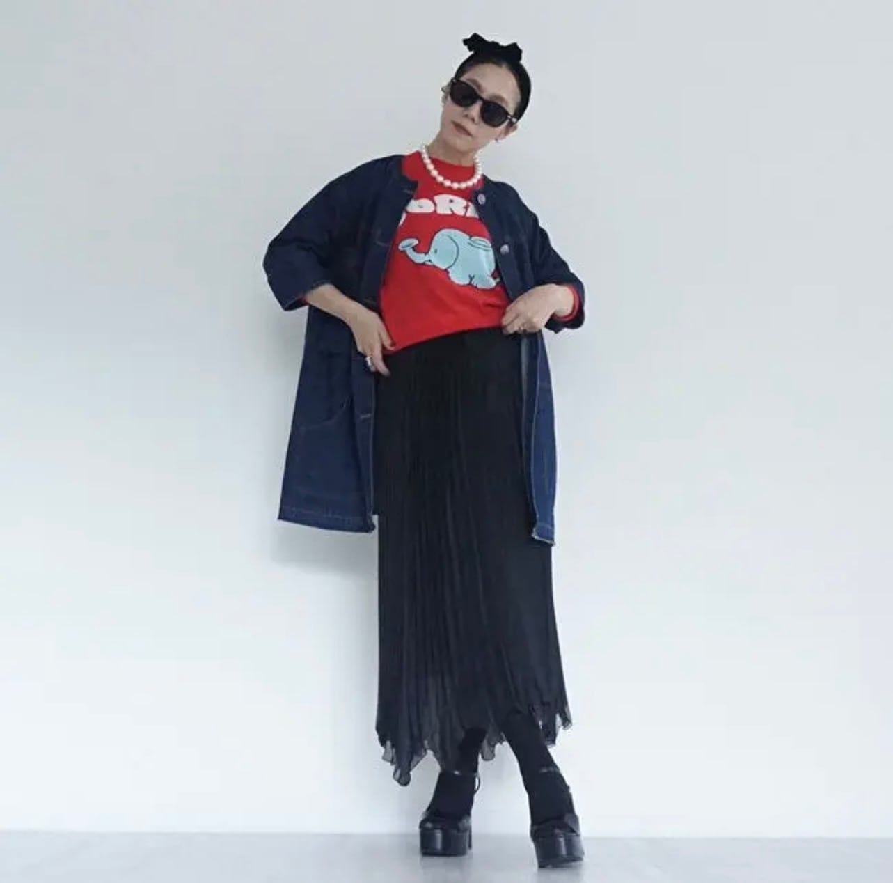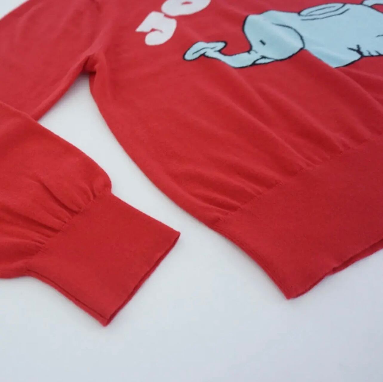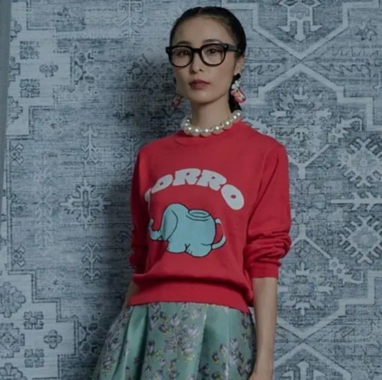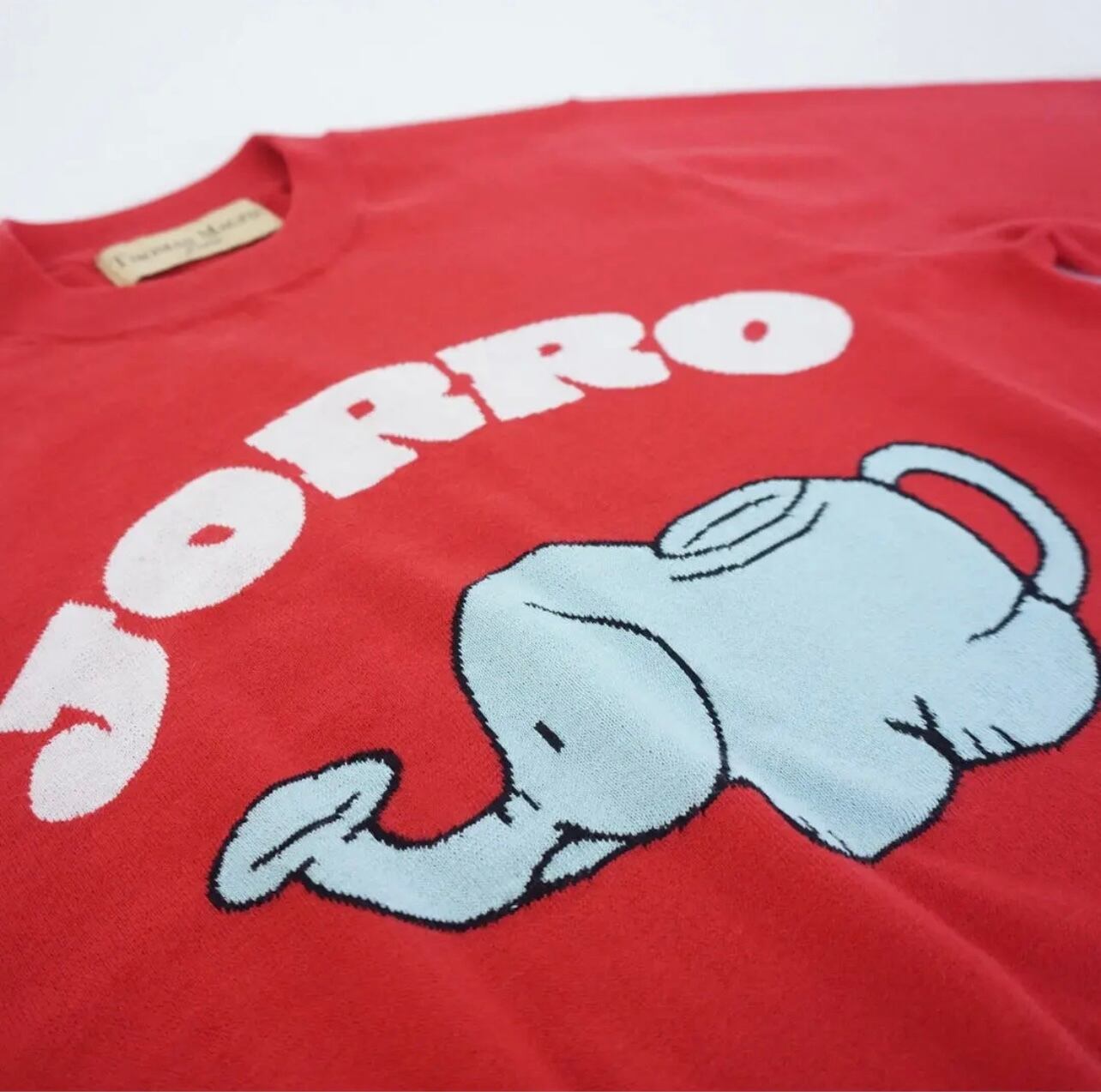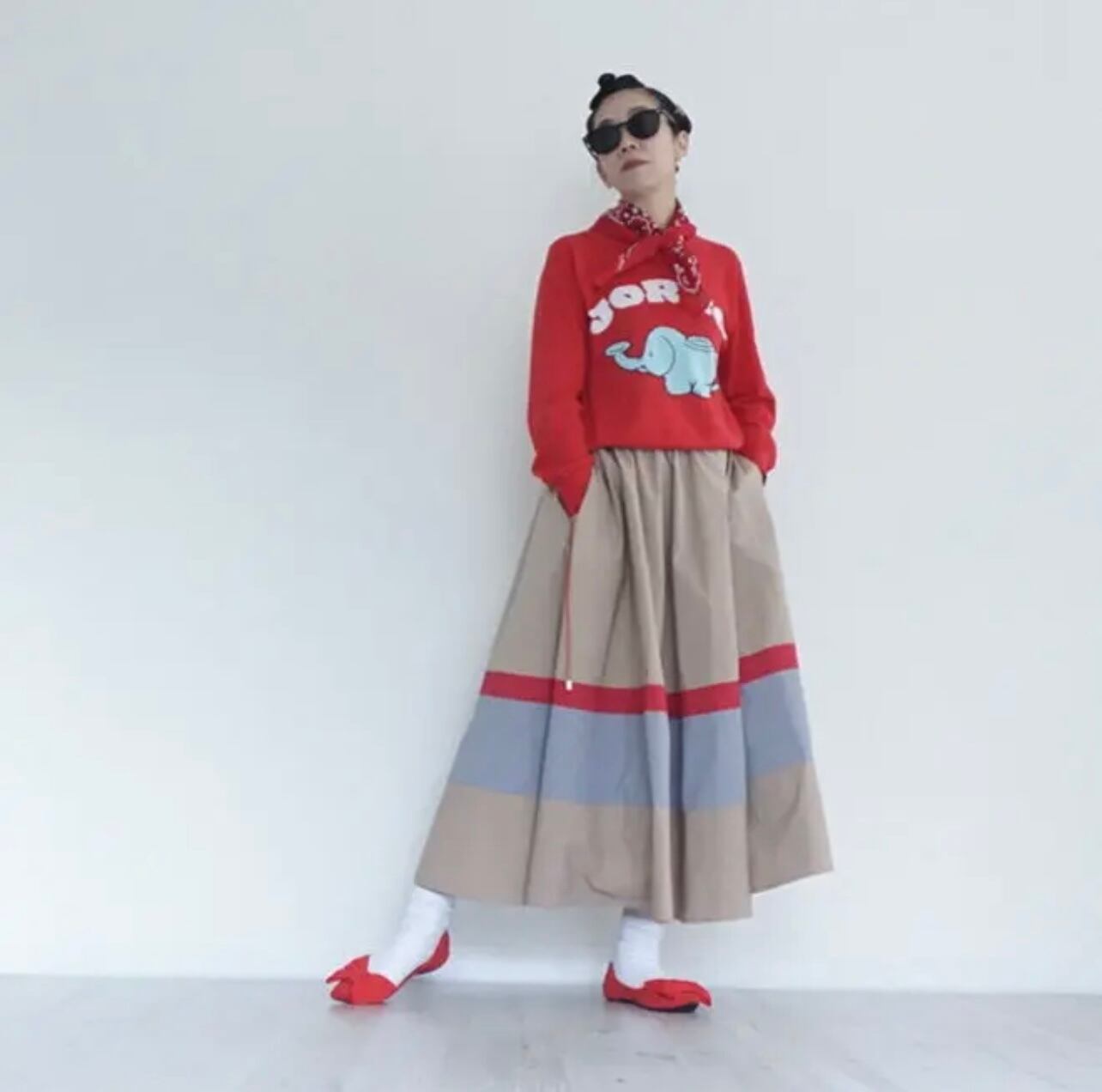 象ってかわいいよね、という話から、象が好きなファンシークリエーター の末永氏が絵を描いてくれました。末永氏は今回のコレクションテーマに大きく影響を与えていて、”君の好きな花”というコンセプトストアを運営している人物です。ゾウのジョウロは馴染みがあって懐かしい。末永氏からもらった絵に私が塗り絵のごとく、カラーを付けてニットの絵を仕上げました。コラボレーションのニットです。これまで手描きのウサギなどを描いたりしましたが、以前からそのポップな絵の雰囲気に傾倒していて、魅かれるものがあります。今回も動物でいきたいというお話をして、末永氏の好きなゾウのジョウロの絵をニットにしました。ポップなカラーがとても気に入っていて、ベージュとレッドを展開します。特にベージュのオレンジのロゴはいい配色にできたような気がします。カジュアルなコーディネートだとちょっと子供っぽさが出てしますので、こちらもスカートにヒールなどの大人の遊び心の感覚で着ていただけたらファッション性があって素敵ではないかな?と思いました。
