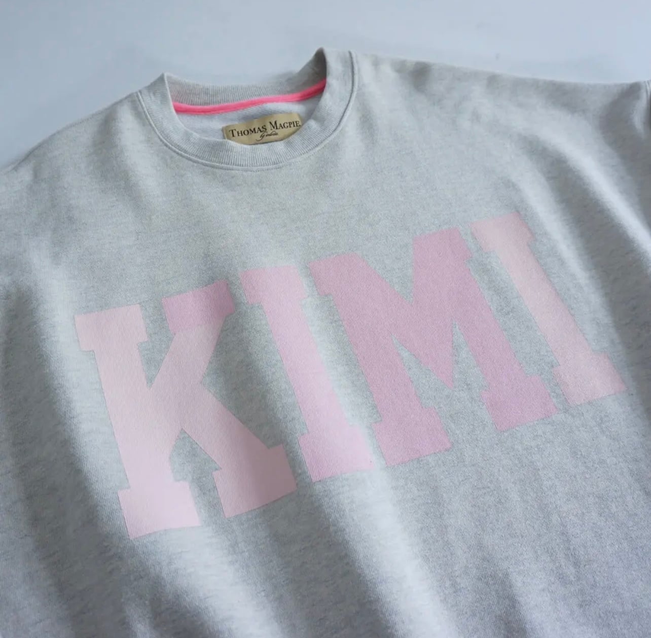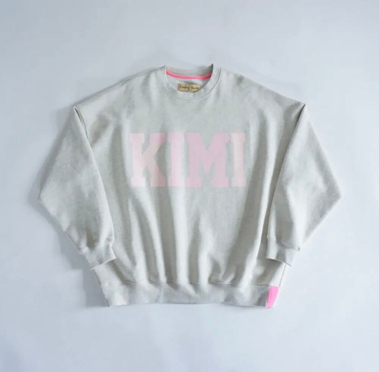福岡のコンセプトストア”君の好きな花”とのコラボレーションスウェット。今回はある出会いから、君の好きな花を運営するマルチな才能を持つファンシークリエイターの末永氏と意気投合の末にコラボレーションが叶いました。末永氏が作ってくれたトーマスマグパイ とのコラボレーション。実はこの”君の好きな花”の定番のロゴKIMIの中にTM(Thomas Magpie)のイニシャルが薄い色味に変えてあり入っています。薄い色味の変化は分かりにくいのですが、そのさりげない変化がとても好きです。ボディのベースカラーはオートミール。ホワイトでもベージュでもない色味があまりないカラーだと思います。オリジナルボディでメンズのXLくらいのサイズです。体型は全く選ばず180cmくらいの男性でも着ていただけます。150cmくらいの女性はオーバーサイズで来てもらえるととても可愛いと思います。スウェットはこれまでも沢山出してきましたが、サイズ感も含め、特に気に入っていてコラボ企画でスペシャルなアイテムなので今回予約を受け付けます。