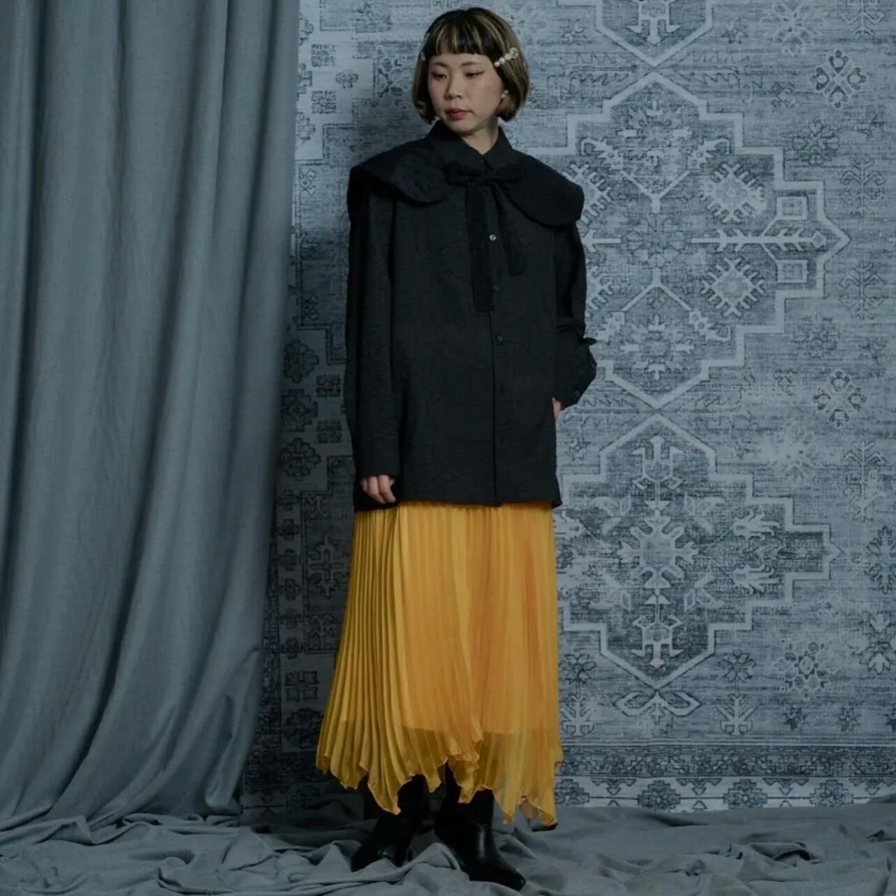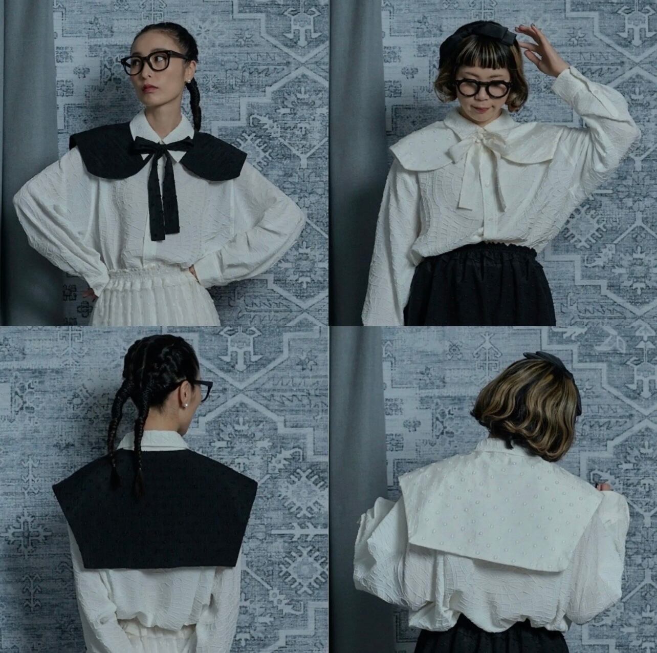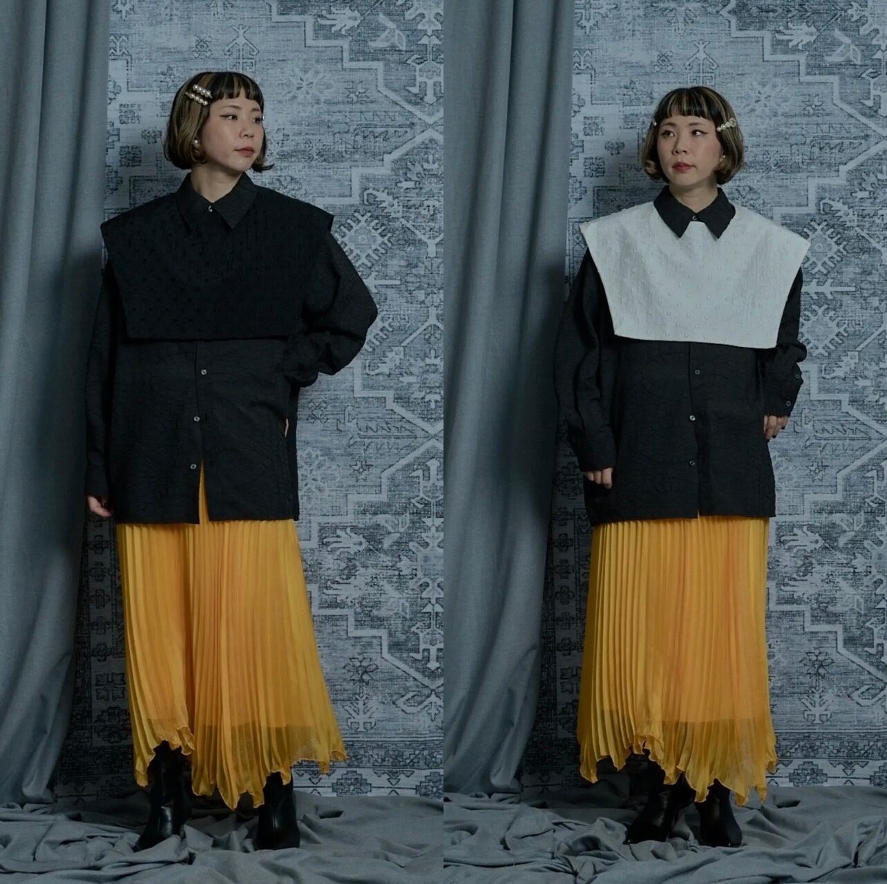 ひとつのアイテム、トップスやボトムを買うよりも、実はとても楽しめる1枚です。Tシャツを購入する感覚で色々なアレンジが楽しめるのは魅力ではないかと思います。今回のコレクションは、毎回悩まれる方が多い為、いつもよりプラスワンアイテムを少なくしています。ラッフルドポケットベスト、またはこちらのつけ襟、どちらかあると楽しめるかもしれません。
