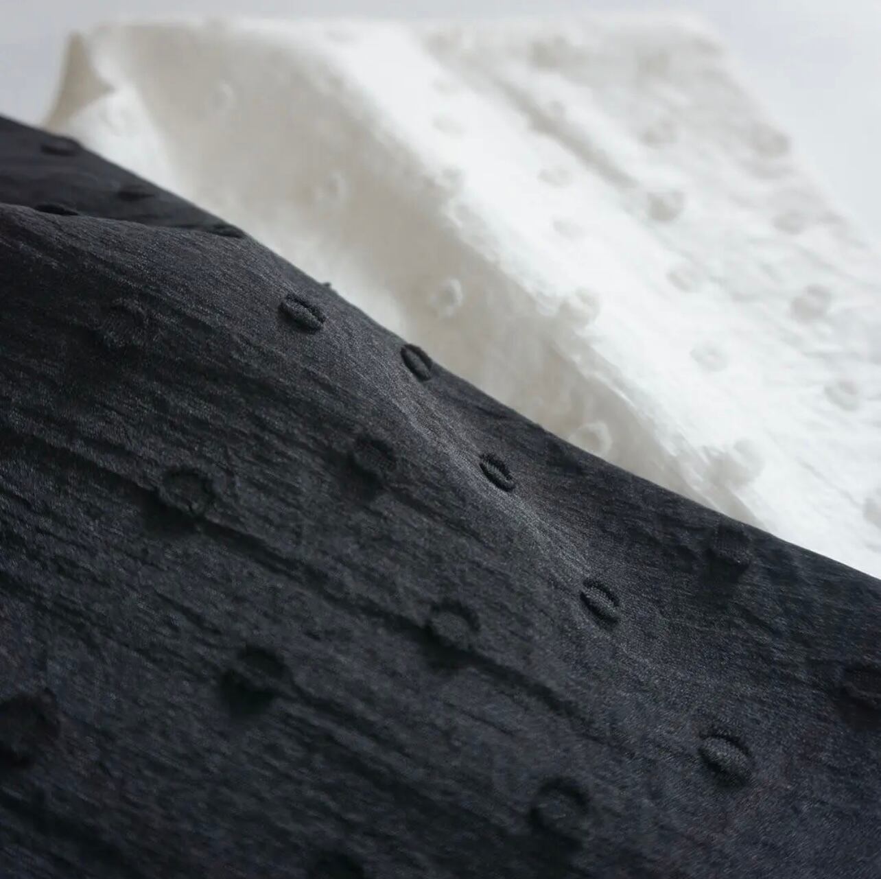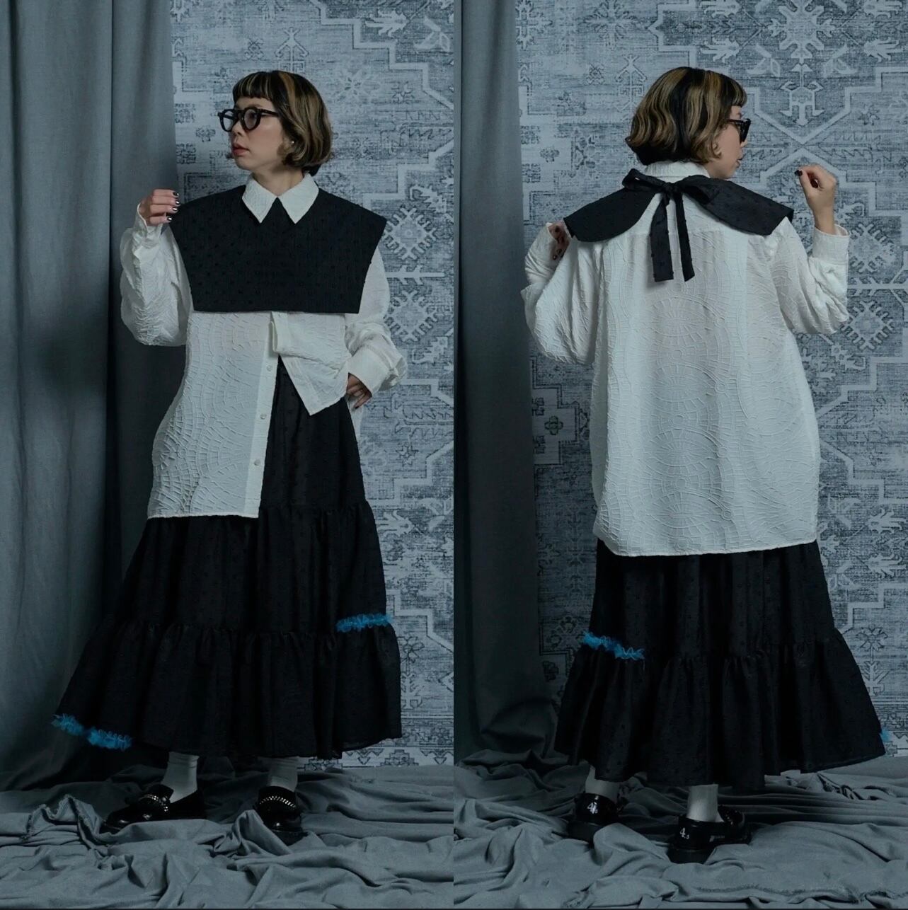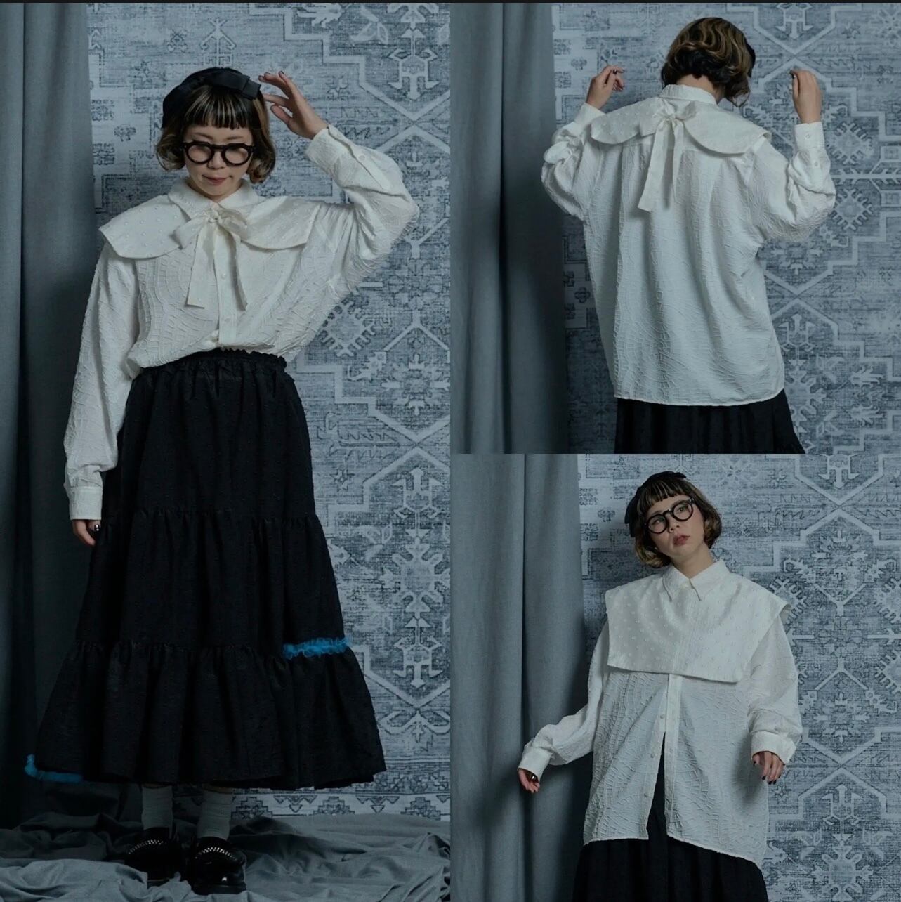 ひとつのアイテム、トップスやボトムを買うよりも、実はとても楽しめる1枚です。Tシャツを購入する感覚で色々なアレンジが楽しめるのは魅力ではないかと思います。今回のコレクションは、毎回悩まれる方が多い為、いつもよりプラスワンアイテムを少なくしています。ラッフルドポケットベスト、またはこちらのつけ襟、どちらかあると楽しめるかもしれません。
