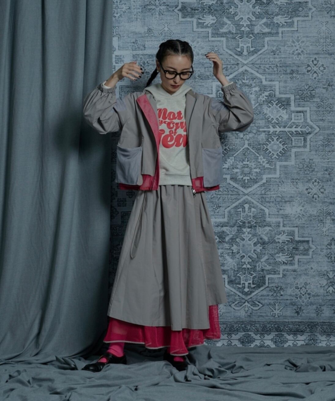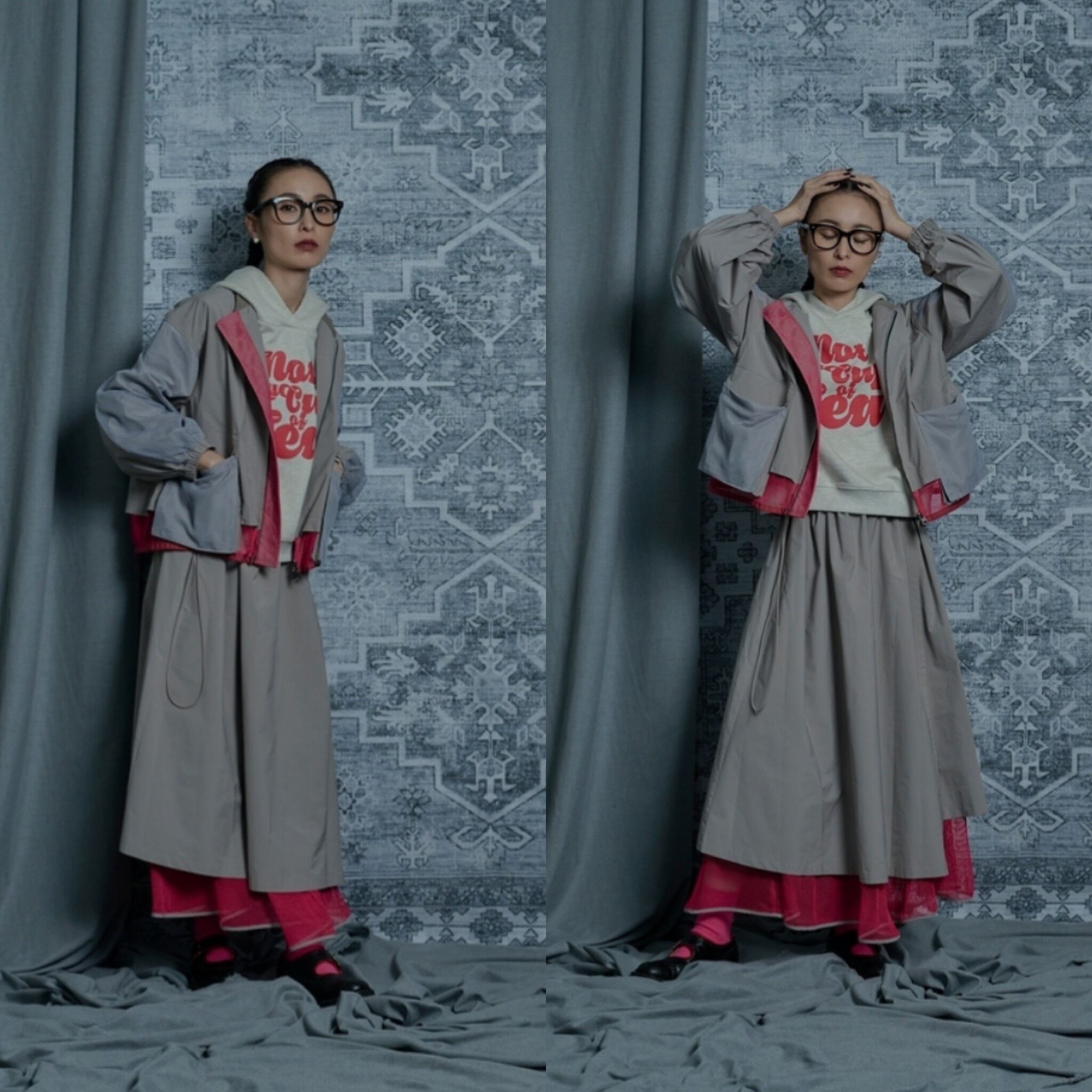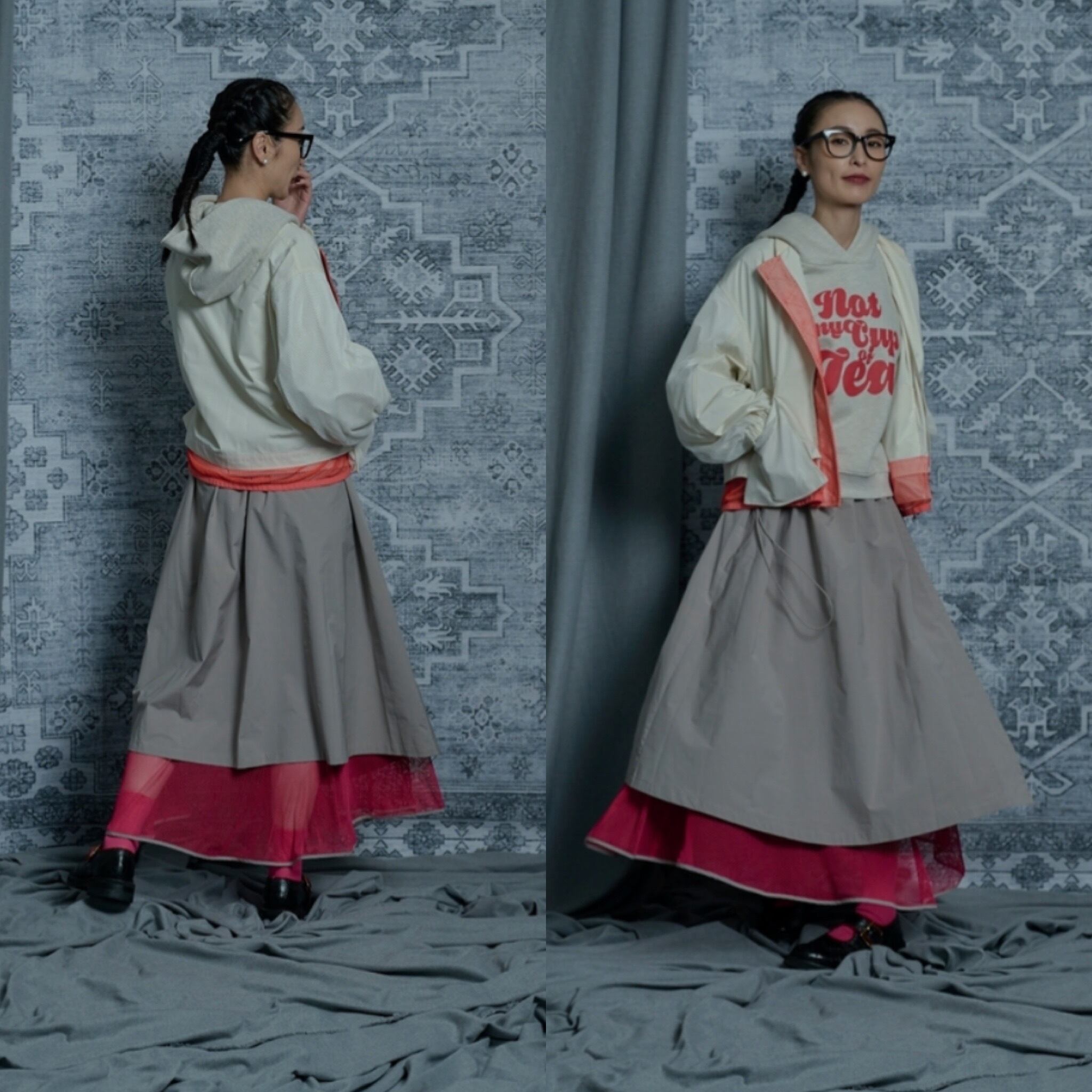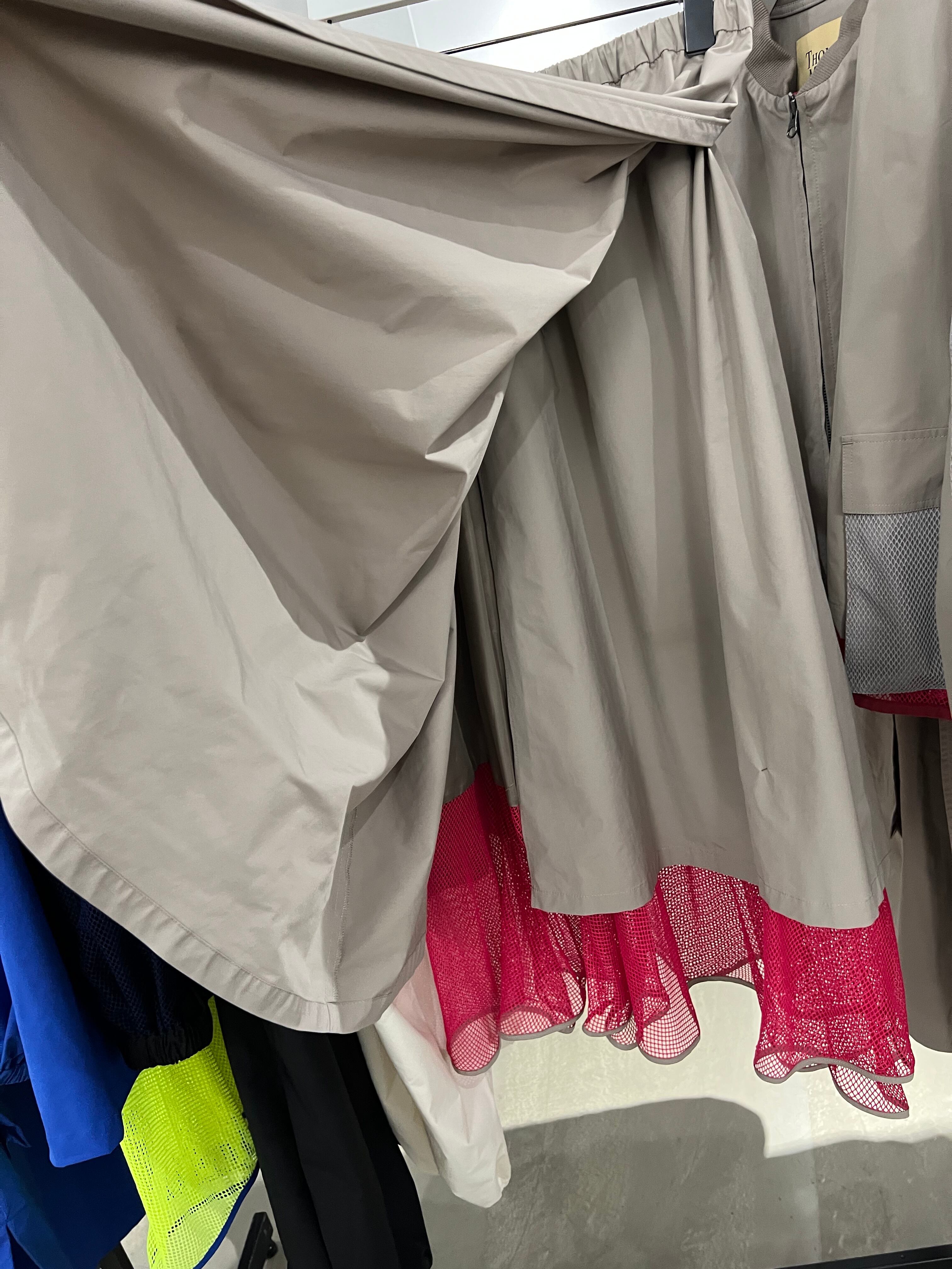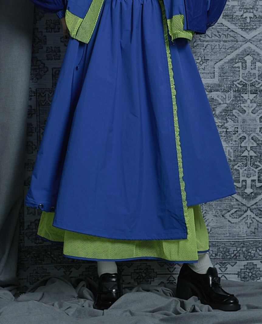 巻きスカート風になっていて、ブルゾン、コートとセットアップも可能です。(はだける事はありません)
