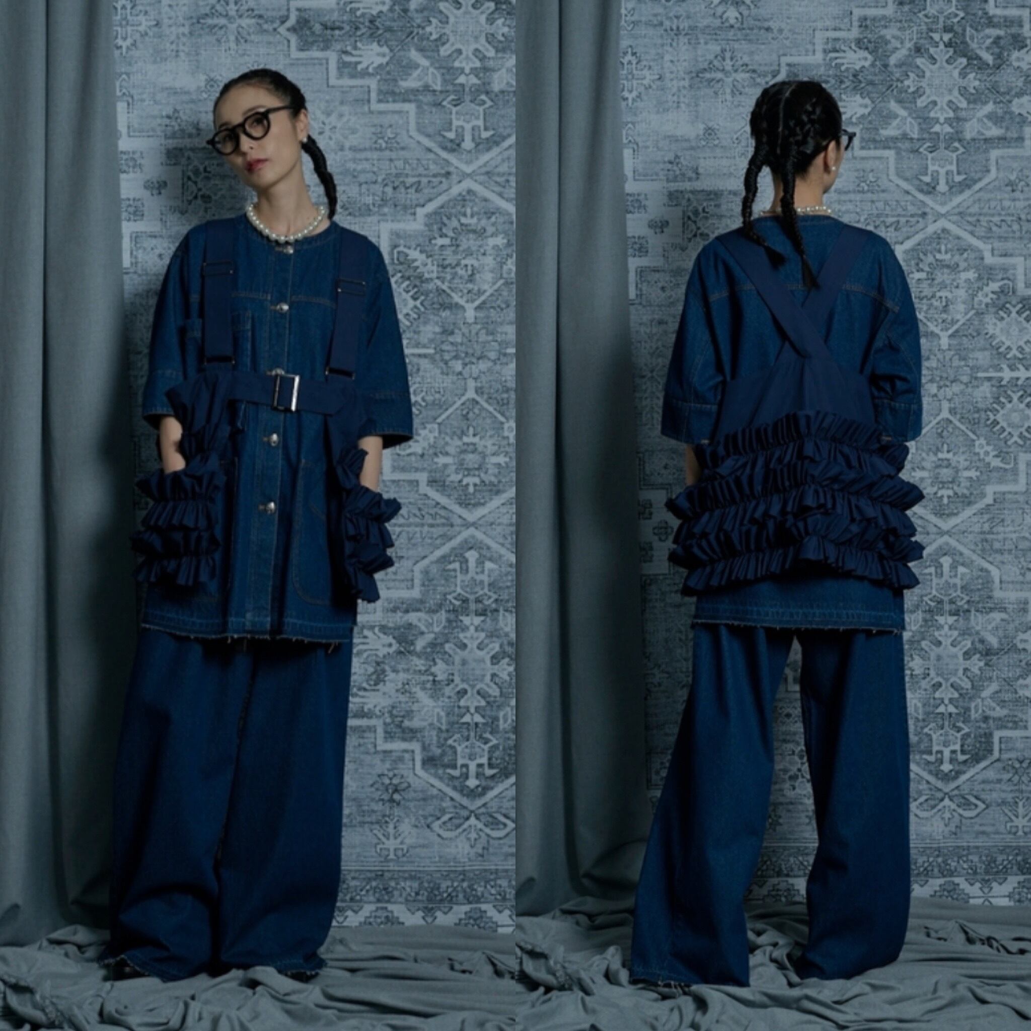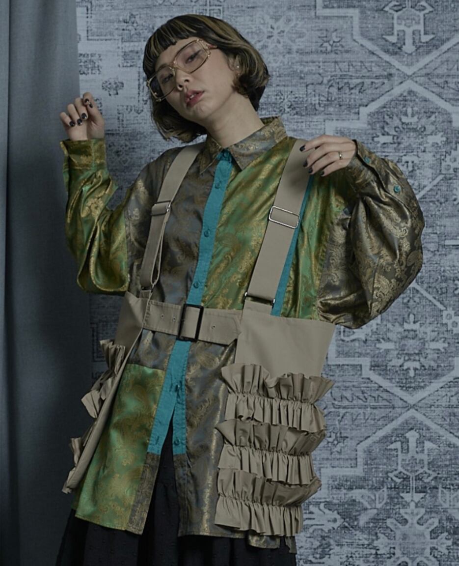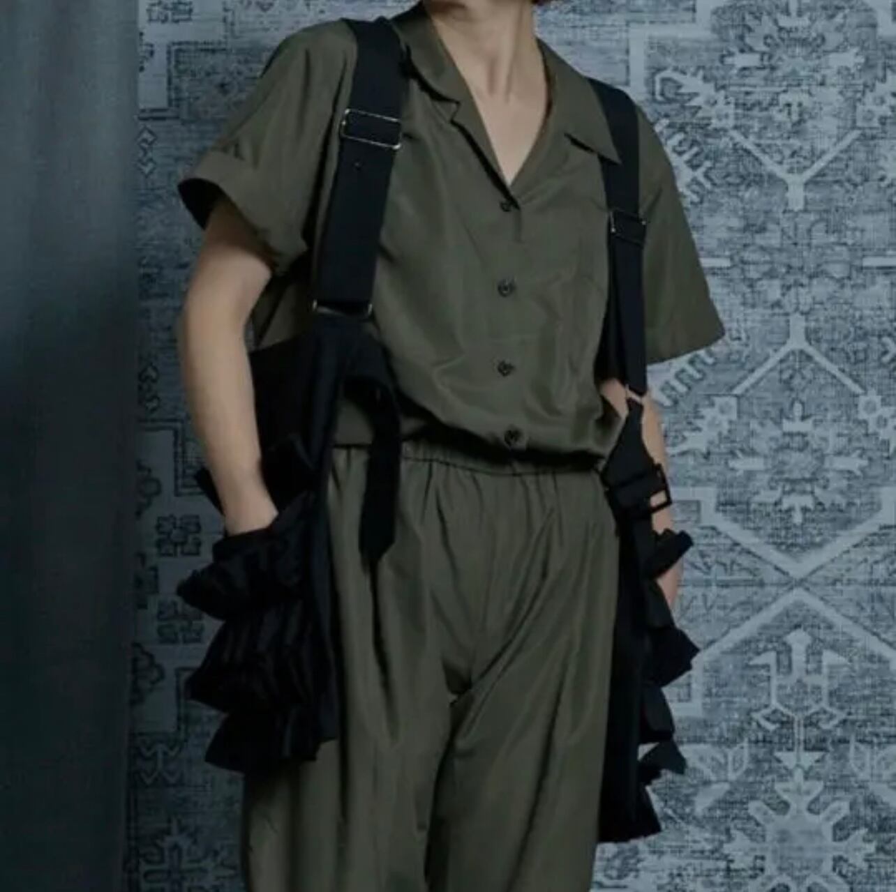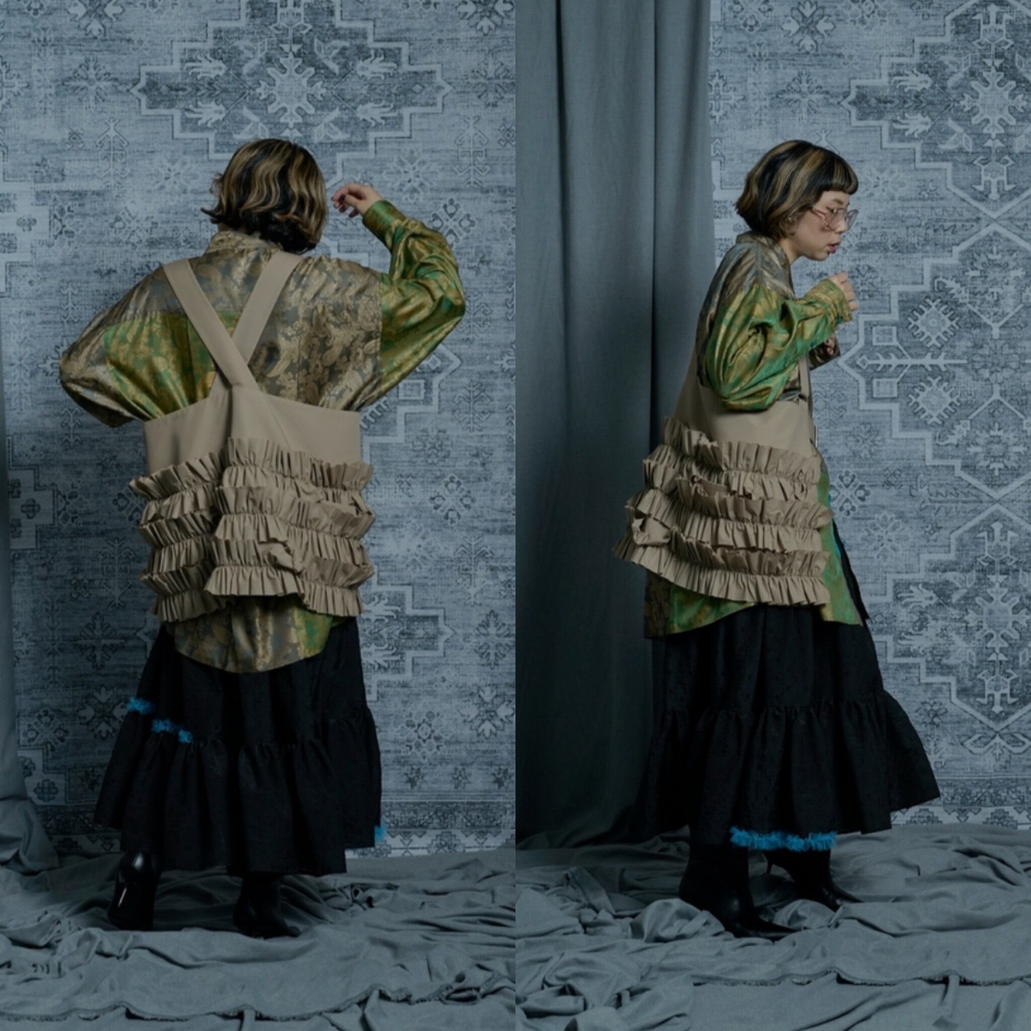 生地は芯をしっかりと貼って仕上げています。胸のベルトでサイズも調節ができます。シンプルなシャツやTシャツなどあらゆるお洋服に加えると変化ができ、楽しめる1枚になると思います。フリル部分に隠しポケットが付いています。なのでポケットのないワンピースやスカートに合わせて着ると、ポケットとしても便利に使うことが出来るようにしました。白いTシャツとロングスカートなどに合わせてみてください。コーディネートに華やぎが出ると思います。普通のお洋服の着方に飽きてきたという方にぜひ。オーバーサイズでTシャツの上に着たり、コートの上からでも羽織る事が出来て味付けするのに本当に楽しめる1枚です。