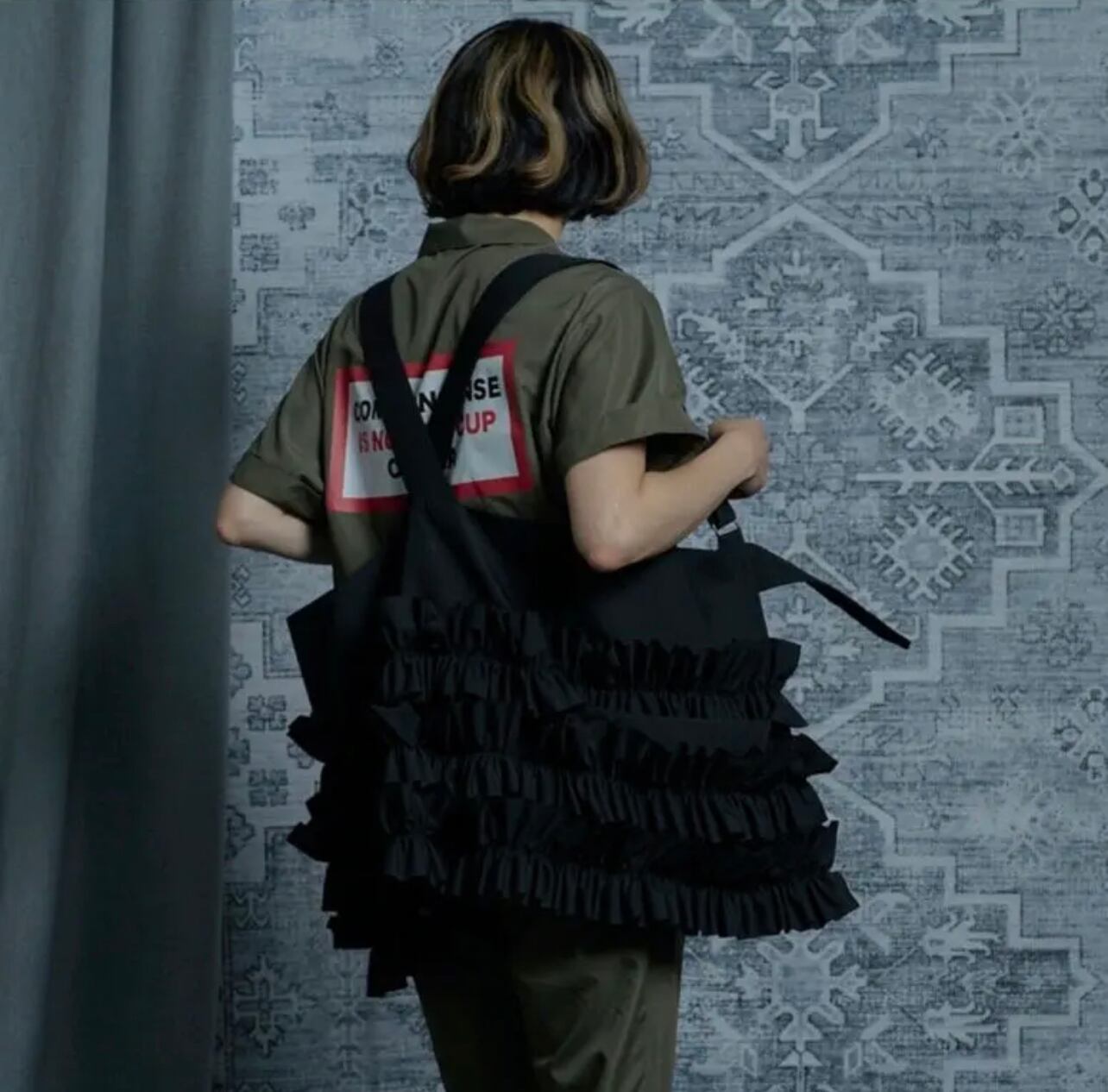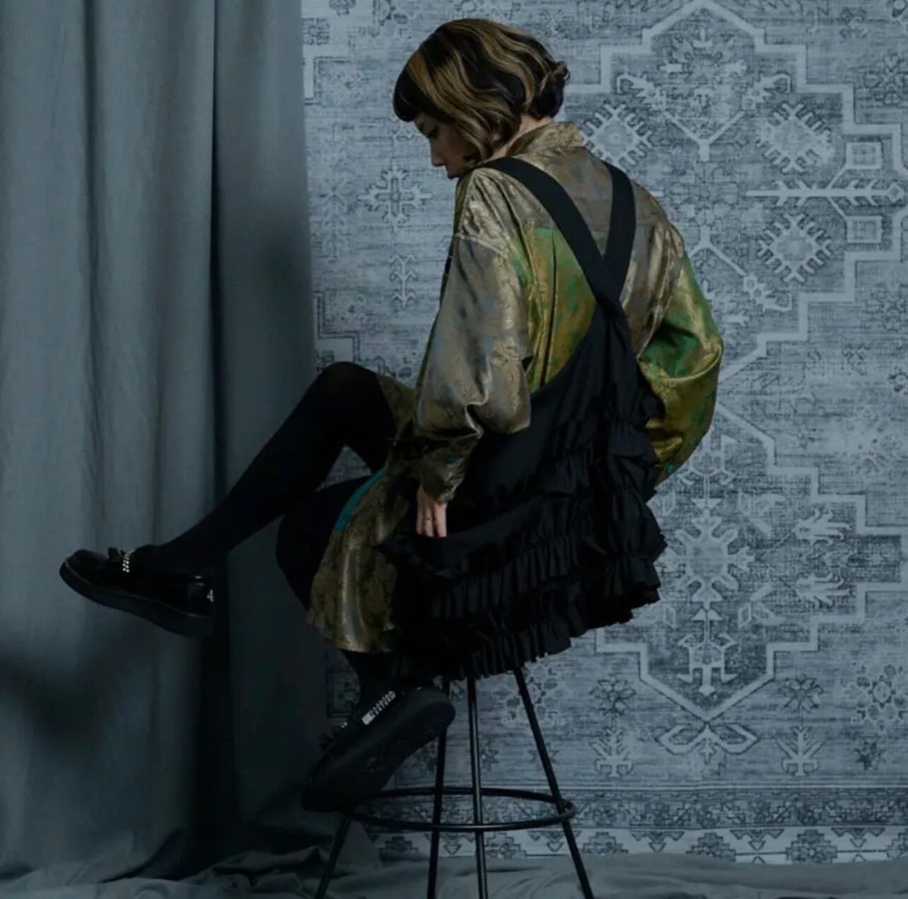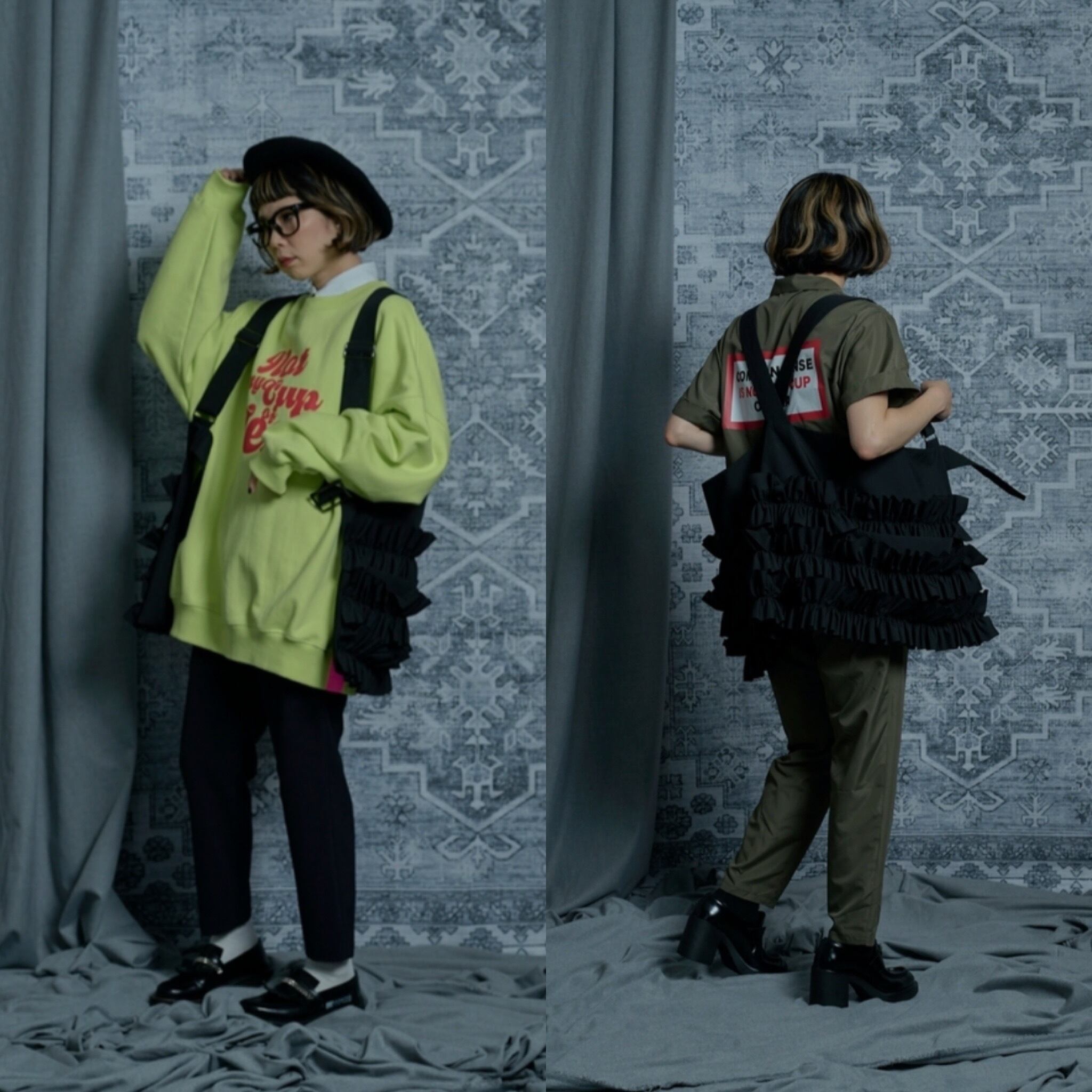 生地は芯をしっかりと貼って仕上げています。胸のベルトでサイズも調節ができます。シンプルなシャツやTシャツなどあらゆるお洋服に加えると変化ができ、楽しめる1枚になると思います。フリル部分に隠しポケットが付いています。なのでポケットのないワンピースやスカートに合わせて着ると、ポケットとしても便利に使うことが出来るようにしました。白いTシャツとロングスカートなどに合わせてみてください。コーディネートに華やぎが出ると思います。普通のお洋服の着方に飽きてきたという方にぜひ。オーバーサイズでTシャツの上に着たり、コートの上からでも羽織る事が出来て味付けするのに本当に楽しめる1枚です。