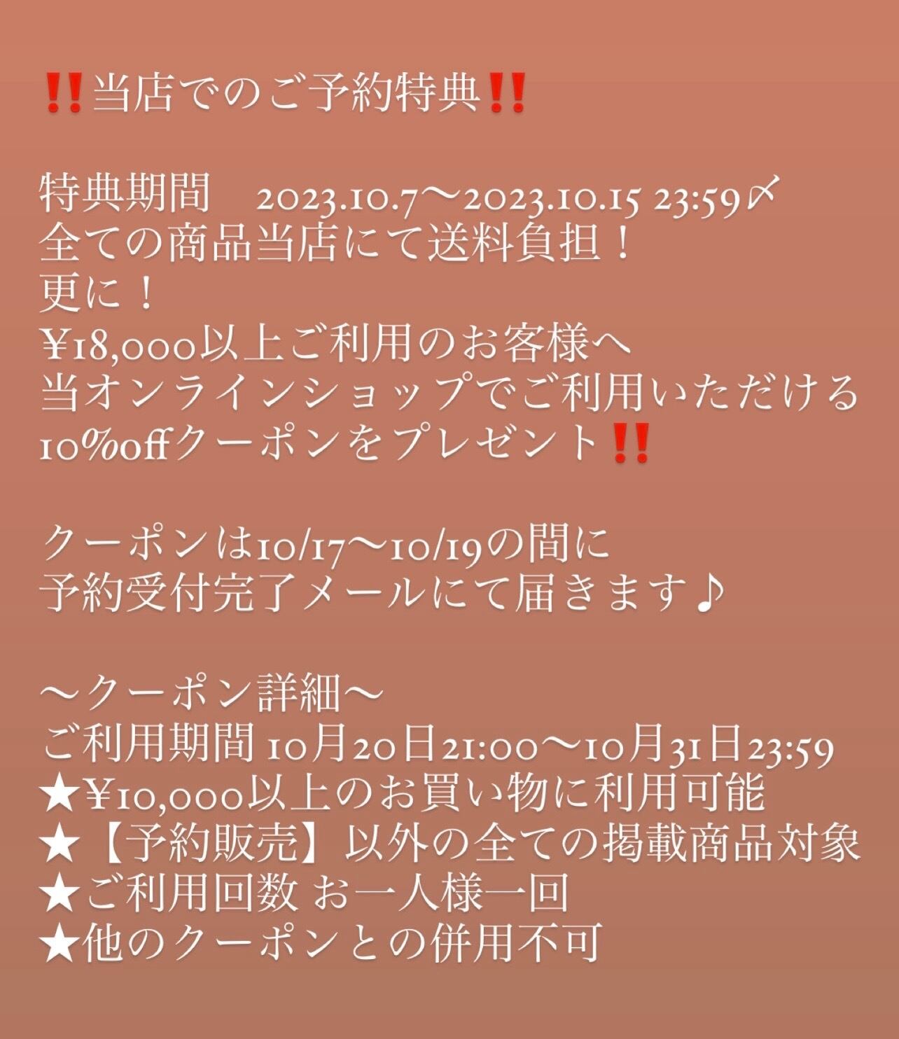 ¥18,000以上ご利用のお客様へ当オンラインショップでご利用いただける10%offクーポンをプレゼント‼️