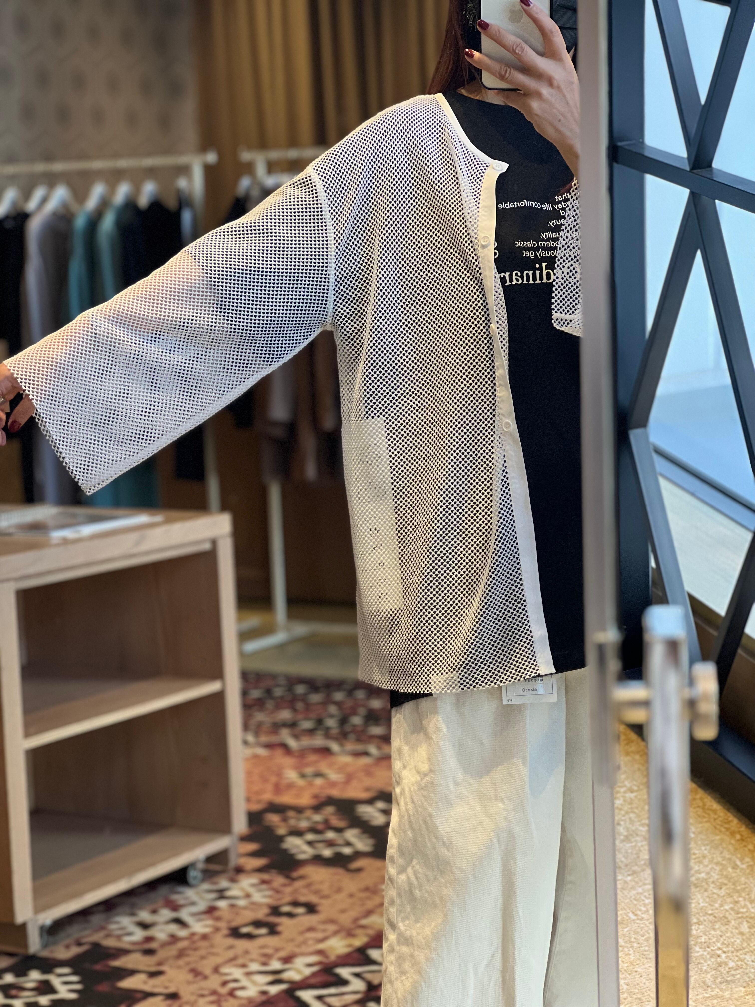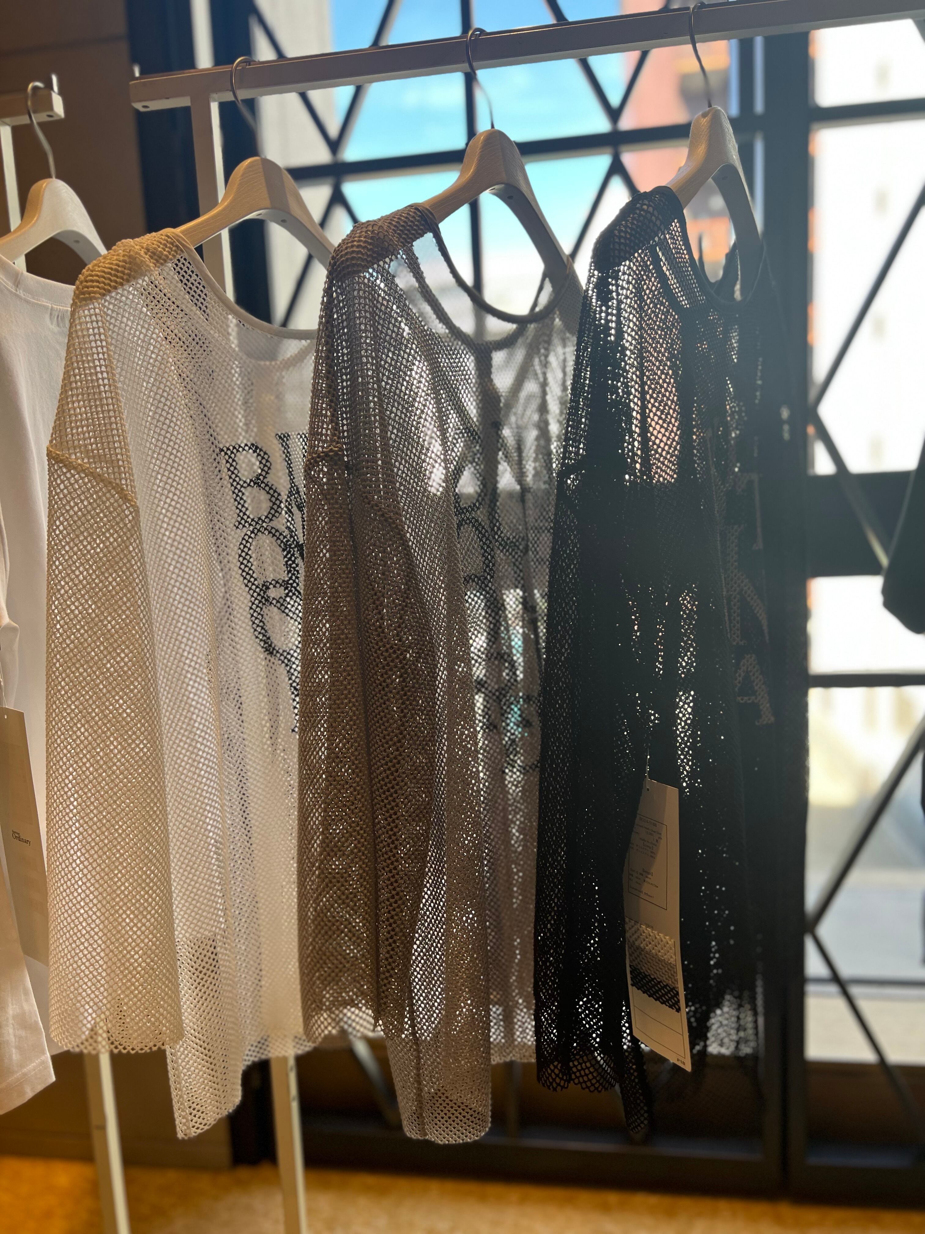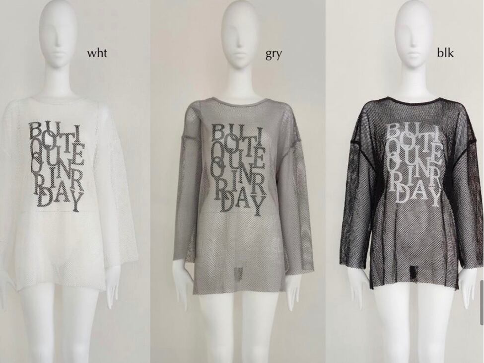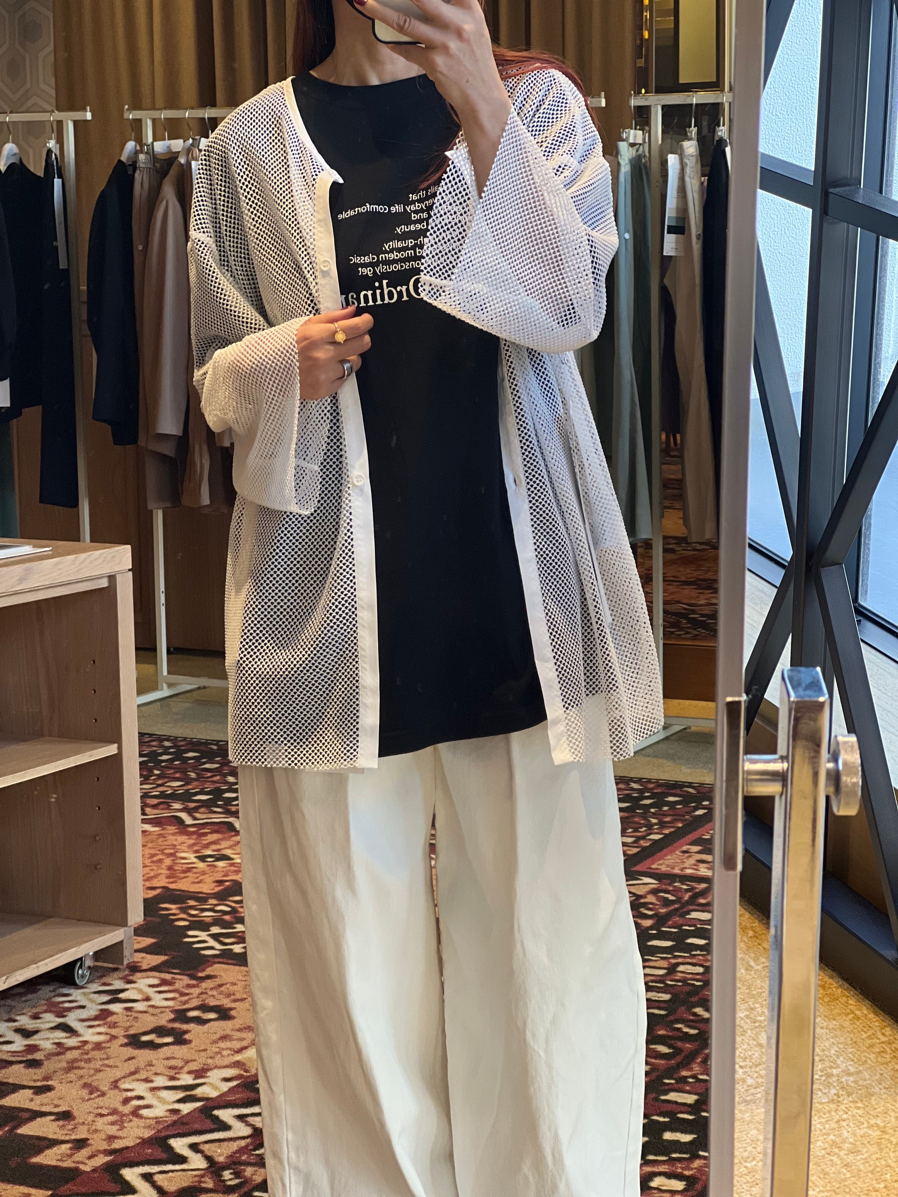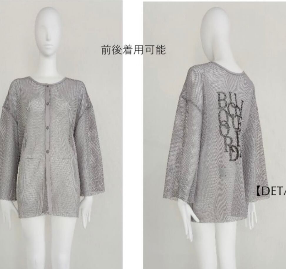 ゆとりのあるワイドな身幅でローゲージニットのような感覚でレイヤードを楽しめるメッシュブラウスです。 前後着用可能で、背中の釦明きを前に持ってくる事で、カーディガン感覚の着こなしも可 能。長めの袖丈と着丈がカジュアルな着こなしの中にさりげない女性らしさをプラス。単調 になりがちな春先のコーディネートの幅を広げてくれます。フロントには人気好評中のブラ ンドロゴをランダムに並べたタイポプリントを配置。