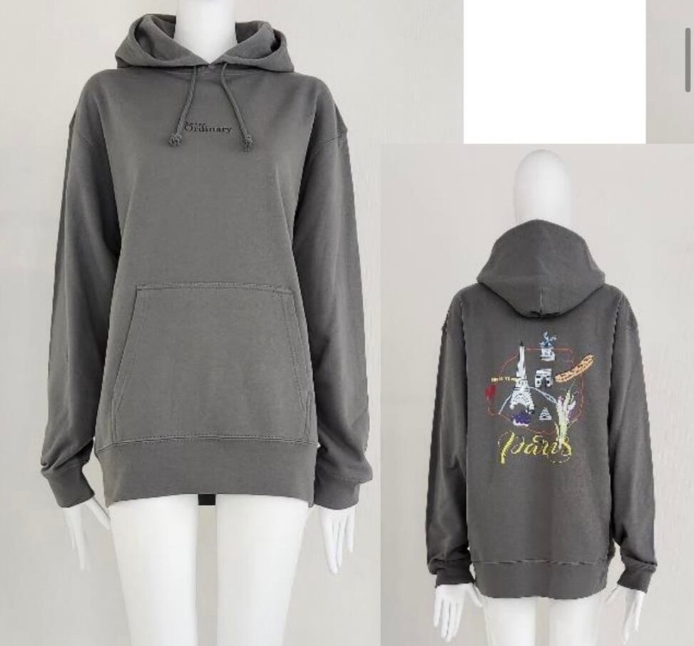 Boutique Ordinaryから今シーズンリリースするスーベニアhoodieは、レイドバックなゆった りとしたサイズ感で、エスプリの効いたグラフィックデザインが特徴。フロントにはブランドロゴをプリントしたシンプルなデザイン、背中にはParisの街をデザインしたグラフィック を配置しています。