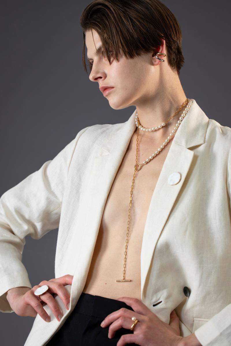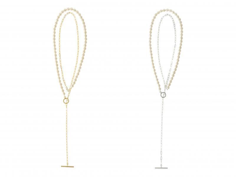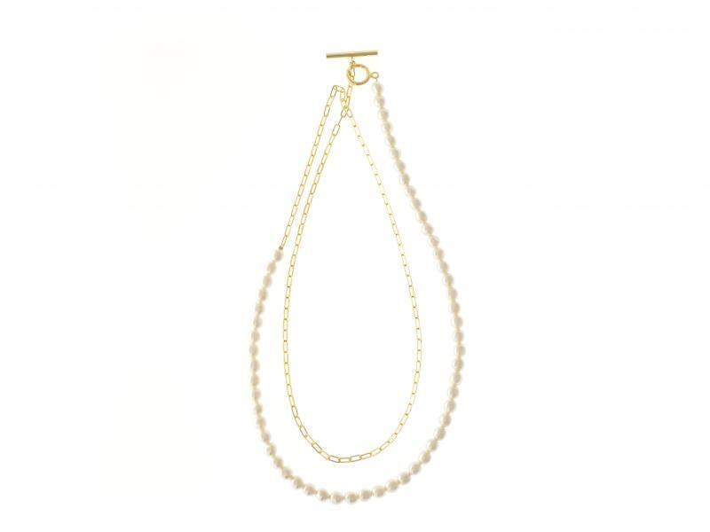 相反する素材の真鍮とパールを組み合わせたネックレス