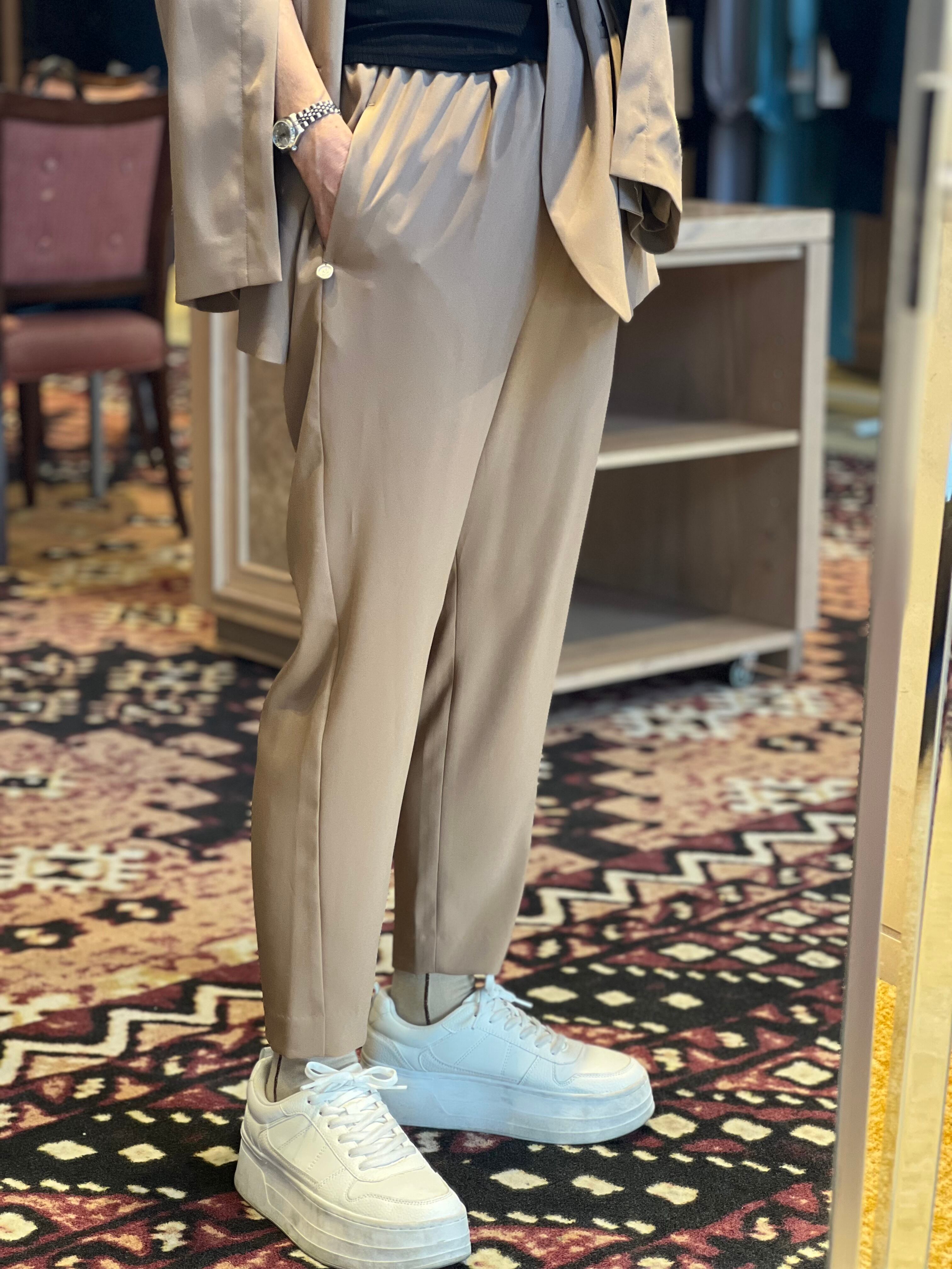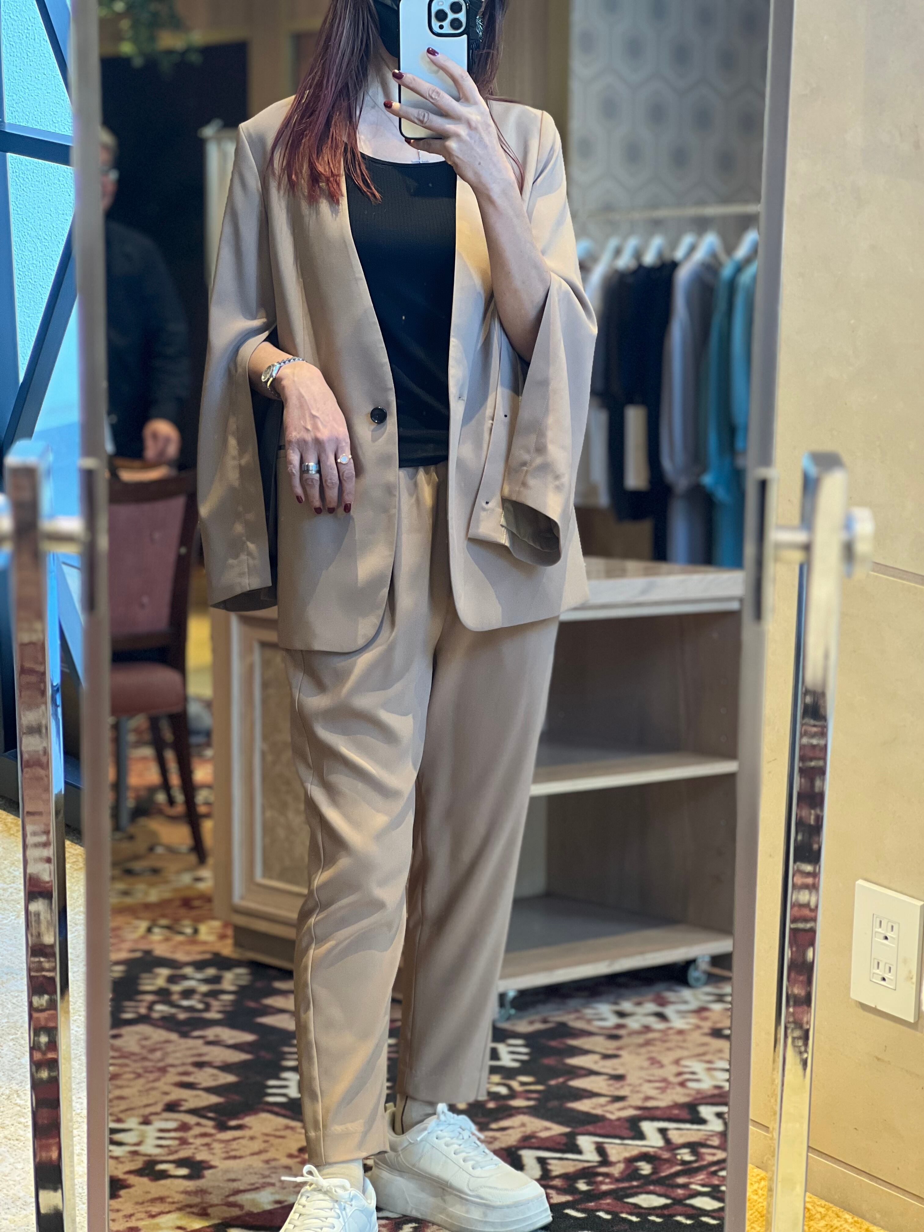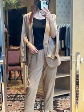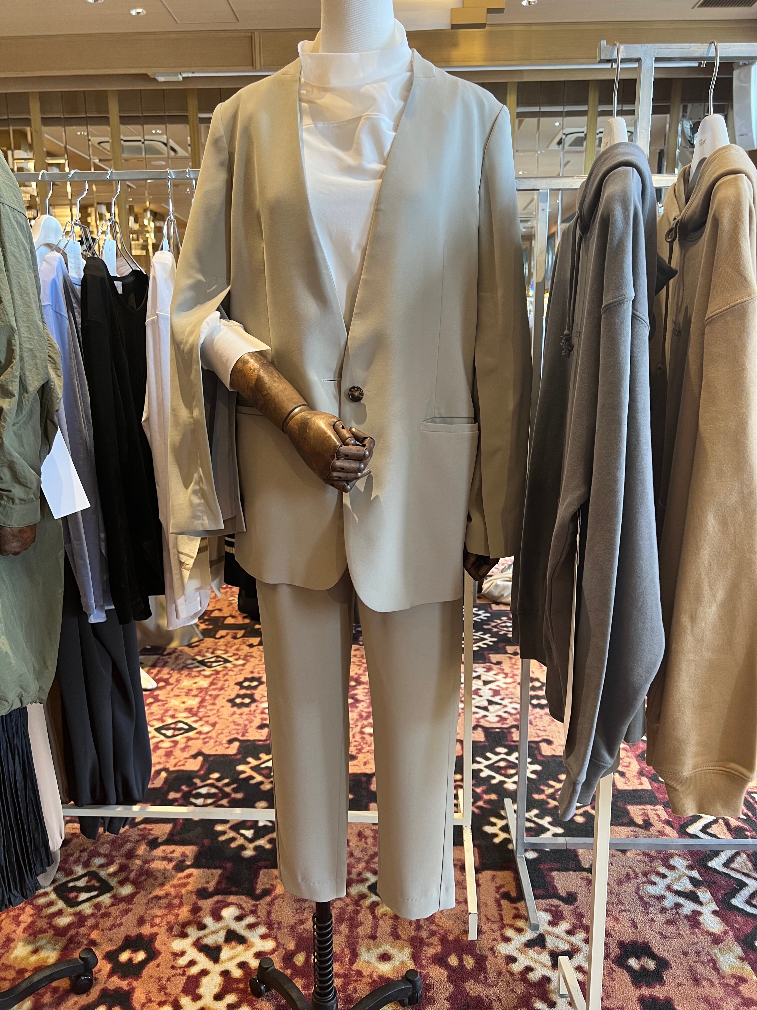 キレイ見えと美脚にこだわり、モード感を高めてくれるギャザーテーパードパンツ。ウエスト切り替えにサテン地を用いることで、ドレスパンツ仕様に。ウエスト部分を内側に折り込んで知で留めることで、ベルトレスなシンプルなギャザーパンツに早変わり。リラックスしすぎないキレイめなシルエットで着心地が良く、通勤などきちんと見せたいシーンからデイリーなカジュアルまで幅広く活躍します。同素材のジャケットとのコーディネートでオケージョンにも対応。