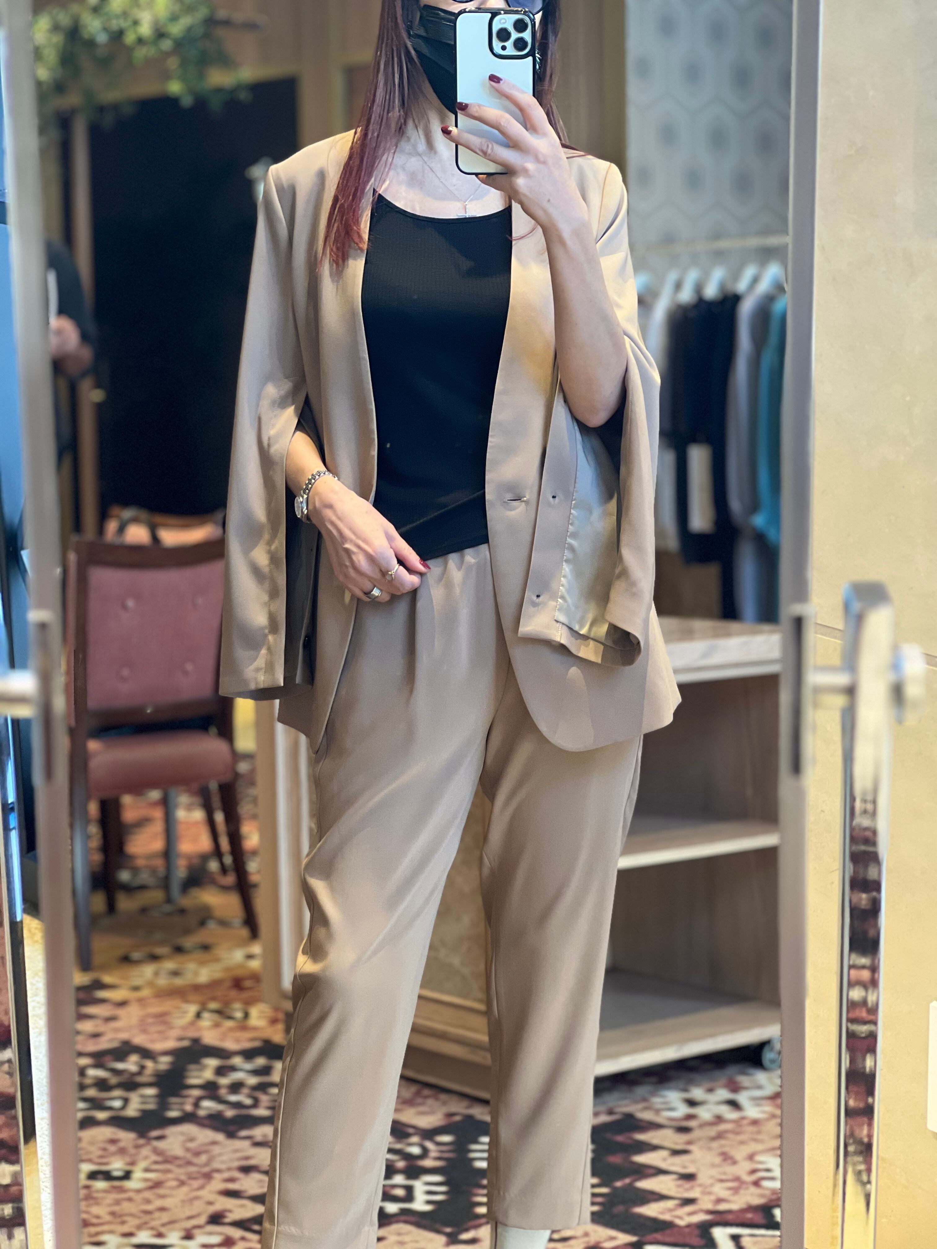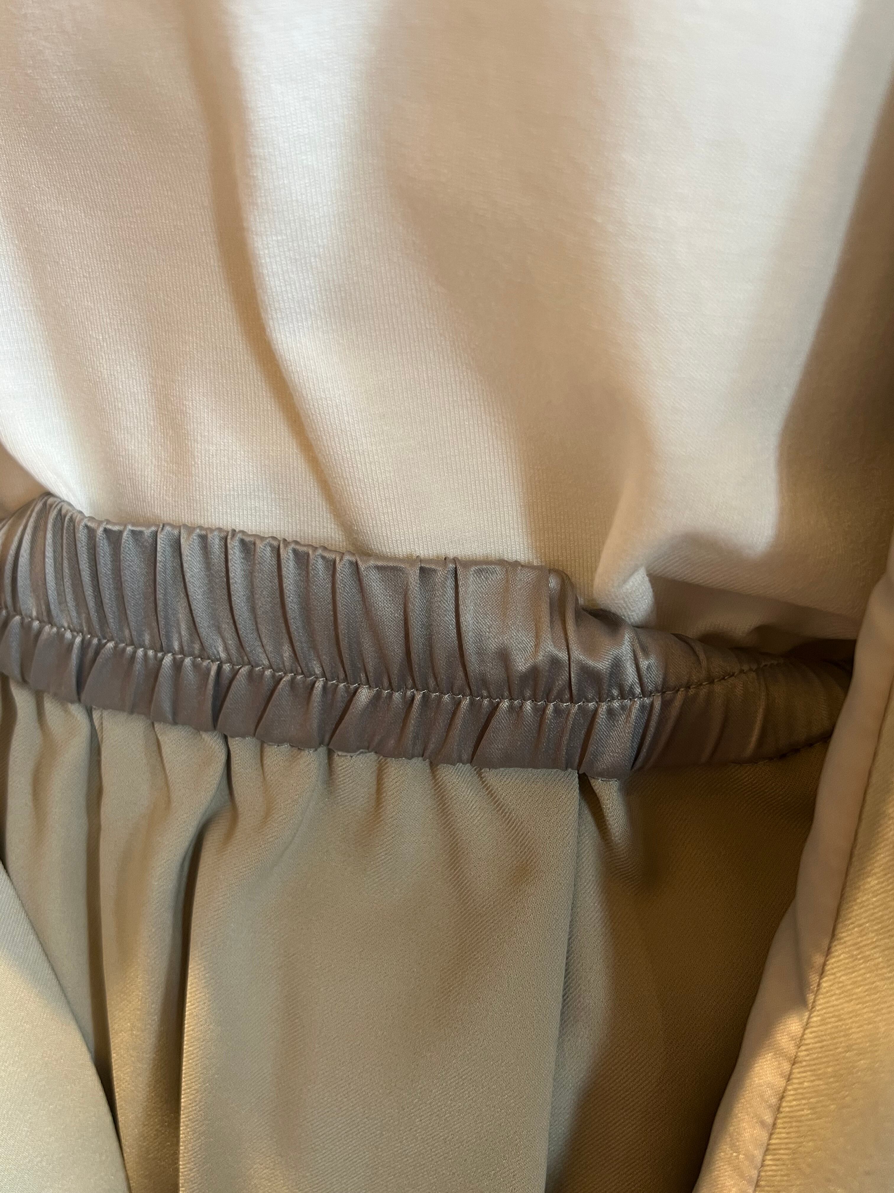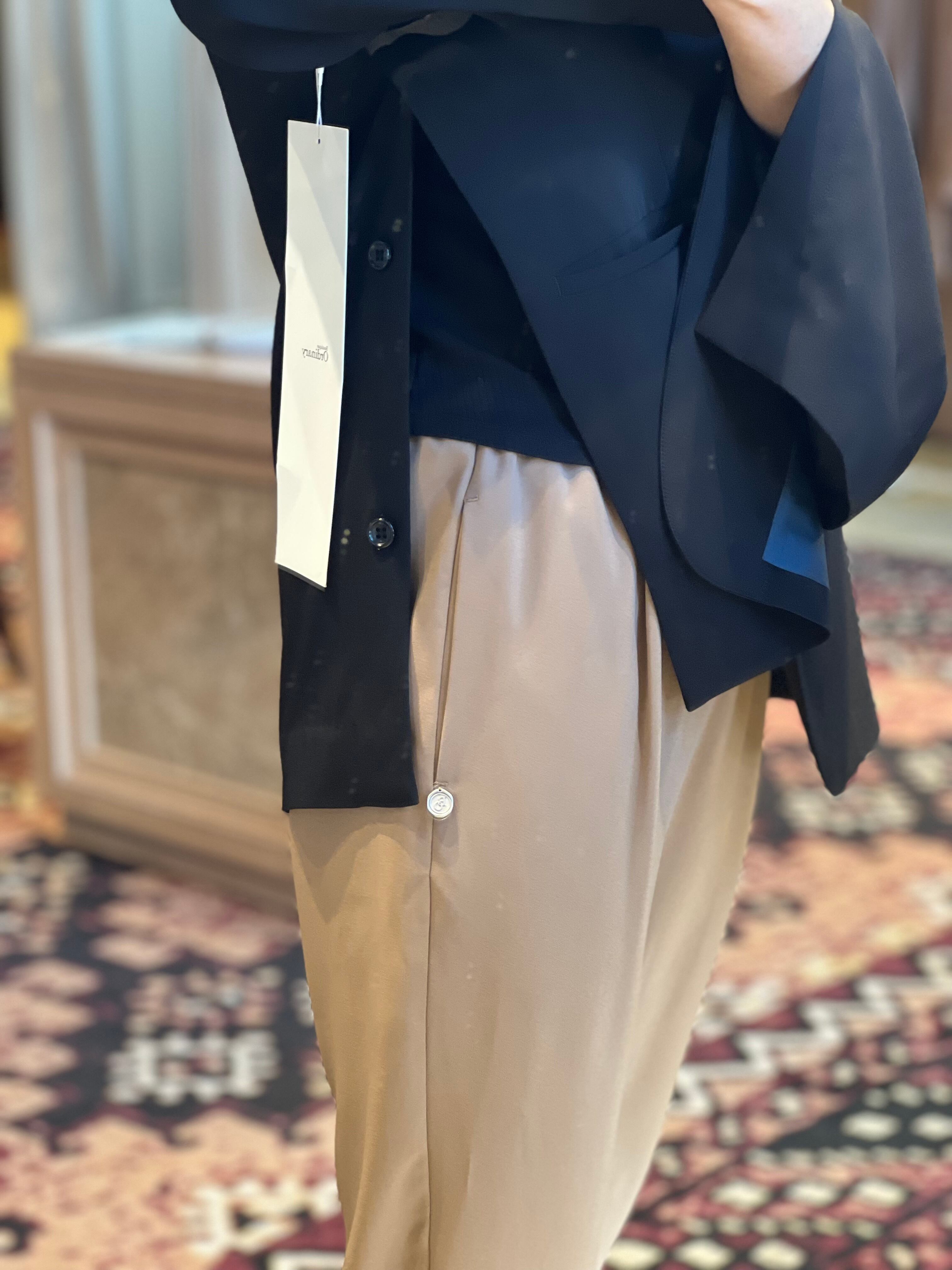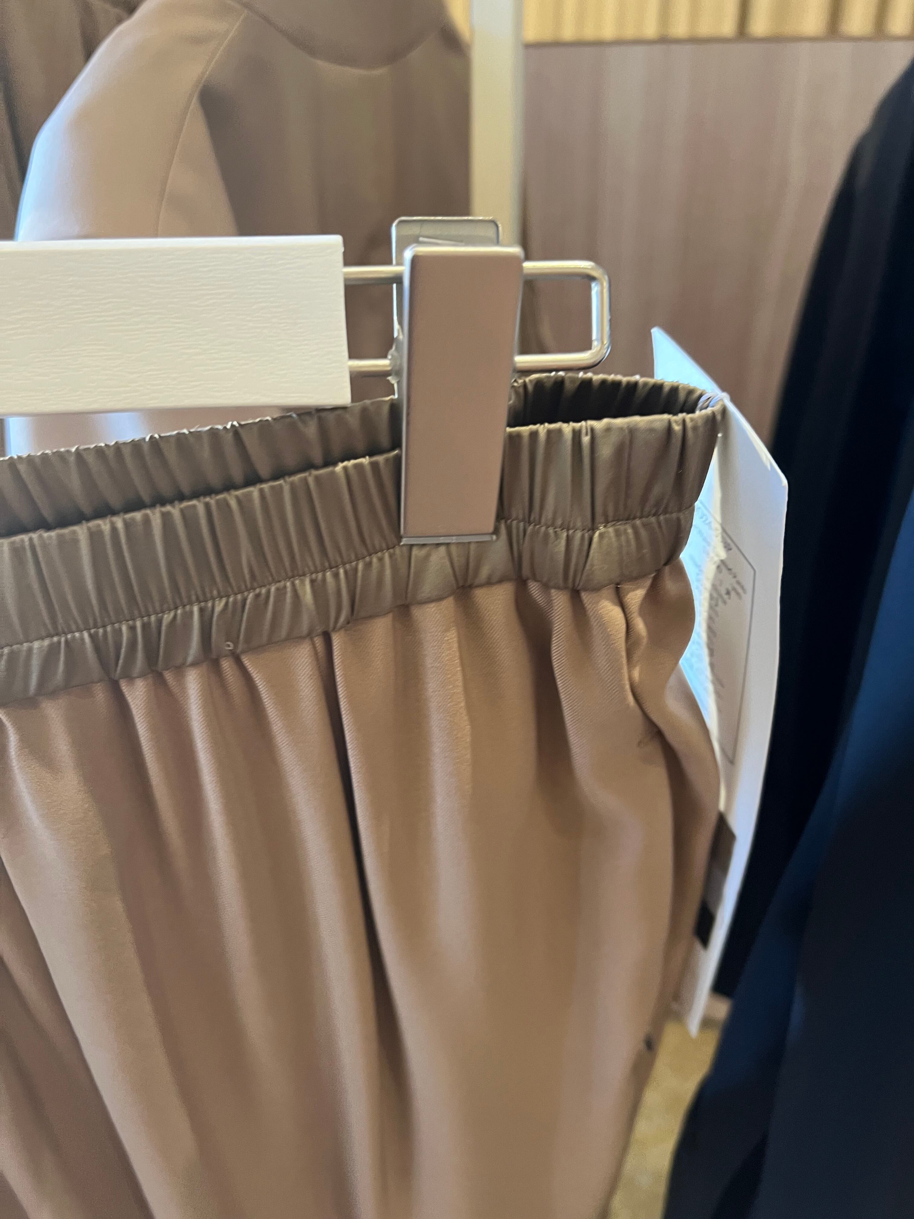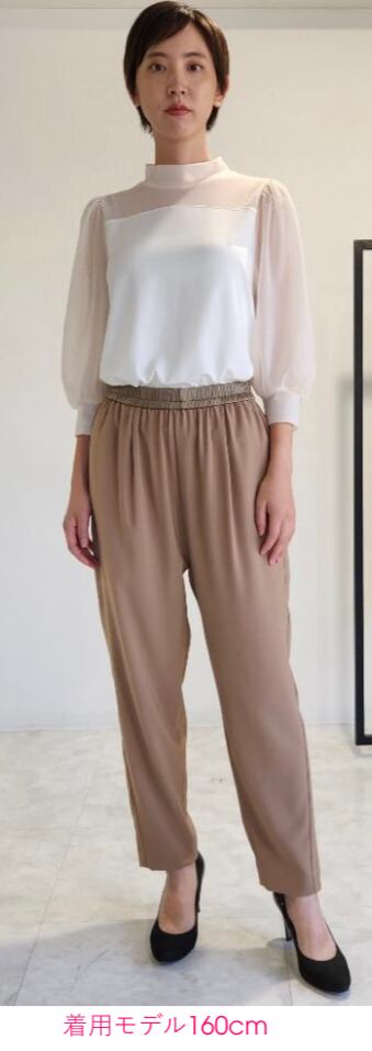軽さがあり、程良い伸縮性とソフトで滑らかな肌触りで快適に過ごせるストレッチ合繊素材を使用。マットで綺麗な表面感ととろみのあるドレープ感が、オン・オフ併用可能で長く着用出来るシーズンレスな素材です。ウエスト部分は上品で控え目な光沢感の同色系サテン地