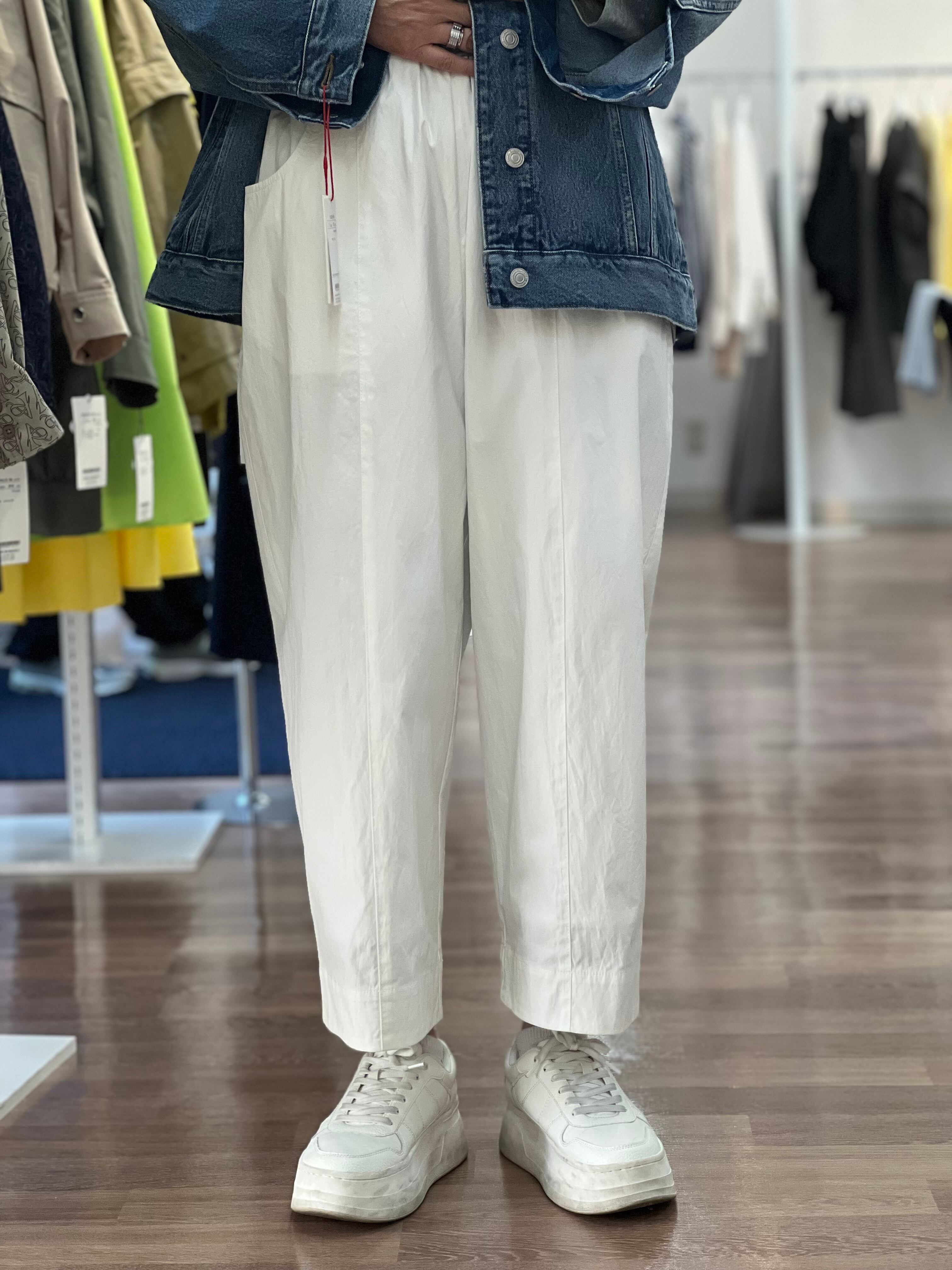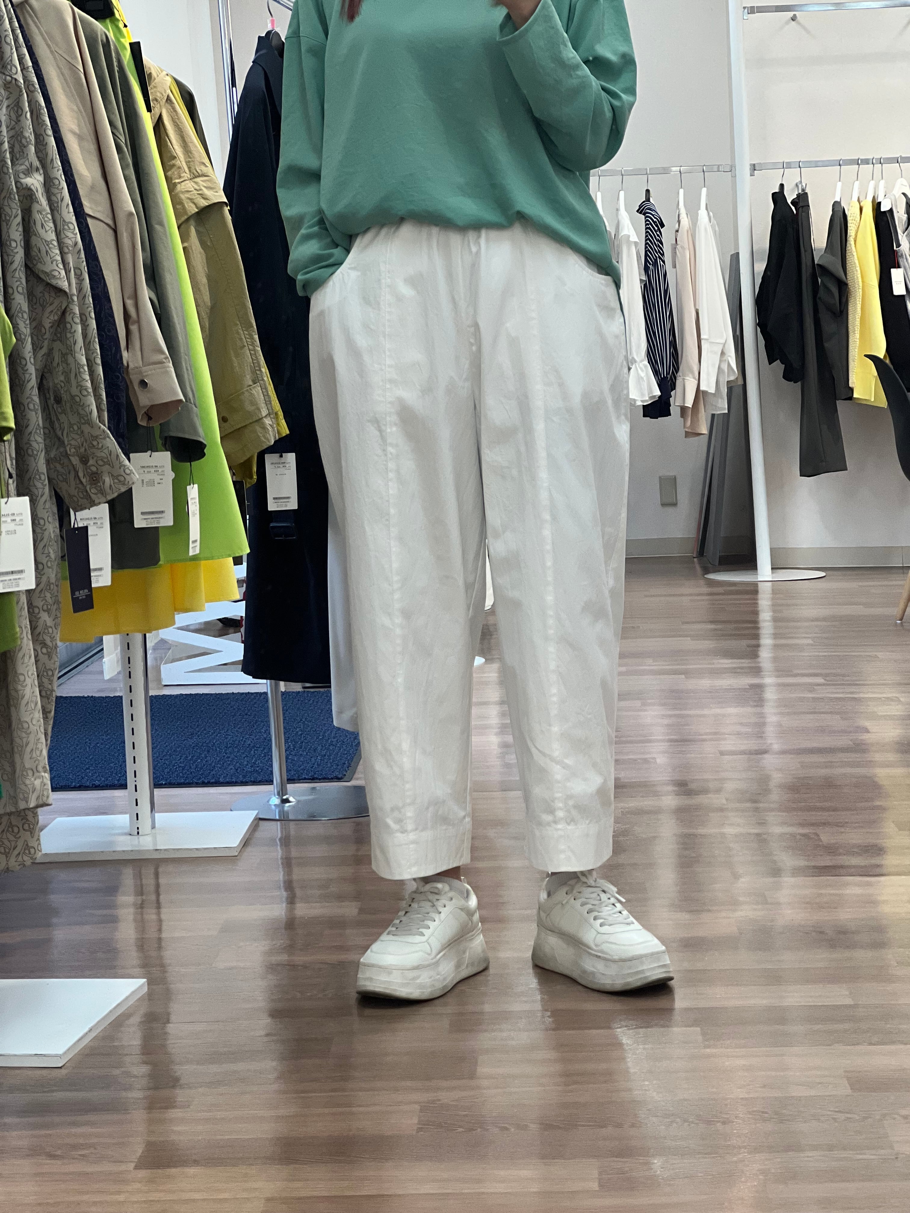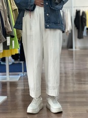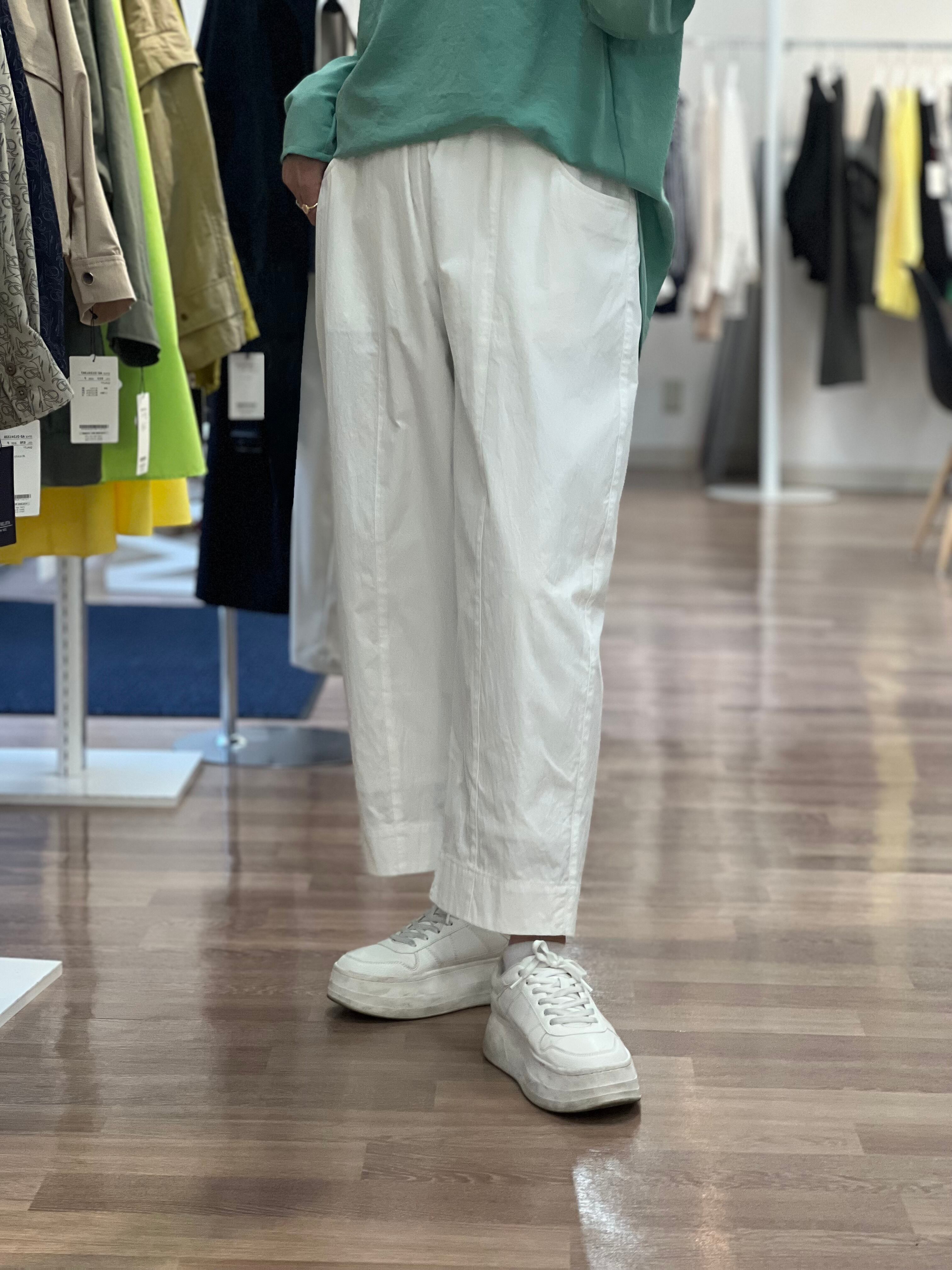 少し張りのある生地感で丈短めで着用設定のパンツです。