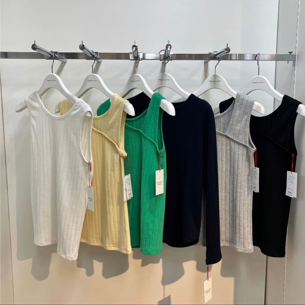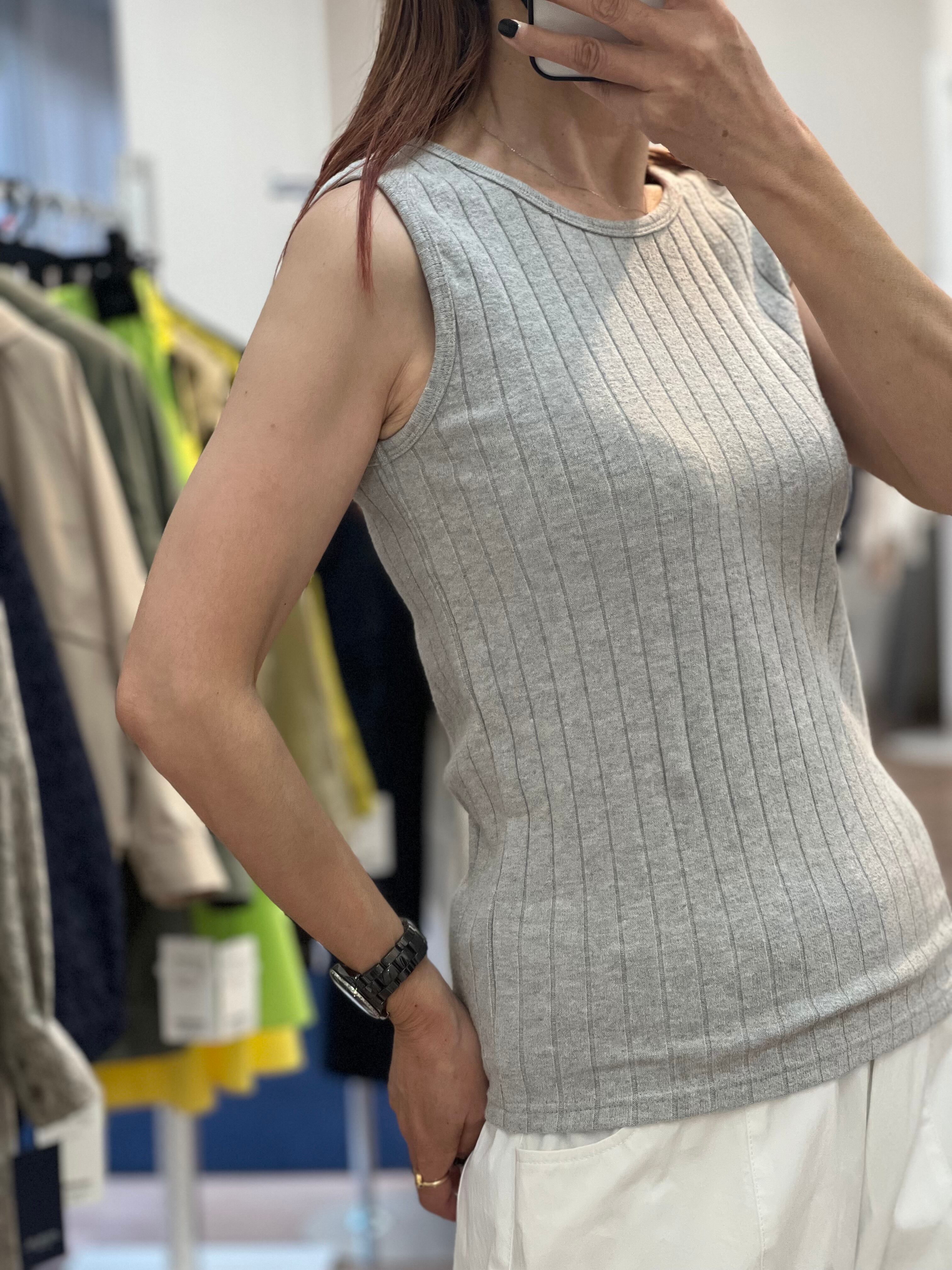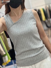 クルーネックとデザインネック、前後着用出来る太めリブのタンクトップです。