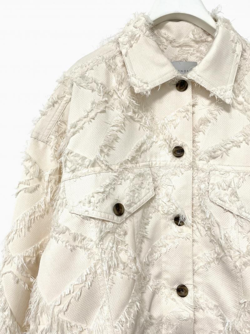 特殊な幾何柄のカットジャガード素材を採用したシャツ型アウターです。