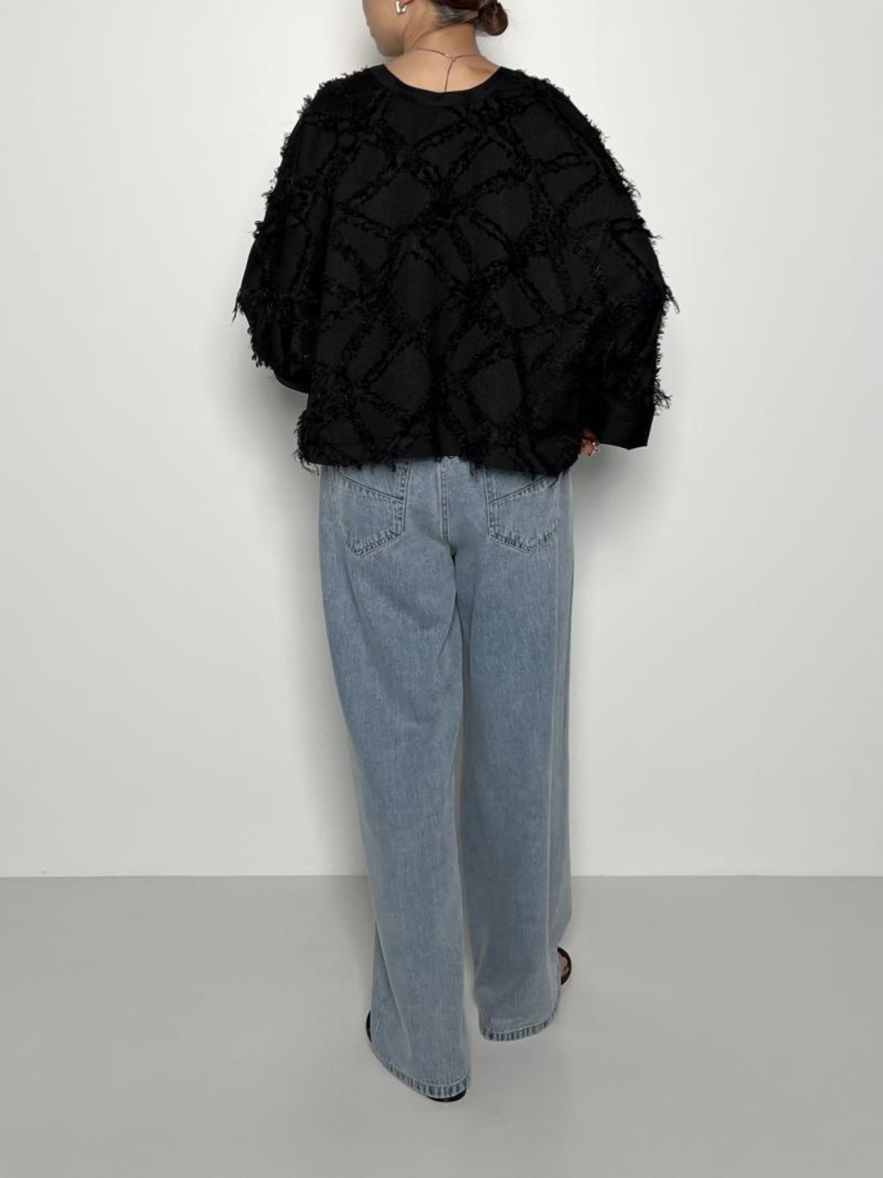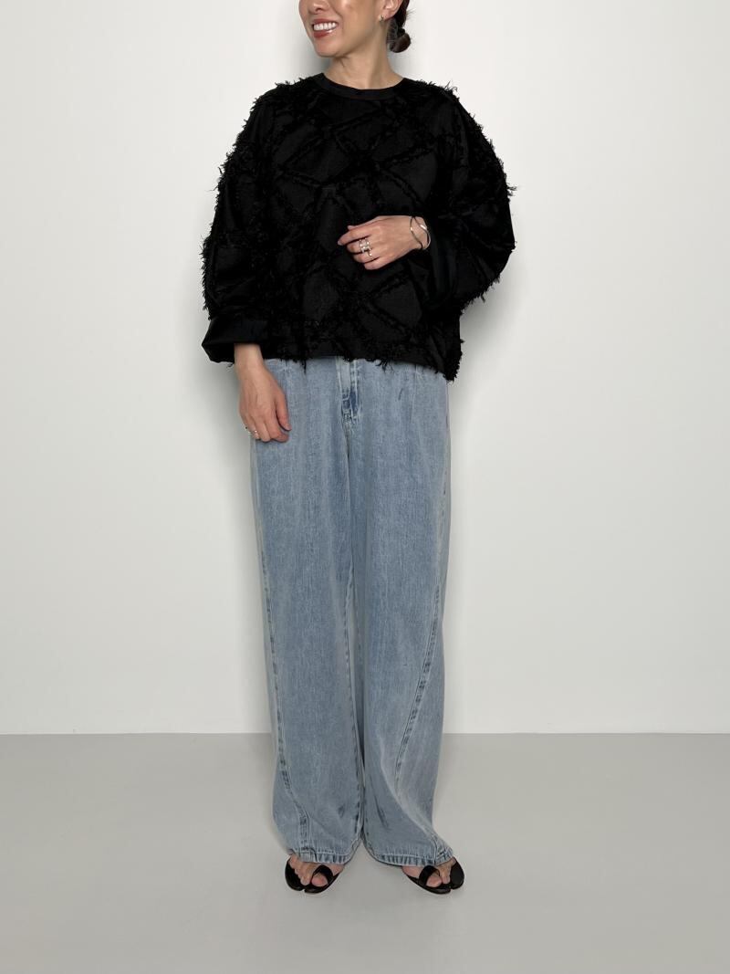 ドルマンスリーブのようにゆったりとしたシルエットとトレンド感のある短丈がポイント。